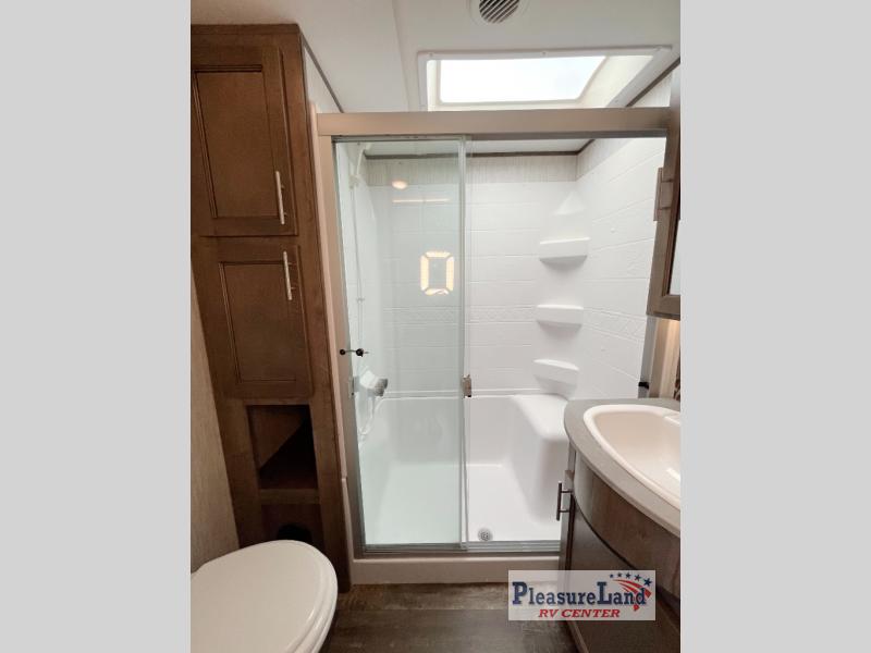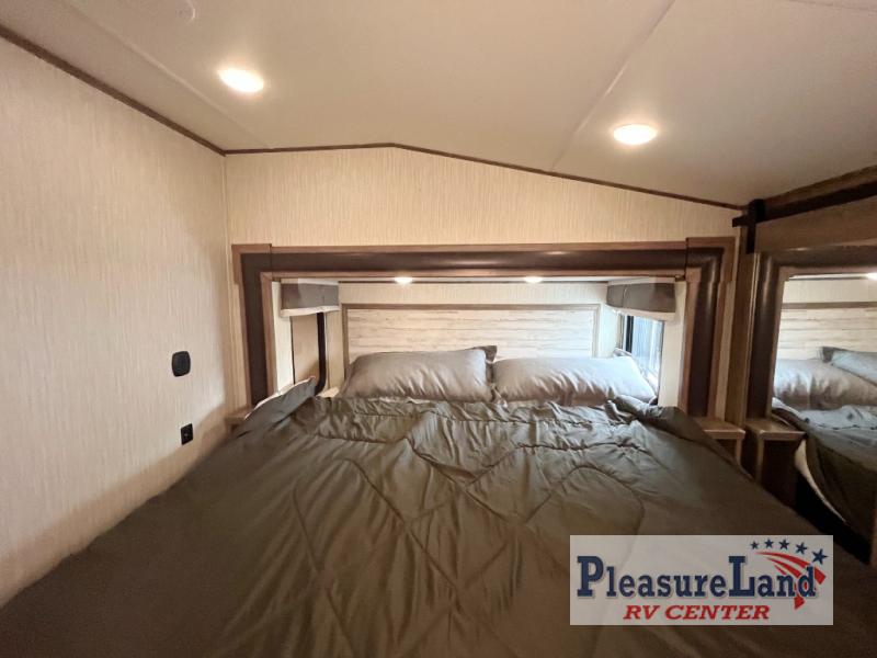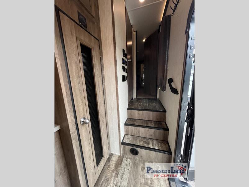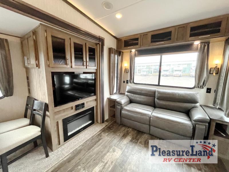 This fifth wheel will have you traveling each chance you get off work. You will find plenty of storage in the full wall wardrobe including a shoe rack, the pantry/coat closet, the overhead cabinets throughout, and along the exterior for your outdoor gear. Just imagine sleeping on your own comfortable queen bed after shopping in town, playing cards with your camping neighbors, or relaxing after a good meal and a glass of wine. You and your friends will have plenty of seating choices including home theatre seats with cupholders while watching the large residential size LED TV and fireplace with remote. Step inside safely on the MORRyde quad steps to find all the kitchen amenities you will need, and a full bathroom with a glass shower enclosure, plus much more!