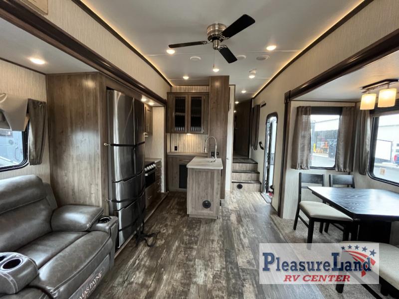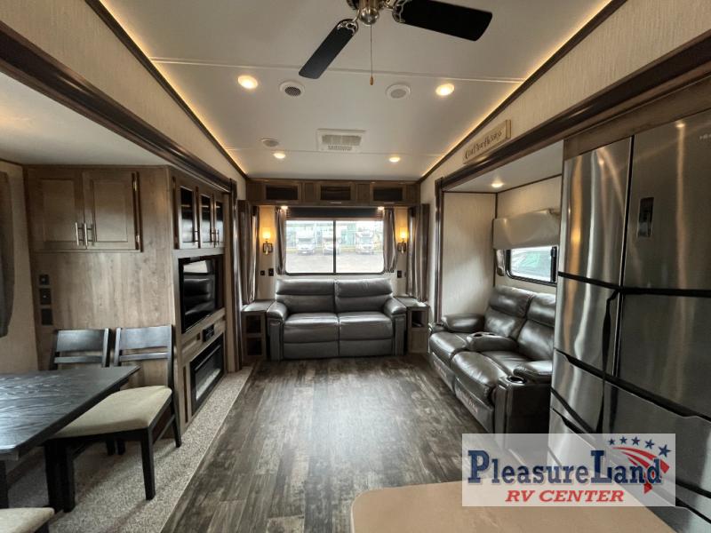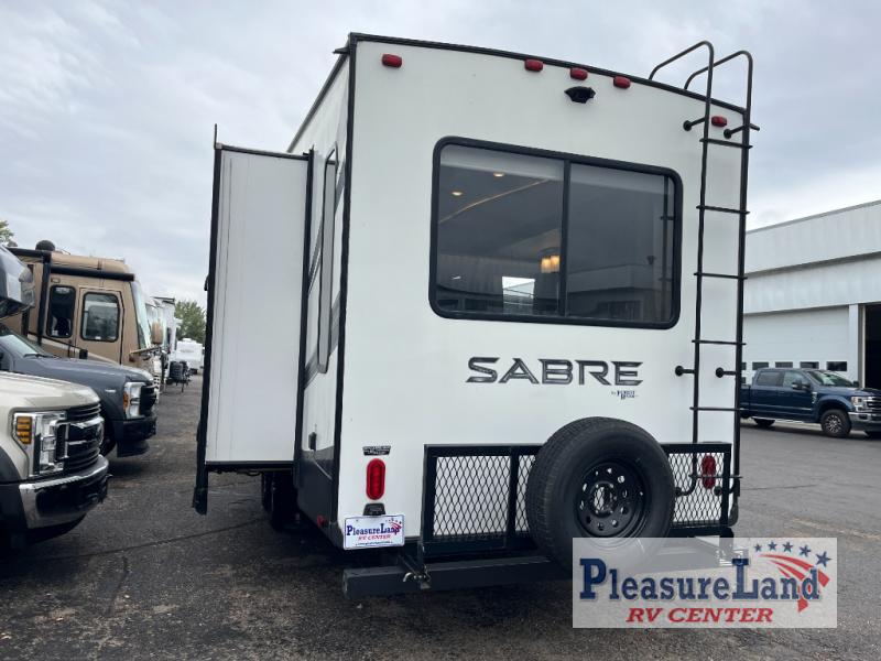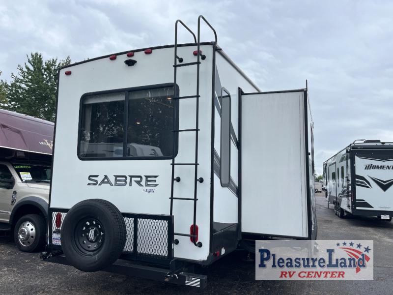 Each Sabre fifth wheel by Forest River offers luxurious living areas, residential kitchen amenities, four seasons of traveling, and lots of storage so you can stay awhile. From the Colossal Camper residential, french door refrigerator with dual freezer drawers, the seamless countertops and the ambient up lighting above the crown molding in the main living area for a stylish look, to the Cinemax seating with cup holders, heat, massage and back-lighting for the perfect movie night, to the industry leading, campsite-view, panoramic slide windows allowing you to enjoy the outdoors in comfort, you will love any model you choose.