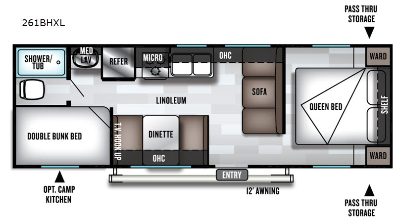 Double bunk beds make this a fun travel trailer, so invite some friends for a weekend getaway! You'll find a queen bed at the front of the unit for a comfortable night's rest. The sofa and booth dinette provide seating for everyone and at night, these can convert to sleeping space, which allows this unit to sleep eight people! The private shower/tub and toilet allow someone to shower, while the vanity right outside the bath allow the kids to brush their teeth before bed. Whip up dinner on the three burner cooktop or pop some popcorn in the microwave for a quick snack. This travel trailer also includes a pass through storage for all your hiking gear!