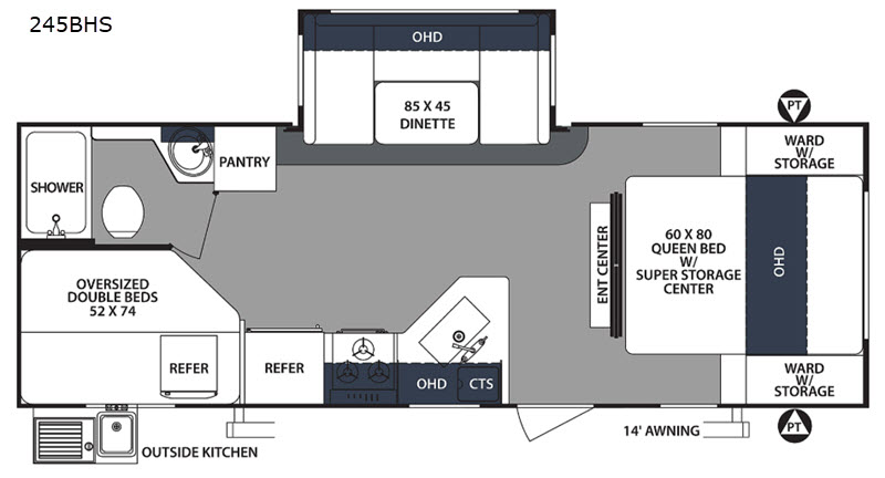 Your family of eight will enjoy all of the space throughout this single slide out Surveyor 245BHS travel trailer. Sleeping space can be found in the front private bedroom for mom and dad with a queen bed that has a super storage center below it, the rear oversized double bunks for the kids, and if needed the U-shaped dinette can easily convert into additional sleeping space. Throughout this model there are Shaker style cabinets plus more storage can be found with the two wardrobes in the bedroom. Outside there is a front pass-through storage area and an outside kitchen where you can fix your evening meal. The 14' electric awning with LED lights provides plenty of shade and gives you more outdoor living space!