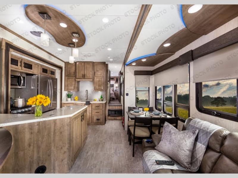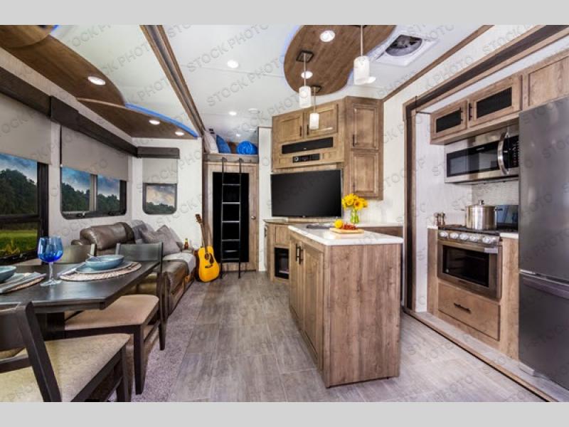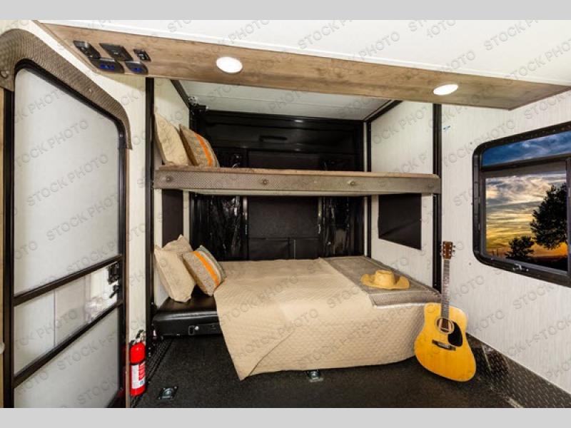 When you like to play hard outdoors then relax in comfort indoors, you'll need this Vengeance Touring Edition toy hauler fifth wheel. You will find the rear ramp door into the 12' 6" garage super easy to handle, and the HappiJac electric bunk in back along with a sofa/bed combo underneath will come in handy for extra guests. The spacious kitchen features a peninsula countertop and a pantry for your dry goods. There is also a large TV with a fireplace and a sofa to kick back on before you head off to rest on the upgraded Denver queen mattress in the master bedroom. Oh, and the bathroom facilities won't disappoint either as there is a half bath off the garage and a full bath with a large shower with seat which will be great after a full day of playing hard.