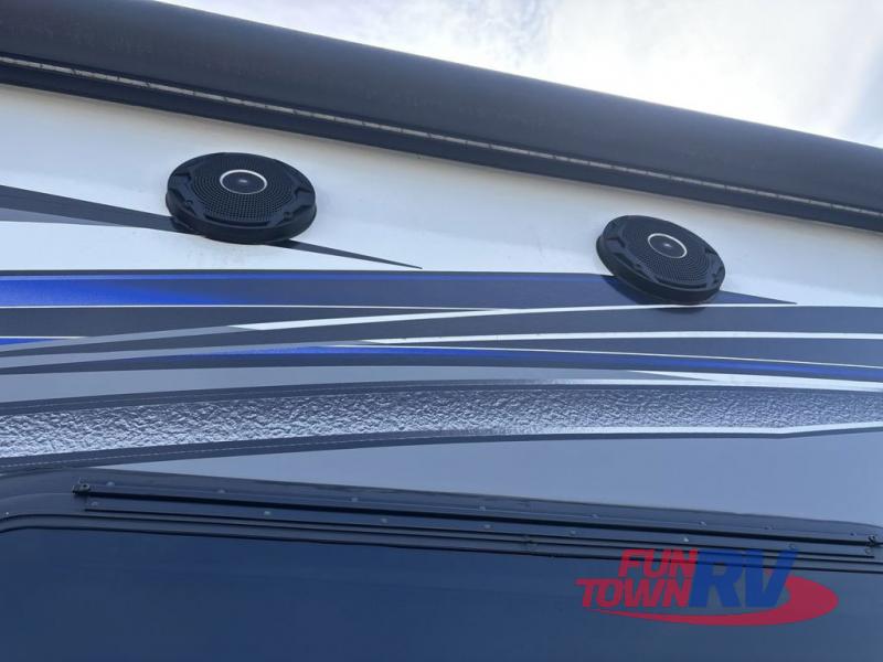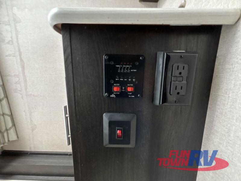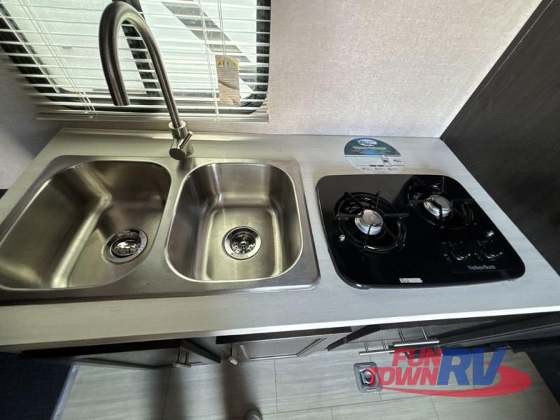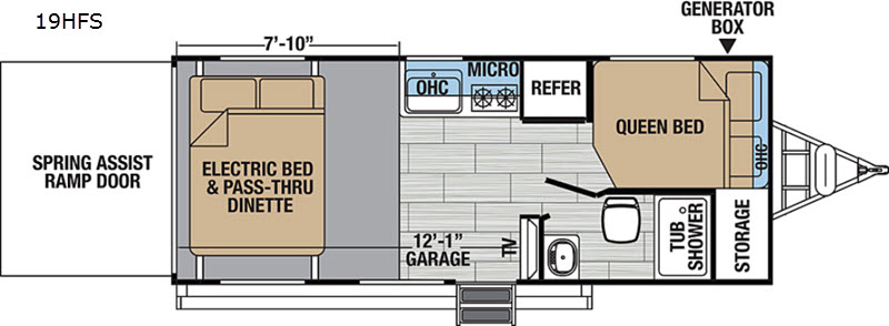 If you want a travel trailer that is on the smaller side, lightweight, and easy to unload and load one or two of your off-toys, then this model is perfect for you. There is up to 12'1" of toy storage and living space before you even get to the refrigerator, queen bed and front full bathroom. Your buddies can sleep on the pass-through dinette and electric bed when you choose to invite them to tag along while you have your own bedding. Great things can come in small packages!