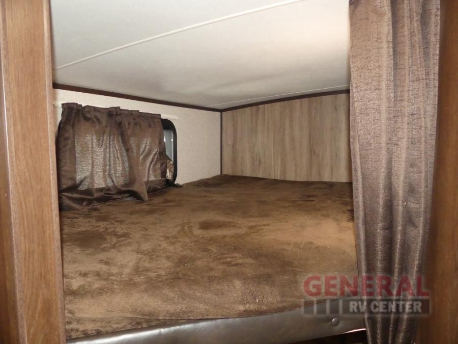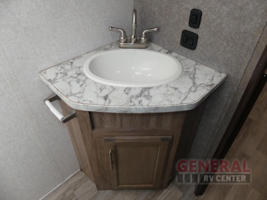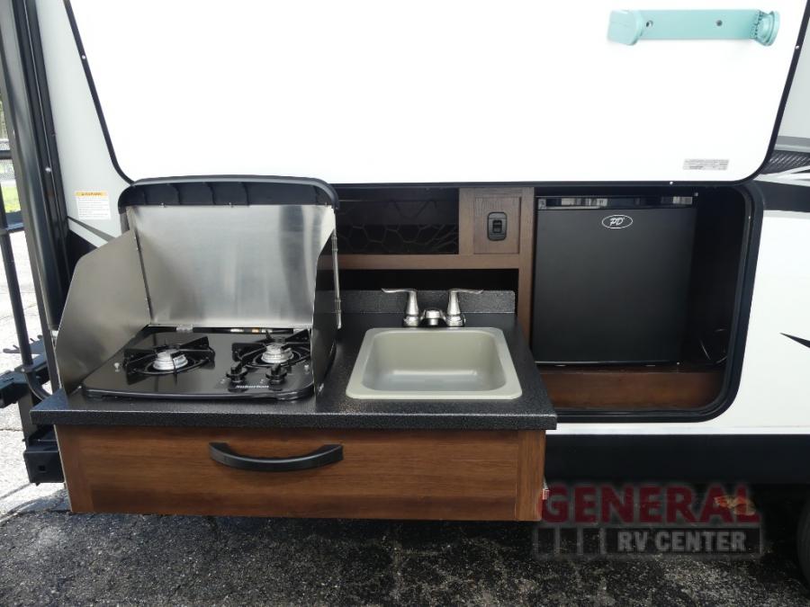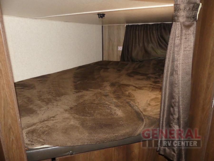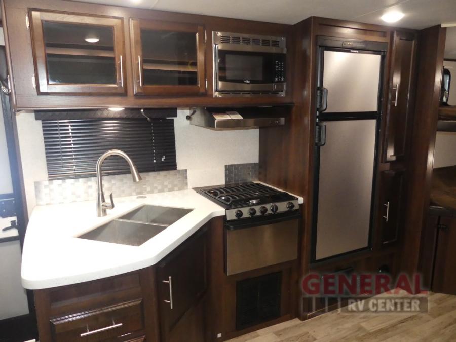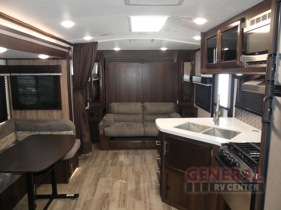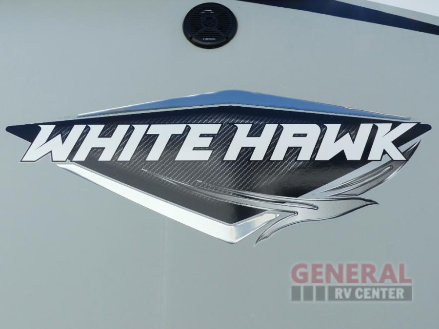 Traveling in this White Hawk travel trailer is like traveling in the lap of luxury. With the addition of the Murphy bed, you can decide whether or not you want the front of the trailer to be used as extra seating for the living area or as a semi-private bedroom. The semi-private bunks give you the space that you need in this model to sleep seven people comfortably. If you get tired of spending every day cooking indoors, then you can take your preparations outside to prepare dinner in the outdoor kitchen, and the bathroom skylight allows some of that outdoor sunshine to brighten up the 34" radius shower.