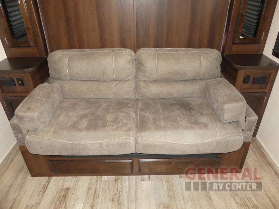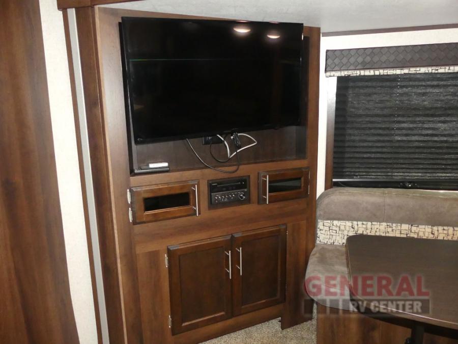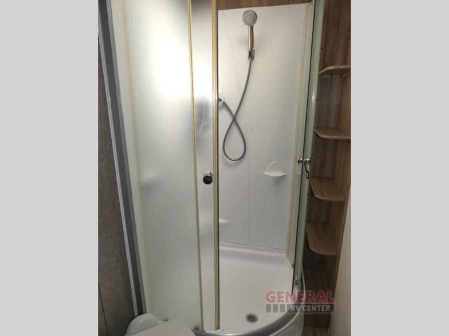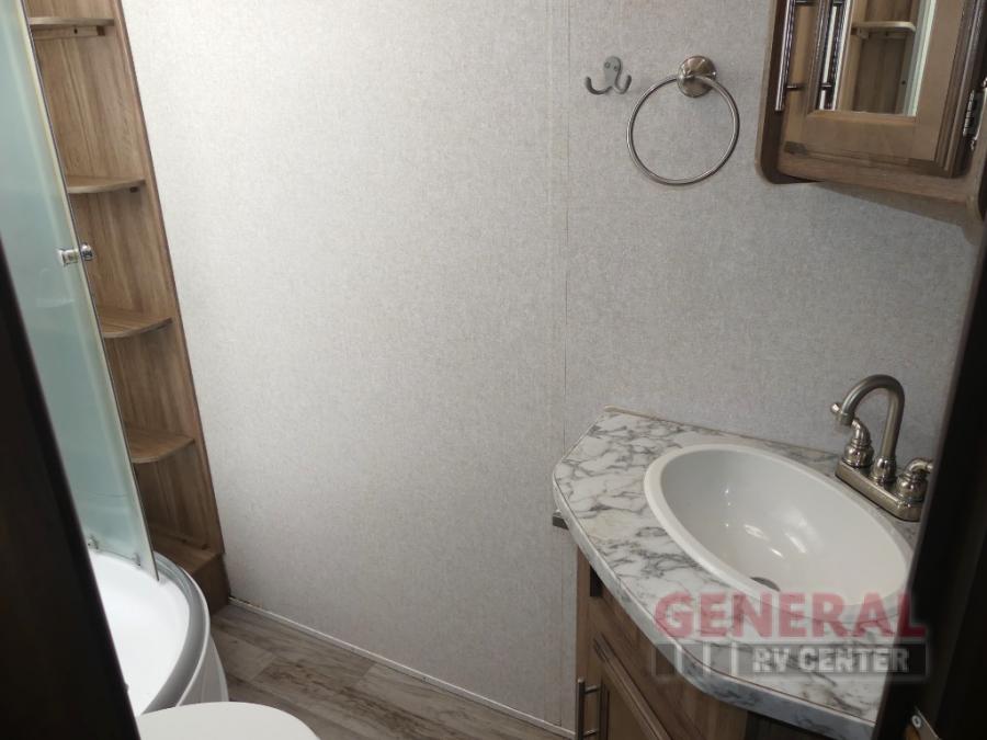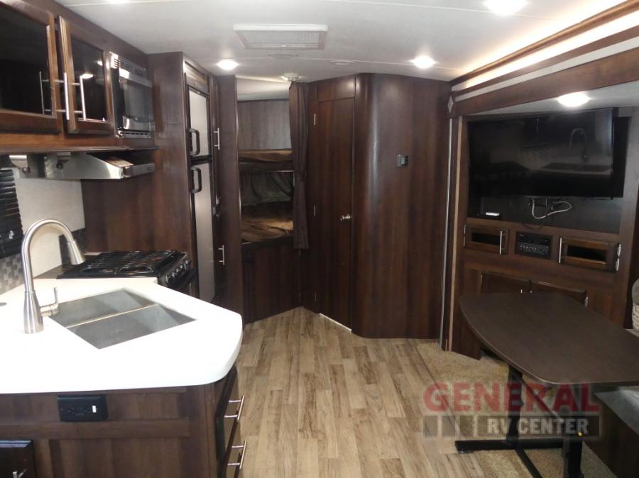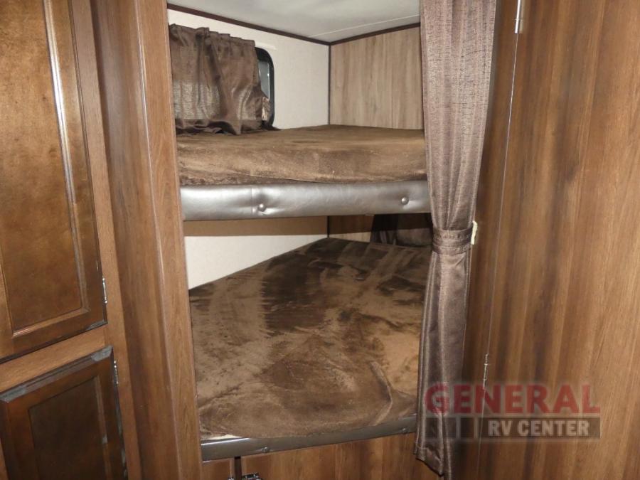 Traveling in this White Hawk travel trailer is like traveling in the lap of luxury. With the addition of the Murphy bed, you can decide whether or not you want the front of the trailer to be used as extra seating for the living area or as a semi-private bedroom. The semi-private bunks give you the space that you need in this model to sleep seven people comfortably. If you get tired of spending every day cooking indoors, then you can take your preparations outside to prepare dinner in the outdoor kitchen, and the bathroom skylight allows some of that outdoor sunshine to brighten up the 34" radius shower.