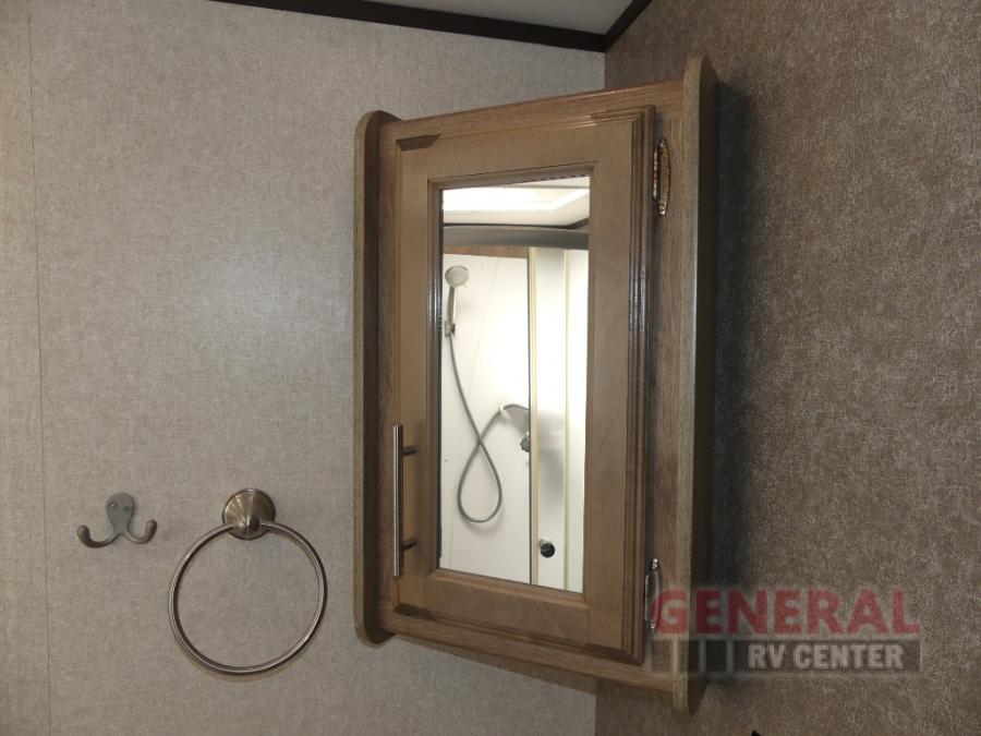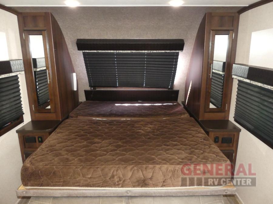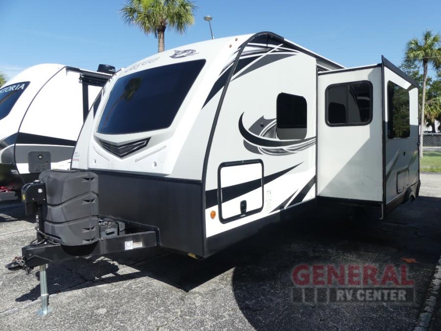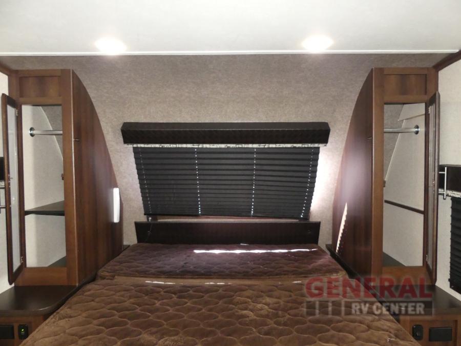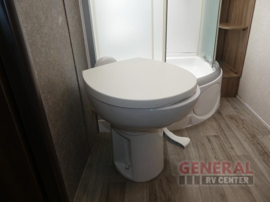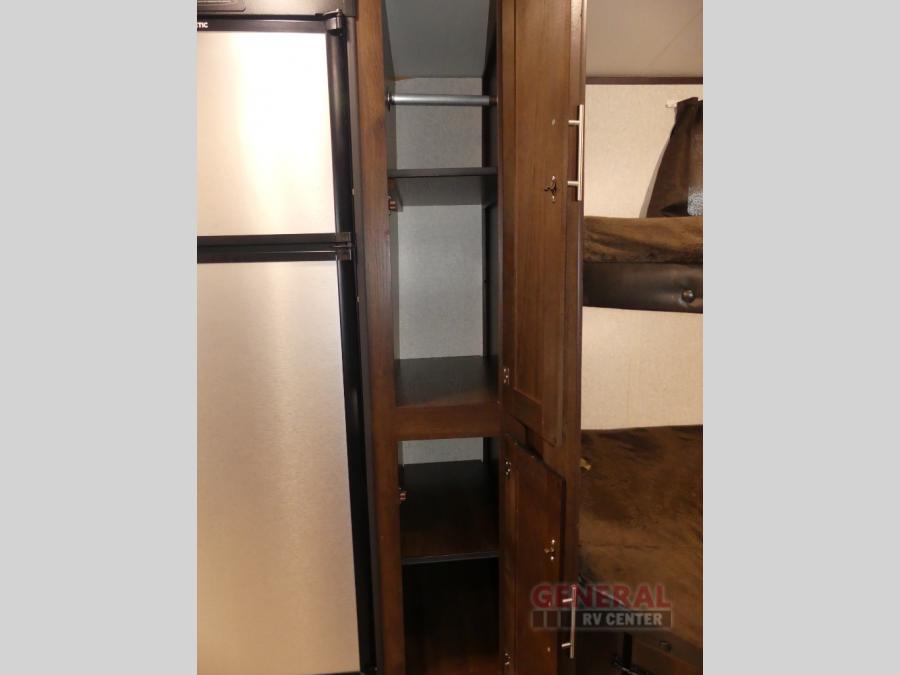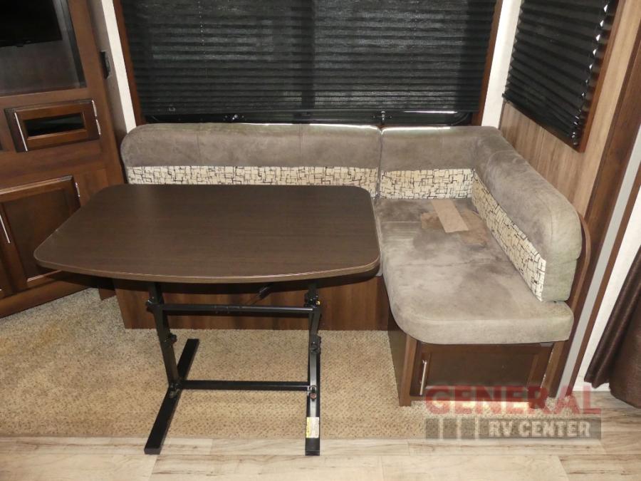 Traveling in this White Hawk travel trailer is like traveling in the lap of luxury. With the addition of the Murphy bed, you can decide whether or not you want the front of the trailer to be used as extra seating for the living area or as a semi-private bedroom. The semi-private bunks give you the space that you need in this model to sleep seven people comfortably. If you get tired of spending every day cooking indoors, then you can take your preparations outside to prepare dinner in the outdoor kitchen, and the bathroom skylight allows some of that outdoor sunshine to brighten up the 34" radius shower.