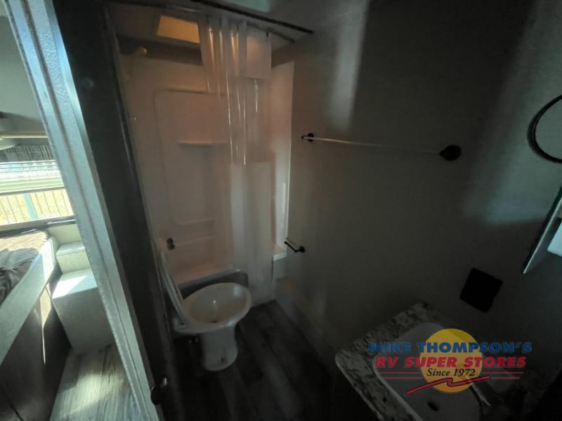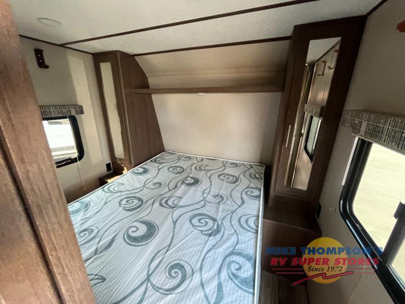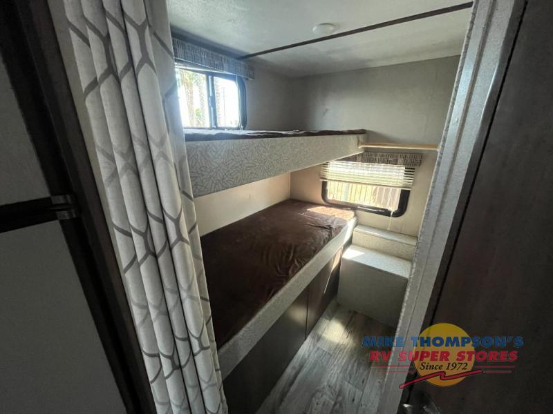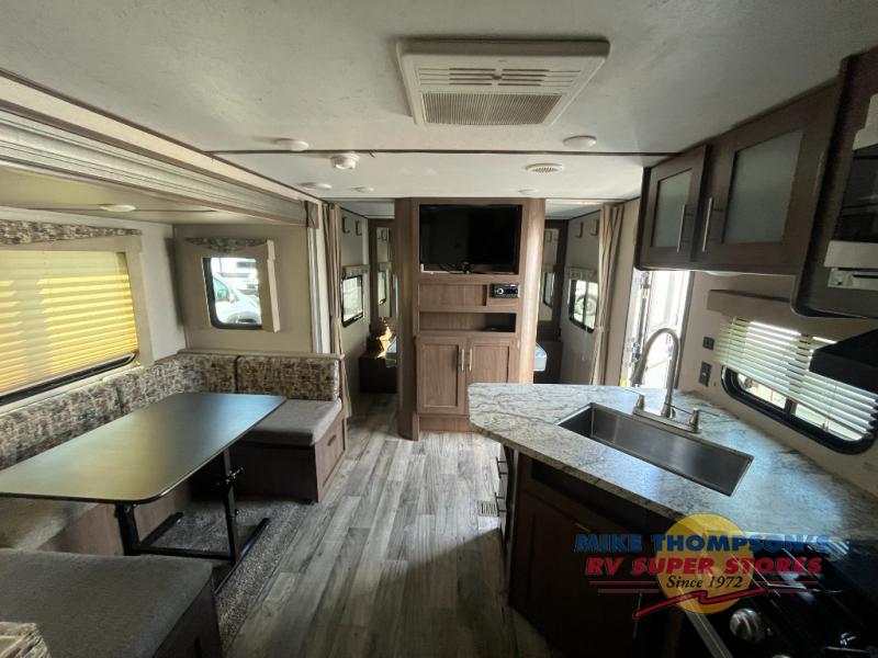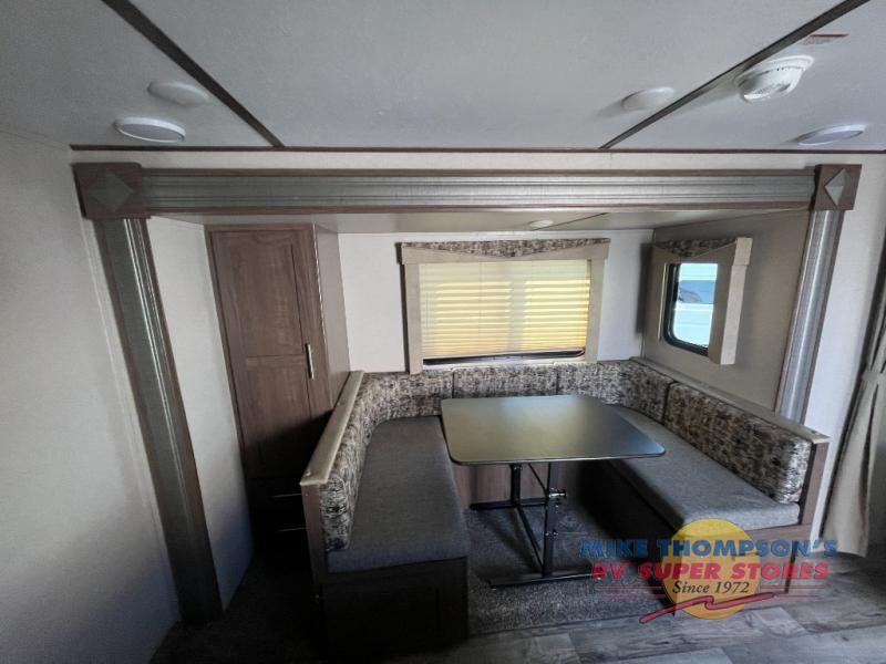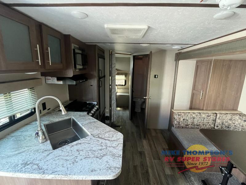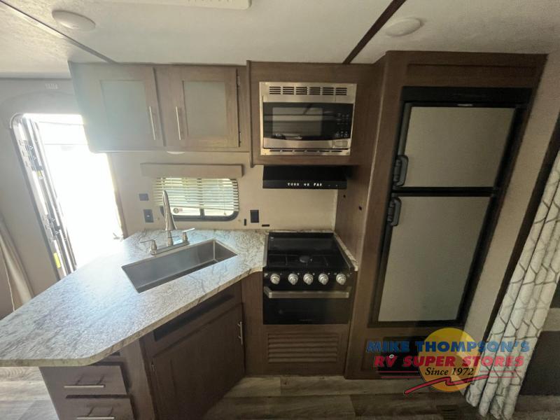 This Keystone Hideout travel trailer features all the amenities you need to enjoy camping, including a single slide for added living space and double-size bunks for extra sleeping space. Along either side of the entertainment center you will find accordion doors which you can close to provide complete privacy in the front bedroom, and within the slide is a U-shaped dinette that helps this trailer sleep eight people each night. When you want to spend more time outside, then the outdoor kitchen is ideal for you! Now you can watch your kids ride their bikes while you are preparing lunch or dinner.