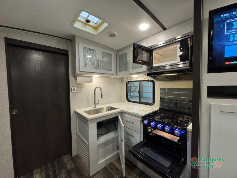 The outdoor kitchen offers a mini-fridge, stove, and sink, making it easy to enjoy meals under the stars. Whether you're grilling or preparing snacks, this feature adds convenience to your outdoor adventures.