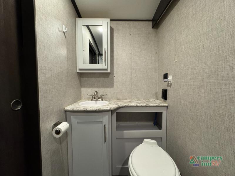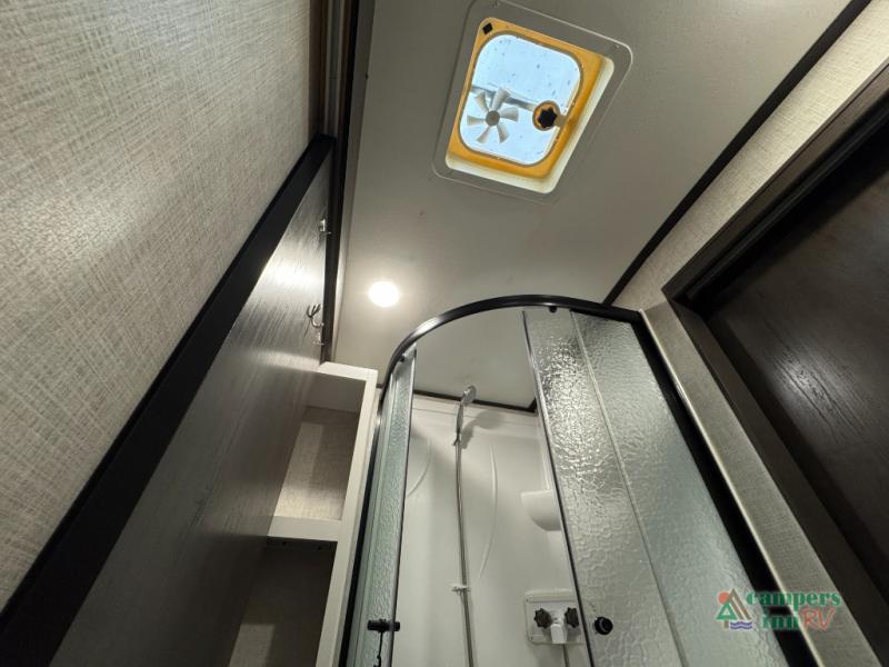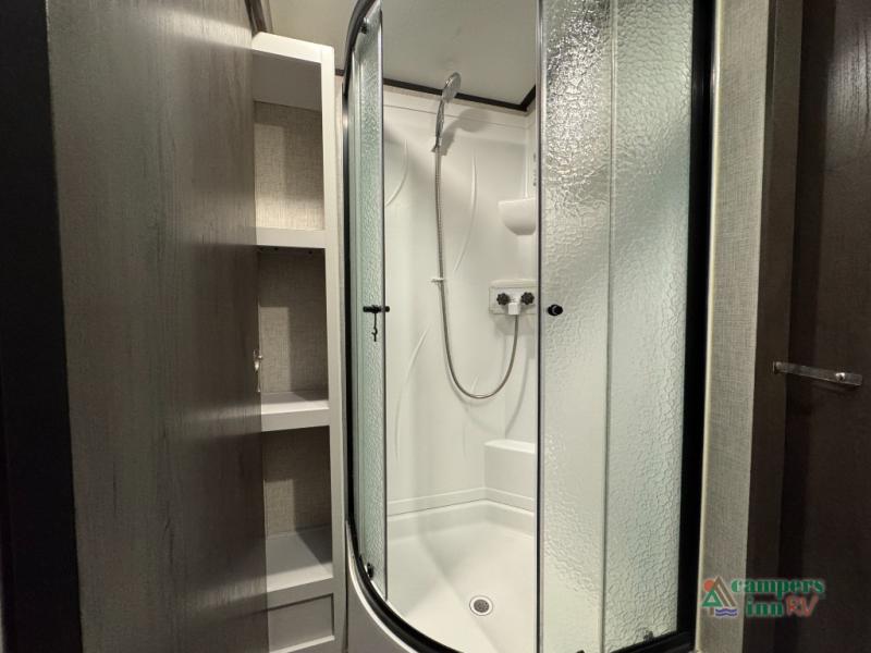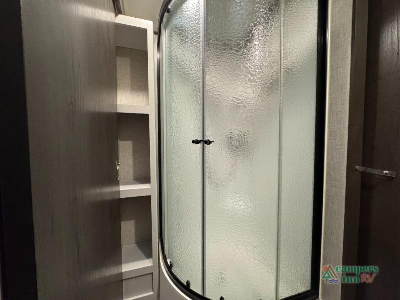 Freshen up in the spacious bathroom featuring a large shower, vanity, and toilet. The bathroom’s modern design and ample storage provide all the comforts of home, making it perfect for campsite stays or off-grid adventures.