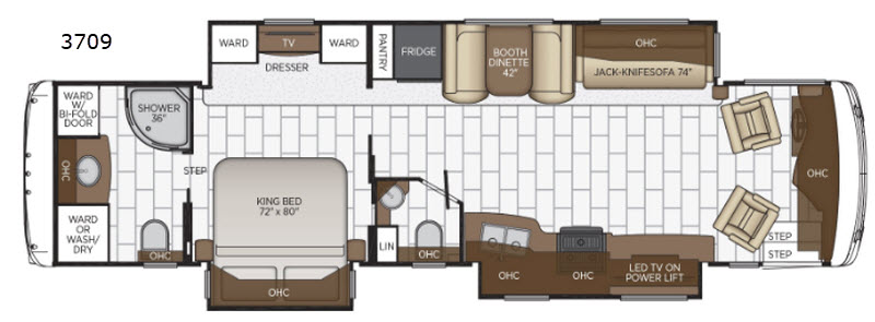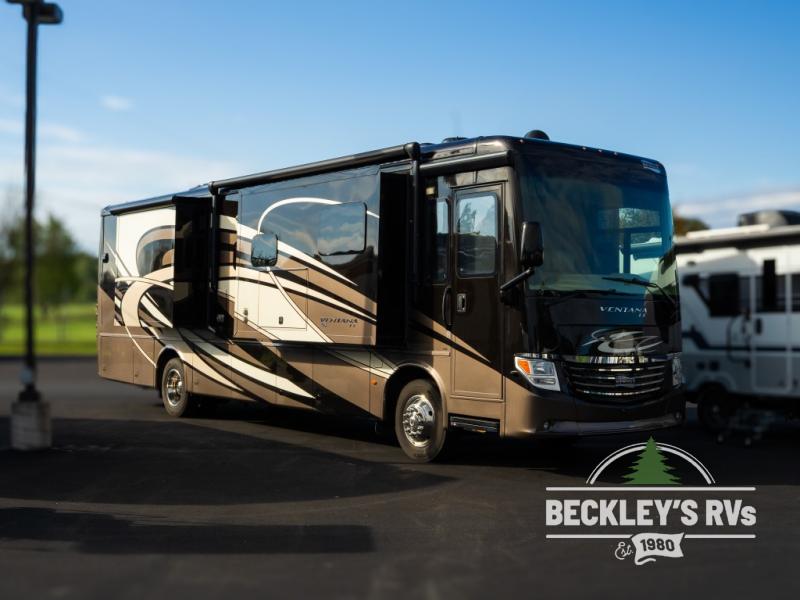 This Ventana LE 3709 will have you thinking about becoming a full-timer each time you take it out of storage. The kitchen offers everything the cook will need to make meals for a weekend or everyday if you choose not to eat fast food. Just imagine visiting with other camping friends on a hot summer day in the main living area. You can offer them seating on the 74" jack-knife sofa, the captain's chairs that swivel, and the booth dinette all while watching the LED TV on a power lift. The sofa and dinette also offer extra sleeping space when needed. The walk-through bedroom offers a cozy queen bed, storage, another LED TV, and access to the rear full bathroom. Come see other highlights like the space saving doors, the radius shower, and the half bath.