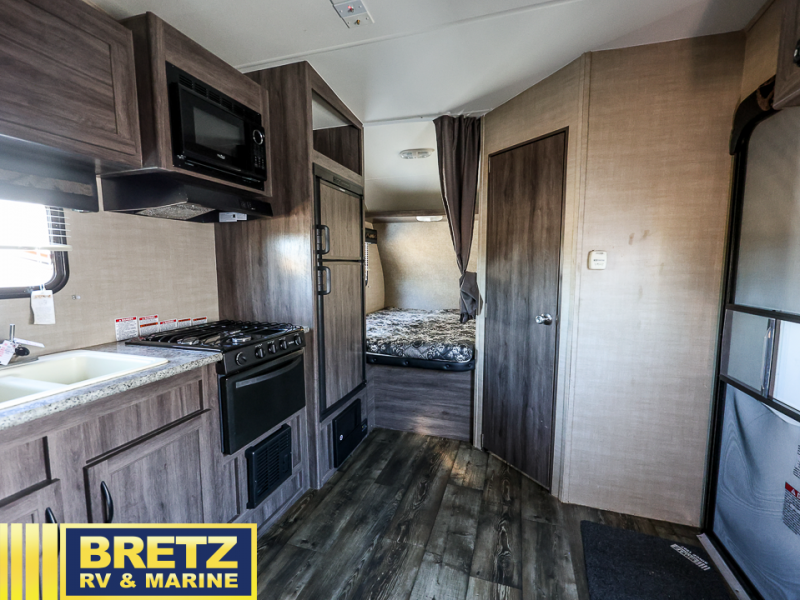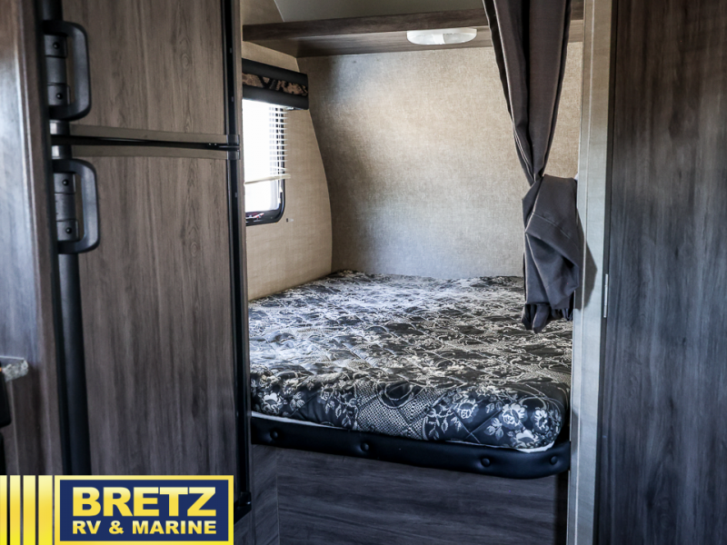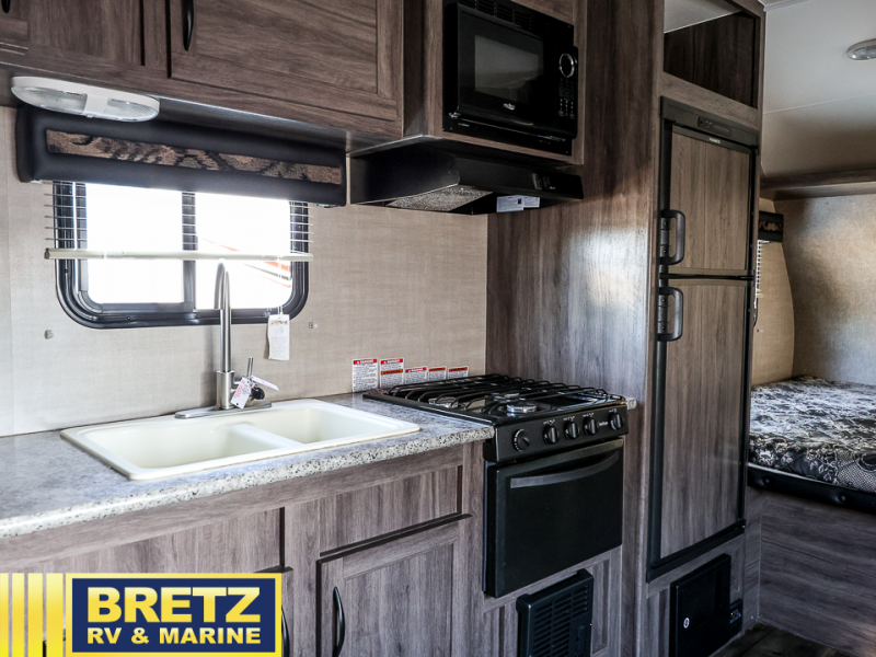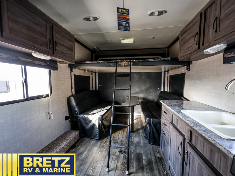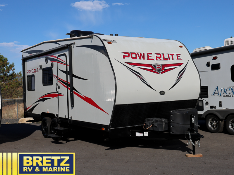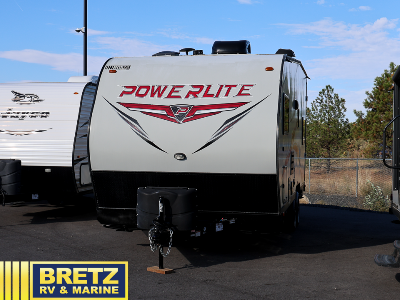 For an adventurous weekend or a week of relaxation, take this Powerlite toy hauler on your next trip and you won't be disappointed. From the fully equipped kitchen with a three-burner range top and a large double-door refrigerator, to the full bathroom with a medicine cabinet and a skylight that will bring in the morning sun, you will find everything you need in this trailer, and the entire unit is kept cool during any type of weather with the 13,500 BTU air conditioner that has been included.