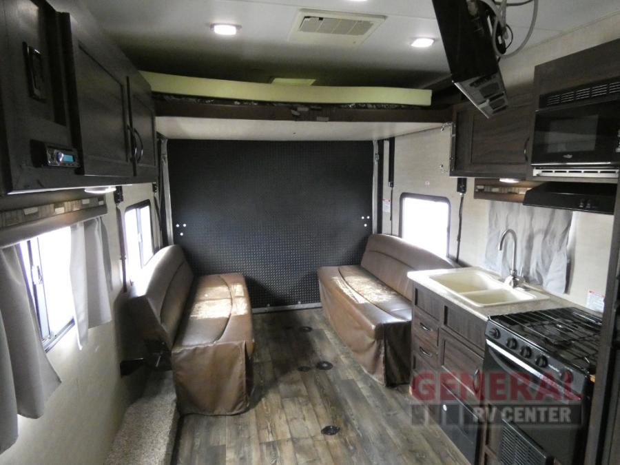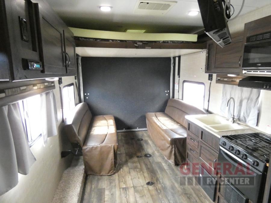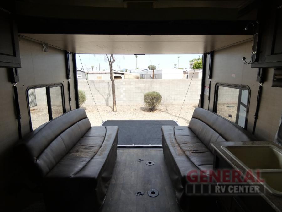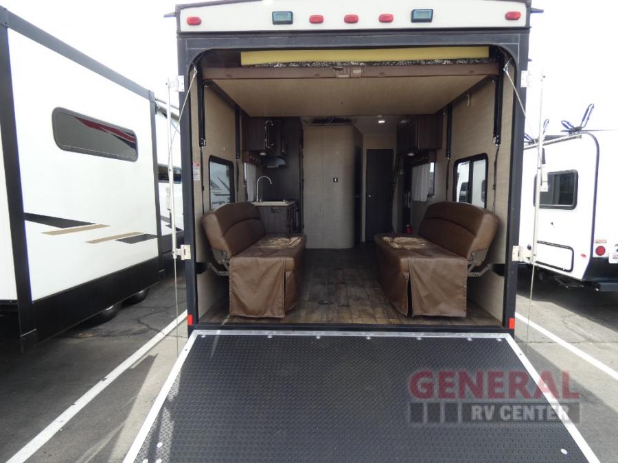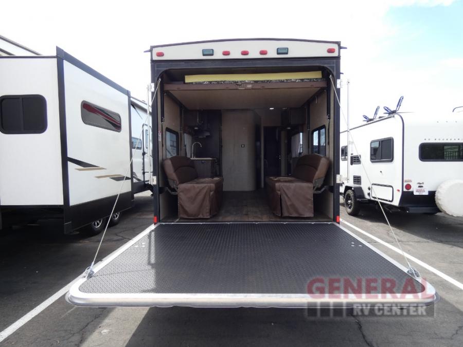 This Rage'n toy hauler is a wonderful addition to any travels you may take because of its versatile amenities. Once you've settled into camp and have unloaded all of your toys, the cargo area can transform into a very useful living area because of its electric bunk that drops down from the ceiling and the dual opposing sofas that can easily convert into an extra bed for guests, which gives this trailer enough space to sleep six people each evening. In the morning, you will be able to easily fix a hearty breakfast for everyone on the three-burner range top.