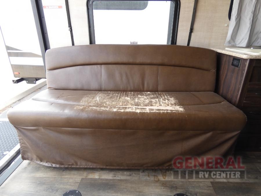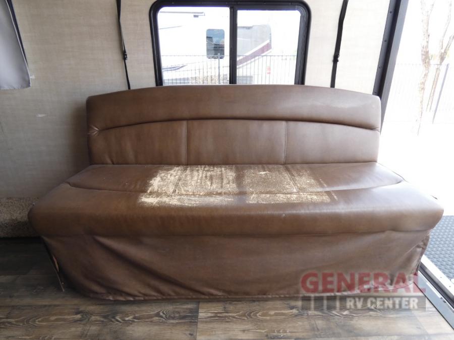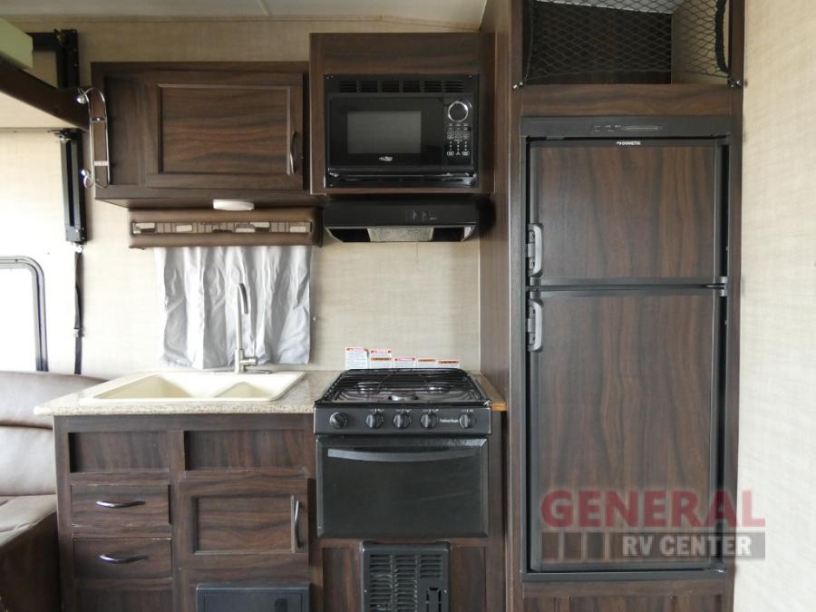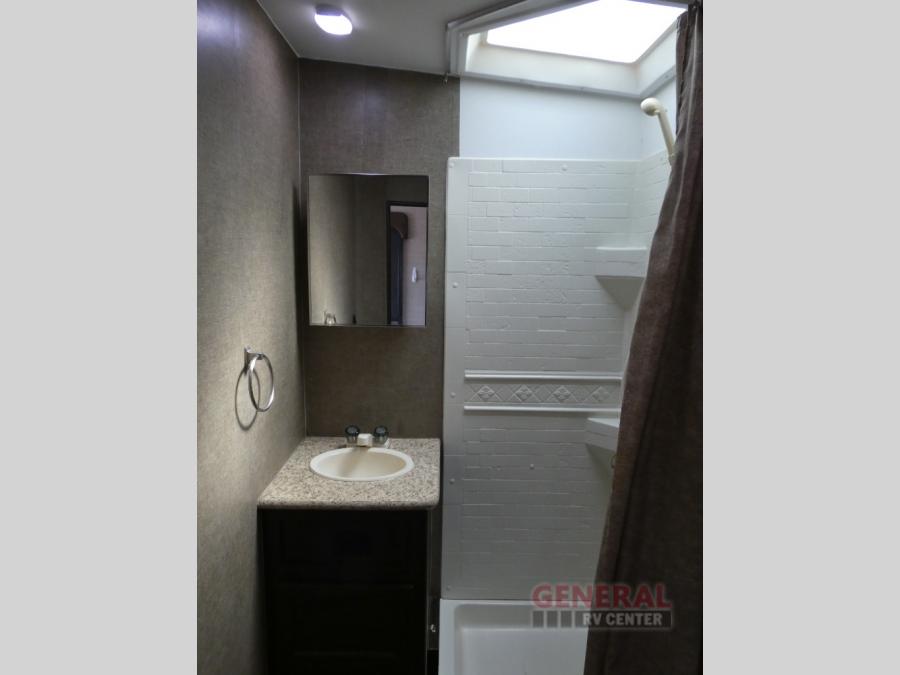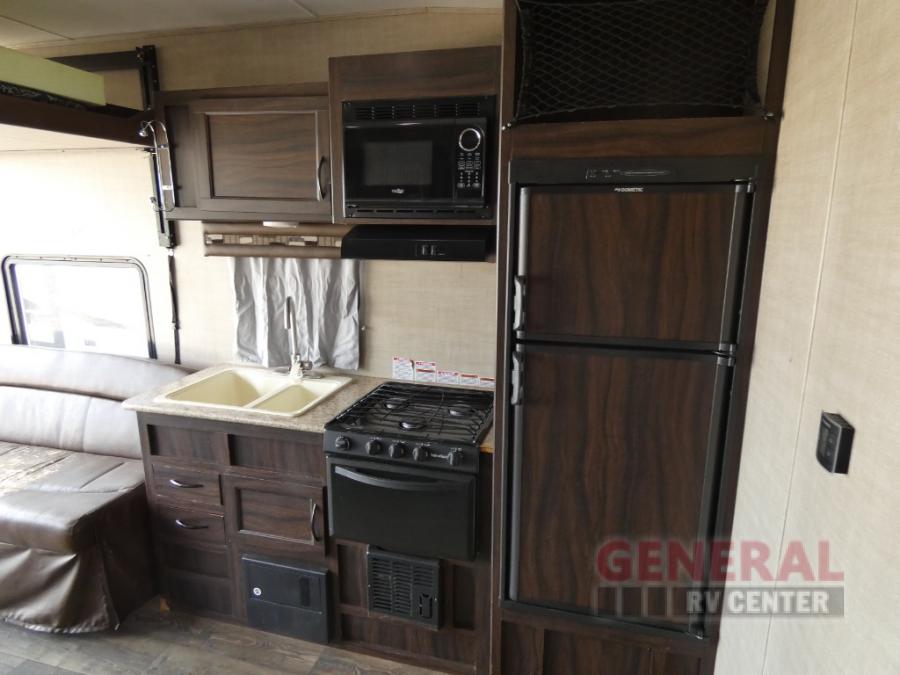 This Rage'n toy hauler is a wonderful addition to any travels you may take because of its versatile amenities. Once you've settled into camp and have unloaded all of your toys, the cargo area can transform into a very useful living area because of its electric bunk that drops down from the ceiling and the dual opposing sofas that can easily convert into an extra bed for guests, which gives this trailer enough space to sleep six people each evening. In the morning, you will be able to easily fix a hearty breakfast for everyone on the three-burner range top.
