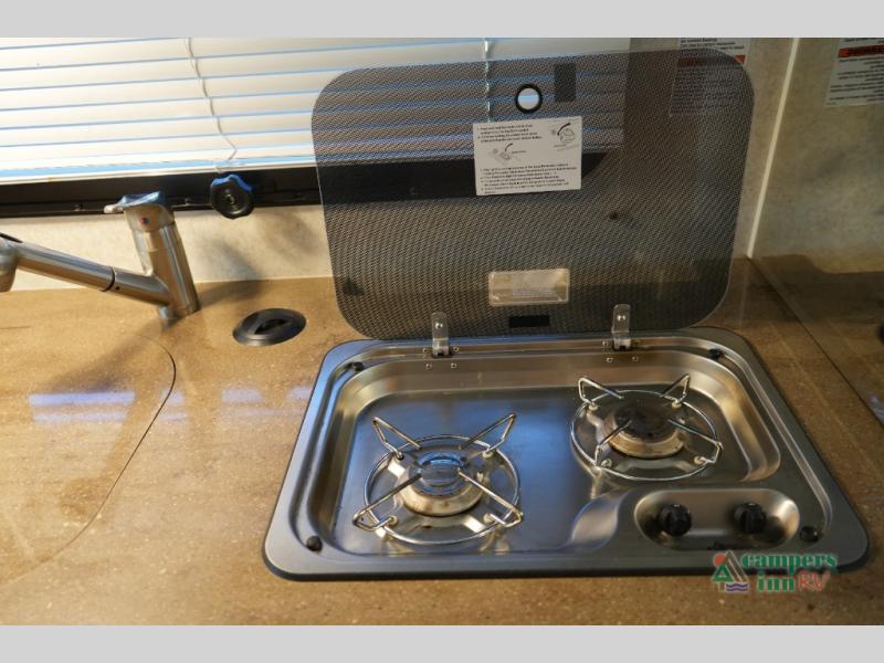Prepare meals with ease using the recessed two-burner cooktop, ample storage, and a convenient counter extension for extra prep space.