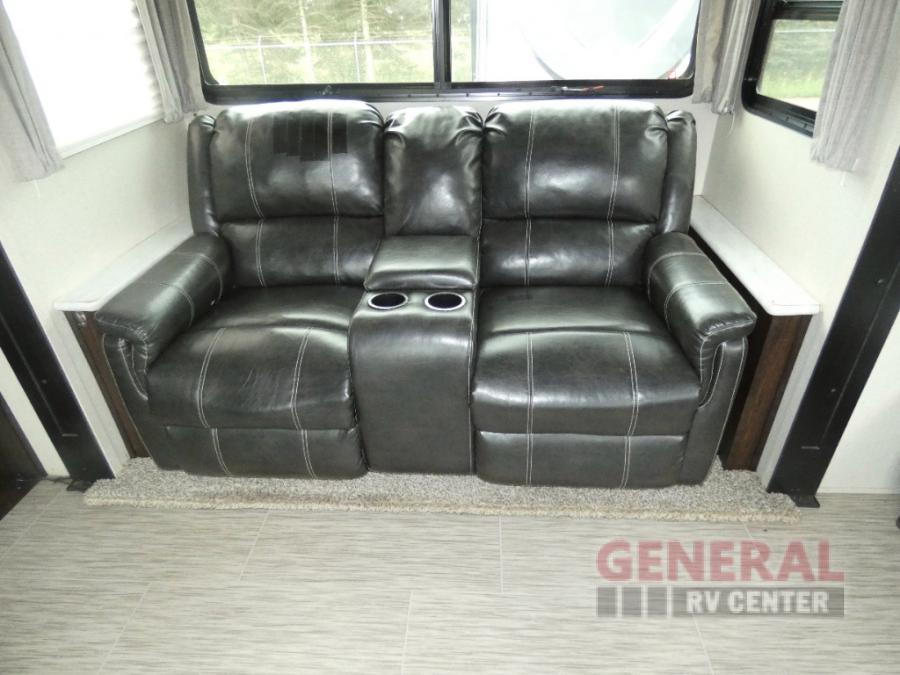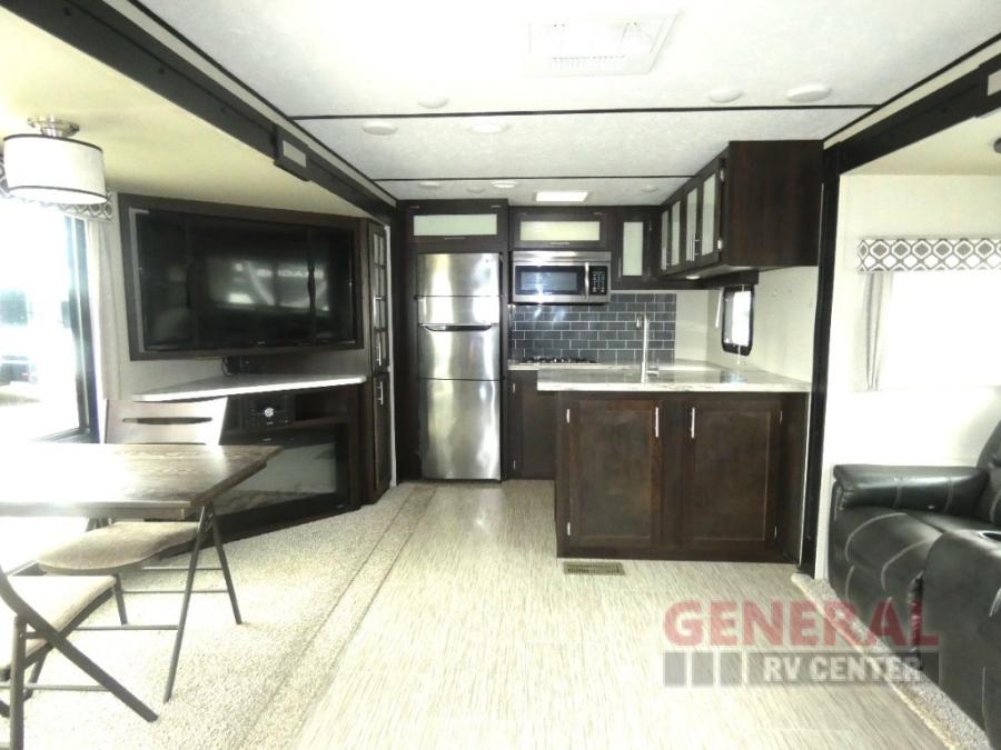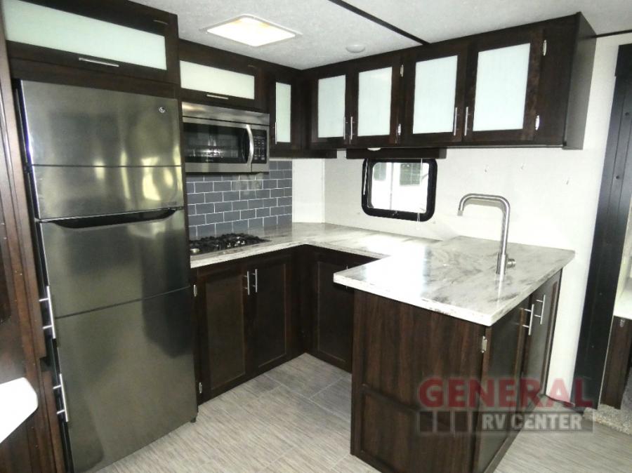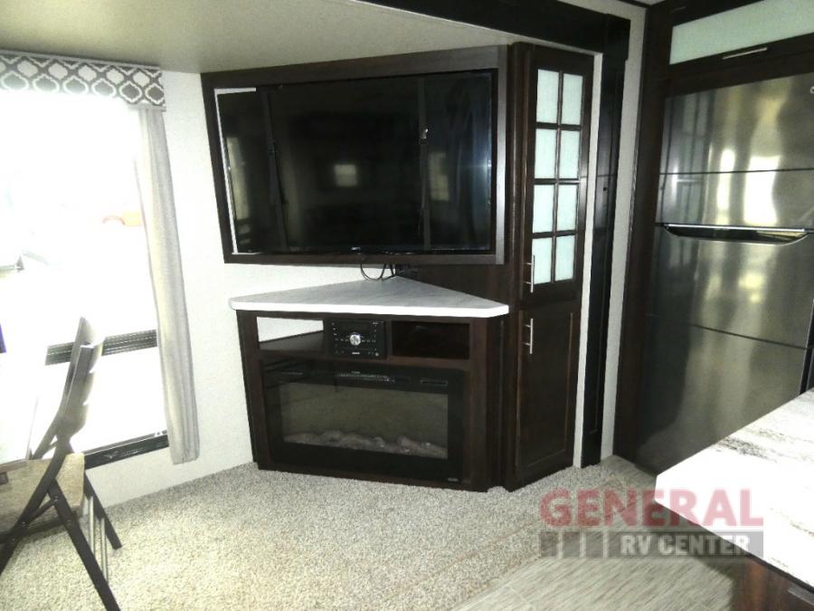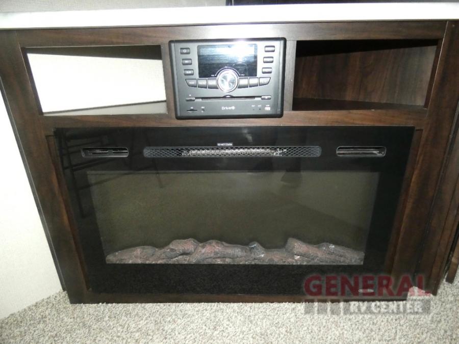 Come find yourself longing for your next camping trip when you have this unique rear kitchen in the LaCrosse travel trailer. Your meal prep will be a breeze with the U-shaped counter, and you will have plenty of space for your cold items in the stainless steel 11 cu. ft. refrigerator. You will find additional MAX storage throughout including in the oversized pots-n-pans drawer and oversized pantry with adjustable and removable shelves. When it's time to unwind inside, the theater seats and sofa are available to watch the 50" LED TV and stay cozy from the fireplace, or you can relax outside under the awning. When you are ready to turn in for the night then retreat to the private front bedroom with a king size bed and plenty of clothing storage, plus there is a location to add an optional washer and dryer if you like. Check this model out to find luxury and comfort around every corner!