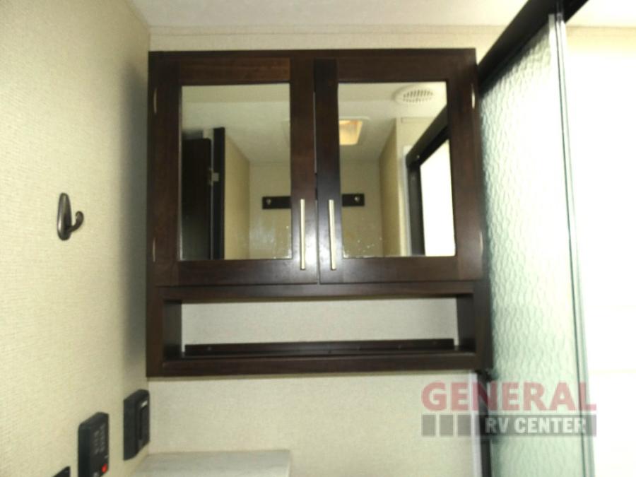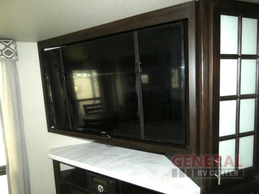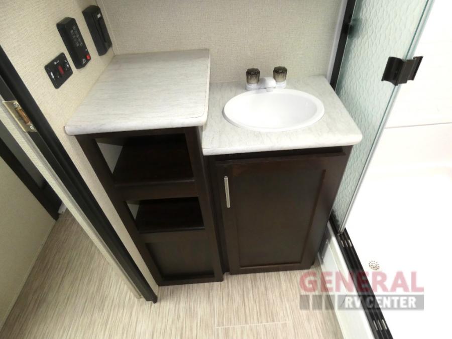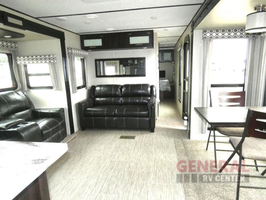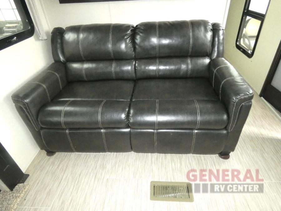 Come find yourself longing for your next camping trip when you have this unique rear kitchen in the LaCrosse travel trailer. Your meal prep will be a breeze with the U-shaped counter, and you will have plenty of space for your cold items in the stainless steel 11 cu. ft. refrigerator. You will find additional MAX storage throughout including in the oversized pots-n-pans drawer and oversized pantry with adjustable and removable shelves. When it's time to unwind inside, the theater seats and sofa are available to watch the 50" LED TV and stay cozy from the fireplace, or you can relax outside under the awning. When you are ready to turn in for the night then retreat to the private front bedroom with a king size bed and plenty of clothing storage, plus there is a location to add an optional washer and dryer if you like. Check this model out to find luxury and comfort around every corner!