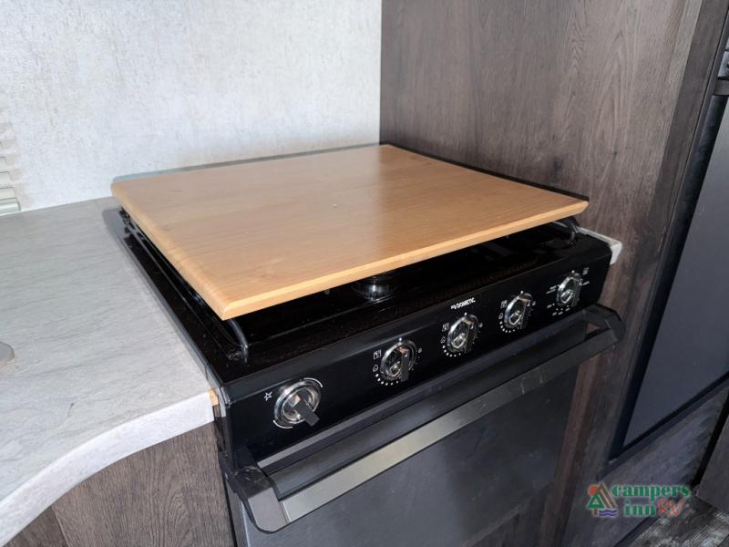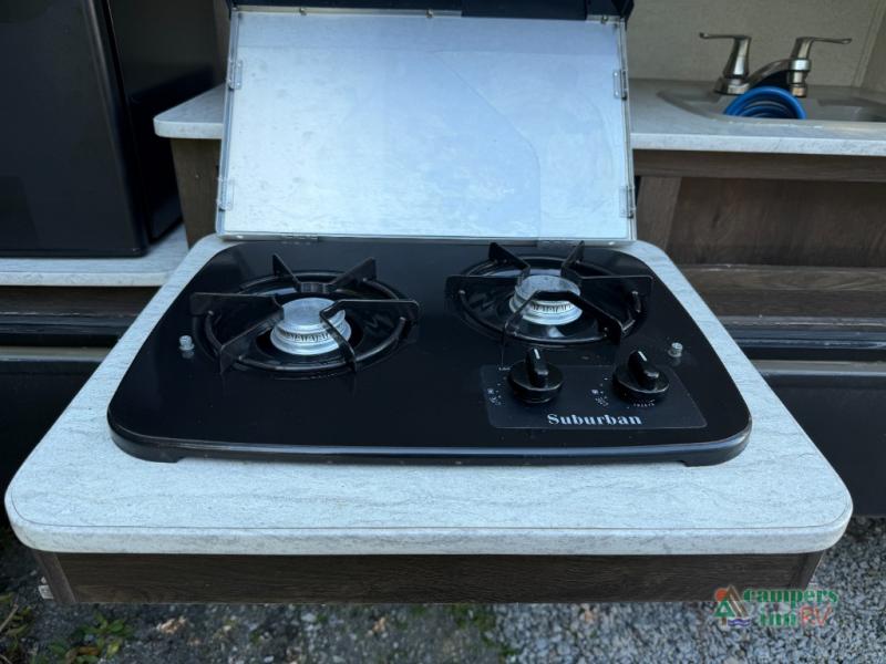- Indoor kitchen with three-burner cooktop, 17" oven, and stainless steel appliances