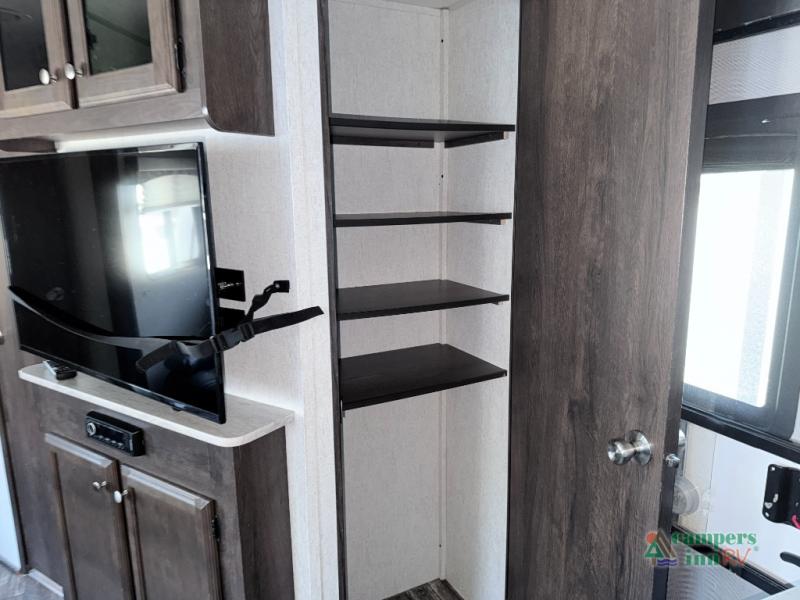 - Front private bedroom with queen bed, closets, and overhead cabinets