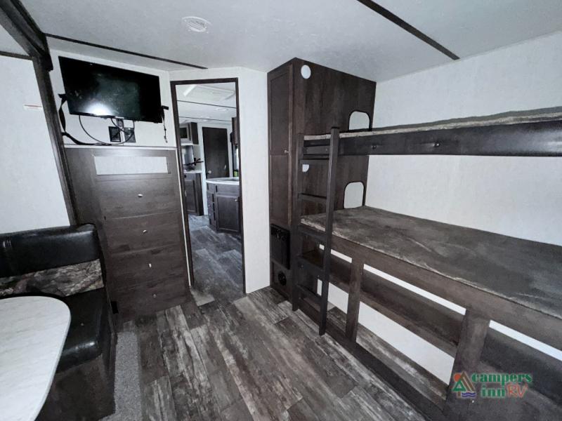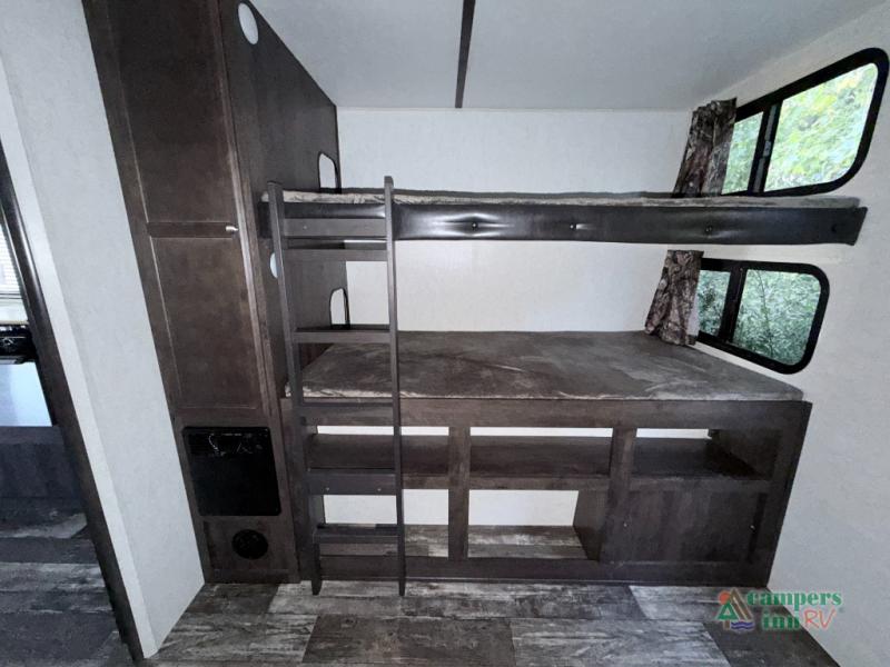 - Rear bedroom with bunk beds, ladder, storage below, and a closet