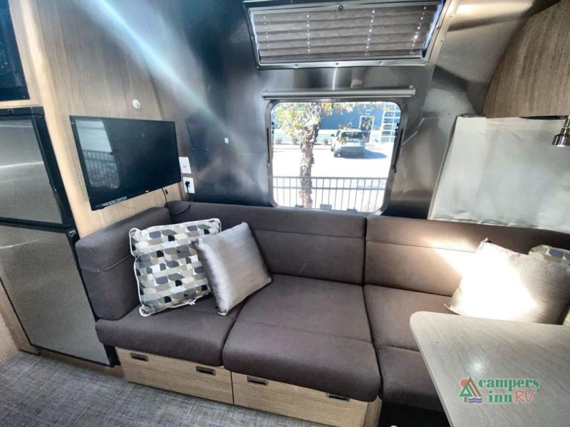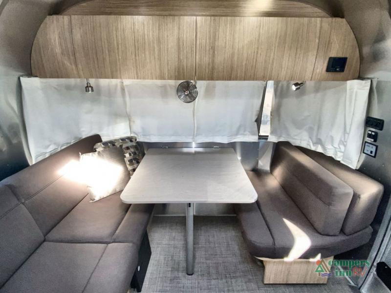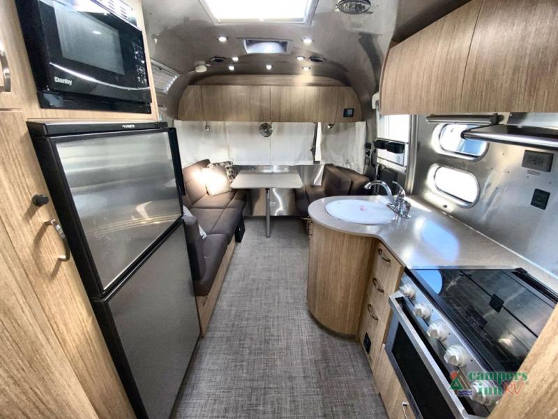 The lightweight and airy Flying Cloud travel trailer by Airstream has a variety of popular floorplans to choose from to fit your family's traveling wants and desires. Beginning with the semi-monocoque aluminum superstructure, the torsion axle suspension, the shock absorber, and the rear view monitoring system, you will enjoy a smooth tow and easy parking. The panoramic windows offer amazing views and natural lighting, and at night you can close the Oceanair roller blinds, and blackout curtains in the front and back for complete privacy. The enclosed aluminum insulated heated underbelly and the Quietstream ducted Climate control system allow you to camp in all types of weather. If you are searching for a dreamy vibe, and an RV with modern technology, lots of storage, and versatile sleeping space, choose a Flying Cloud and drift away!