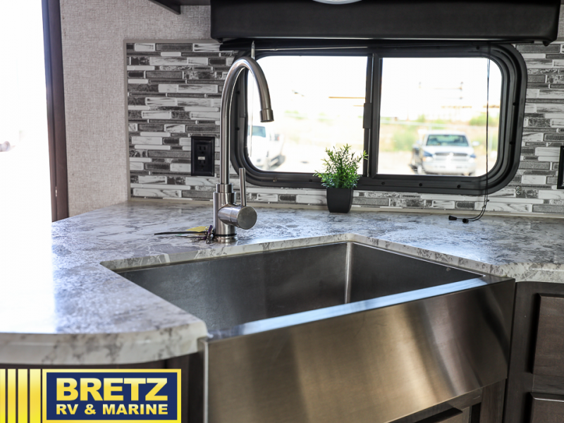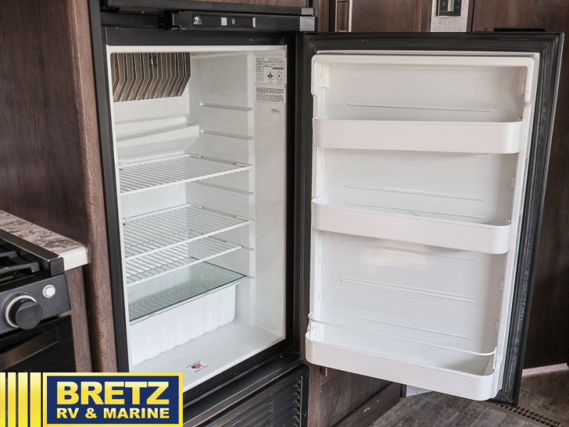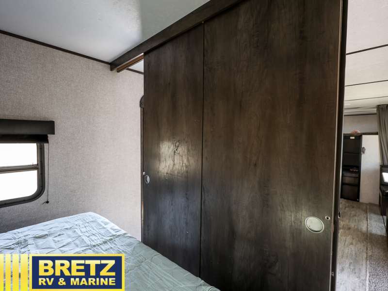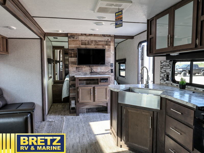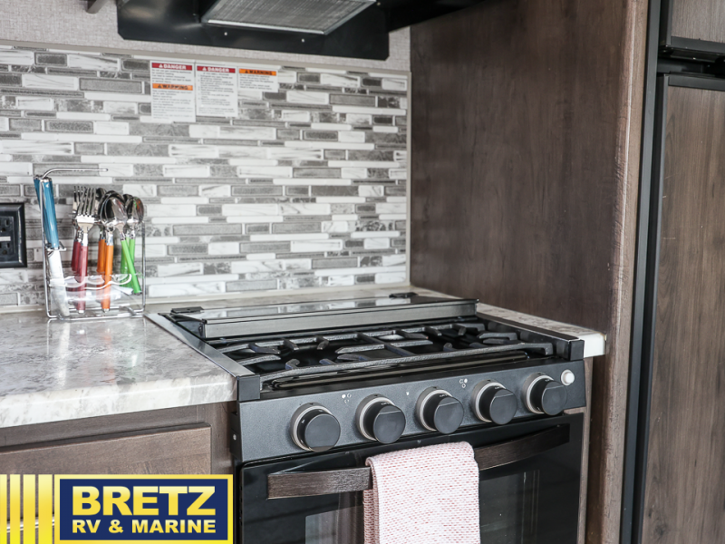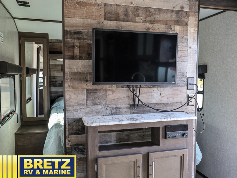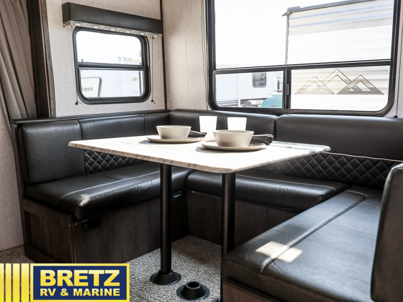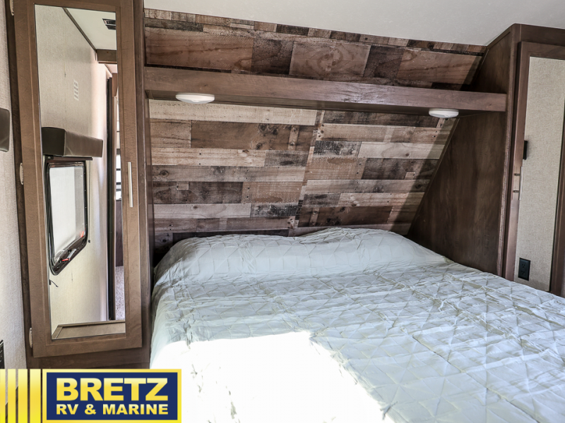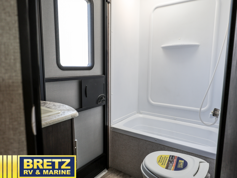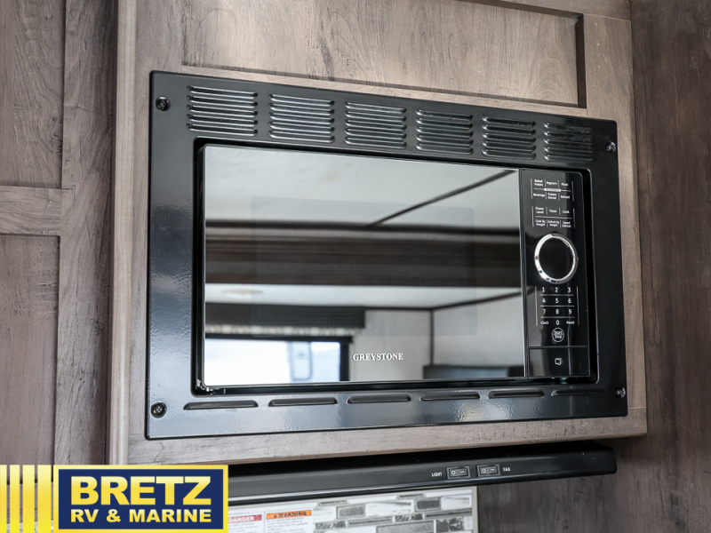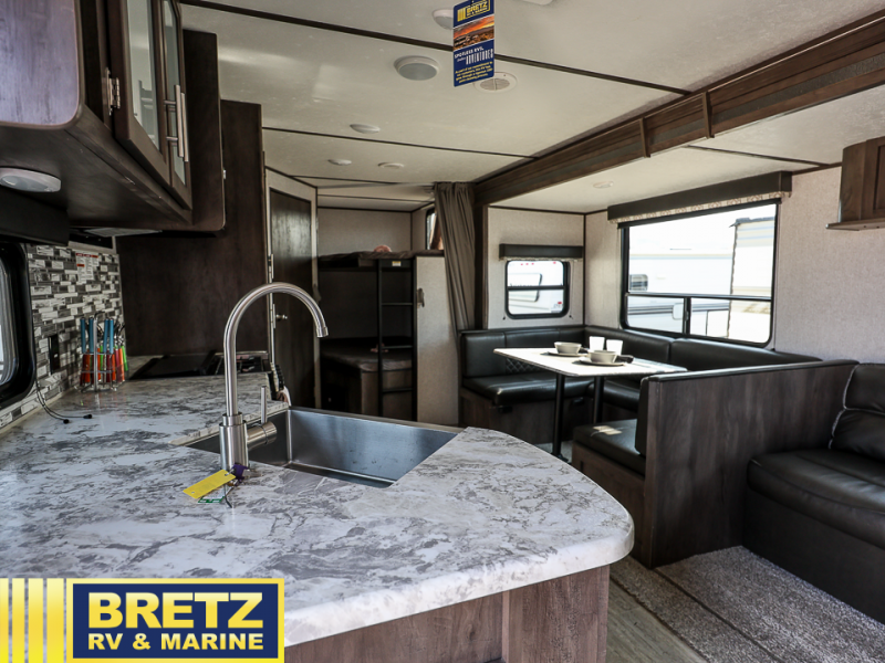 You will enjoy a great night's sleep each night in this 2810BHS travel trailer thanks to the Everdream mattress located in the front private bedroom. There is even a rear set of double over double bunk beds, and the U-shaped dinette and sofa slide out can both be converted into extra sleeping spaces too. You can conveniently enter right into the rear corner bathroom from the outside, as well as into the main living/kitchen area with the second entry. If you don't feel like creating a whole meal with the 3-burner range then you can easily pop leftovers inside the microwave for a quick meal!