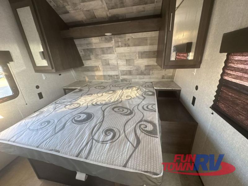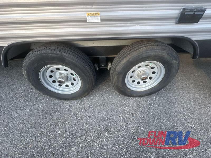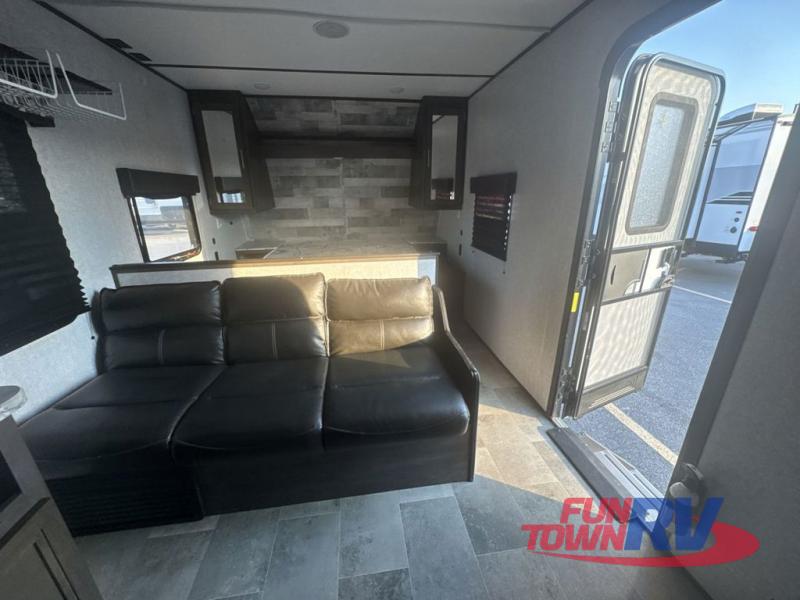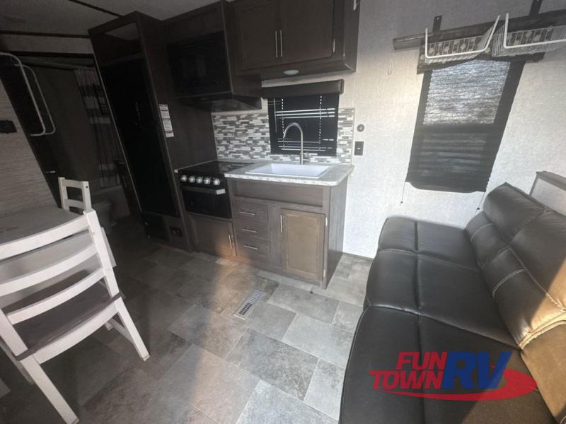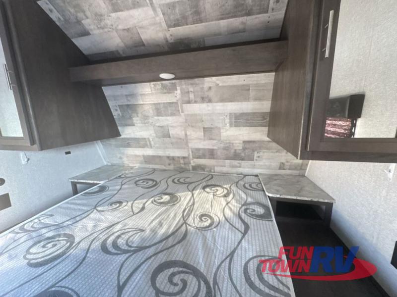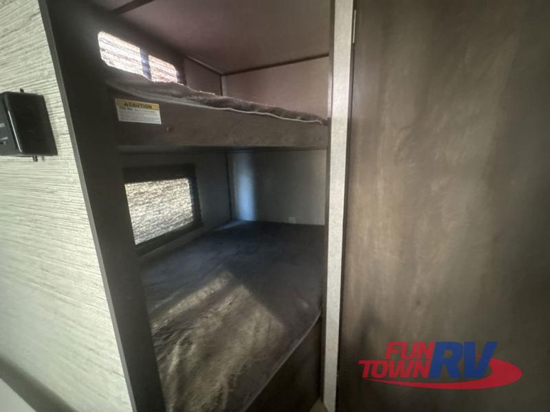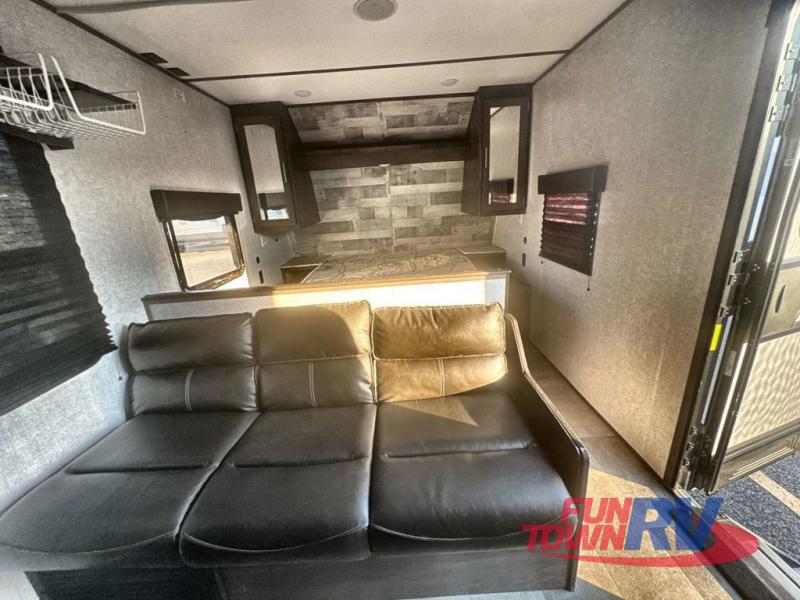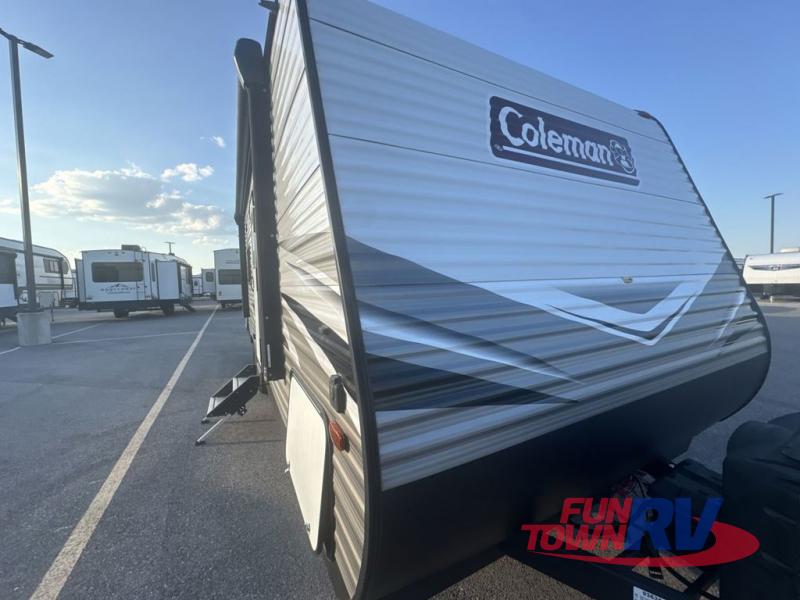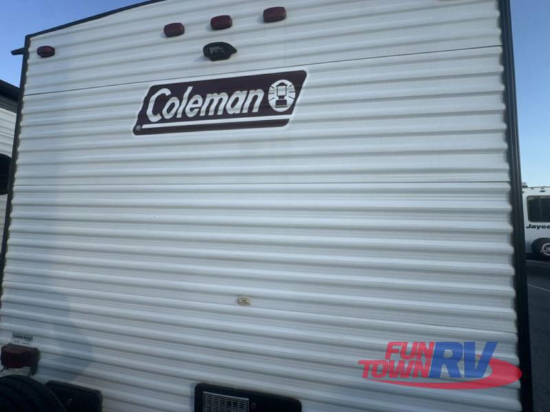 Don't let memorable and adventurous getaways pass you by! Grab this Coleman Lantern LT Series travel trailer and set out on your next great expedition. The full rear bathroom with its skylight will come in handy for your morning routines, and the full kitchen will give you an opportunity to make warm meals for the group. You will be amazed by the amount of sleeping choices this trailer has, enough to sleep eight to nine people comfortably. The bunks will be the kids favorite, and the walk-around residential queen bed will be a nice oasis at night, plus the furniture doubles as sleeping space.