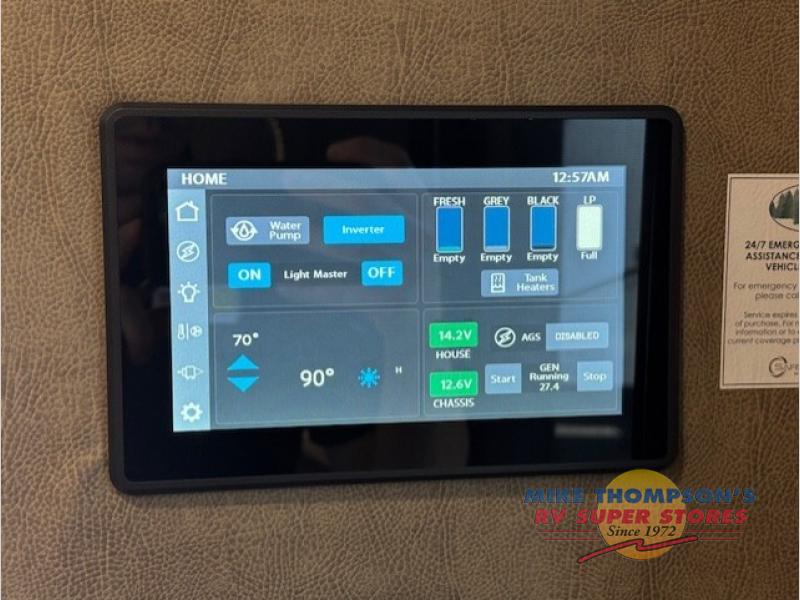 This 24FW Class C diesel motorhome gives you the luxuries of home while traveling on the road! The full wall slide out helps to really open up the interior when you are parked. When you aren't enjoying a meal or playing a card game at the booth dinette, you can head to the rear and relax on the gel-infused memory foam queen-size bed while you watch your favorite movie on the 32" LED TV. You won't have to leave anything behind either thanks to the exterior storage area, the underbed storage, and the overhead cabinets throughout the inside. You're going to love getting clean in the rear corner bathroom with the Oxygenics body spa RV shower head and the residential vanity with a stainless steel sink provides the perfect spot for you to get ready!