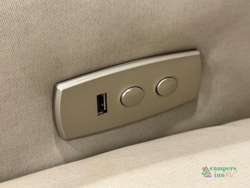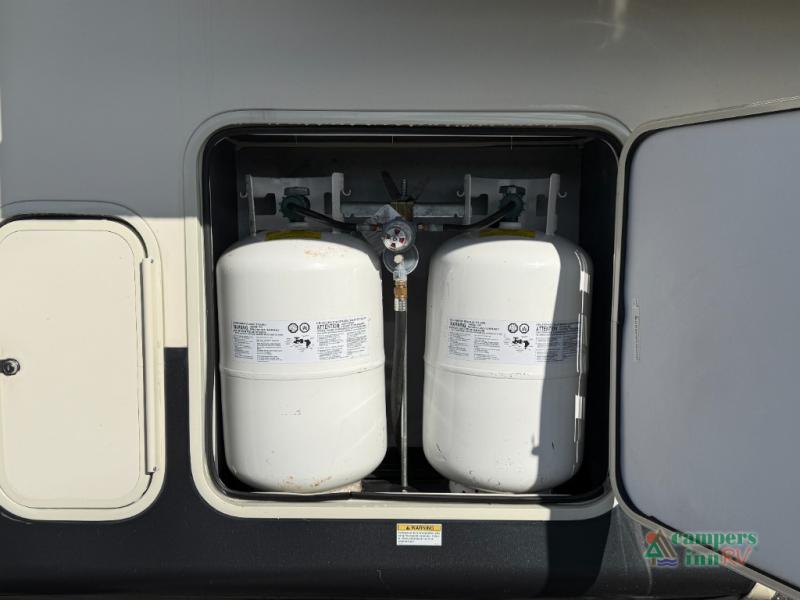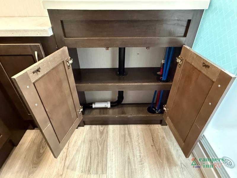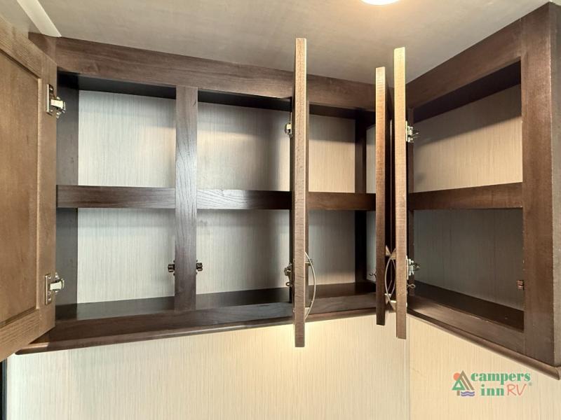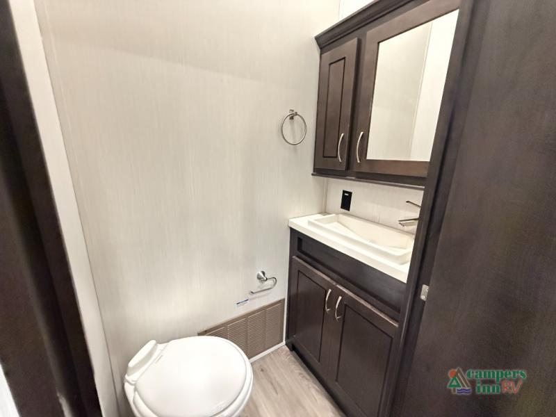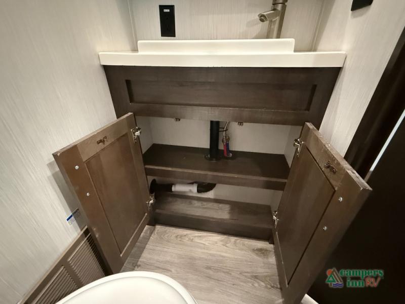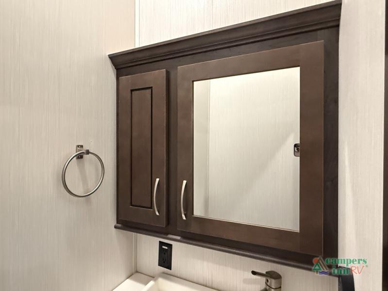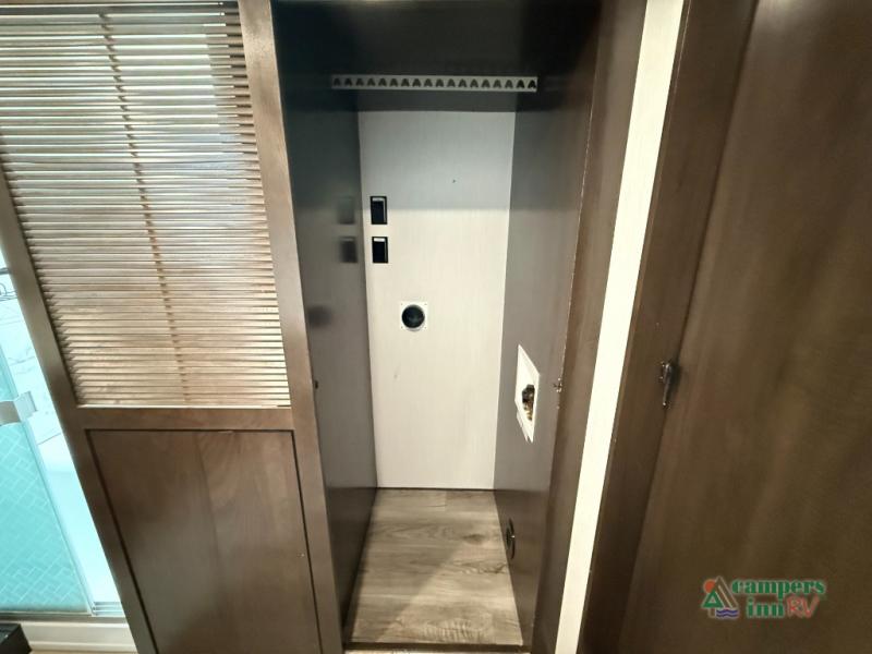 Master bedroom: Includes a king bed slide-out (in many units) with ample storage (dresser, wardrobe) and optional washer/dryer prep.