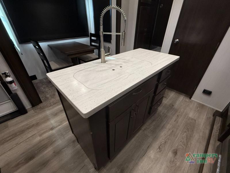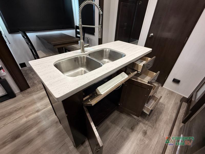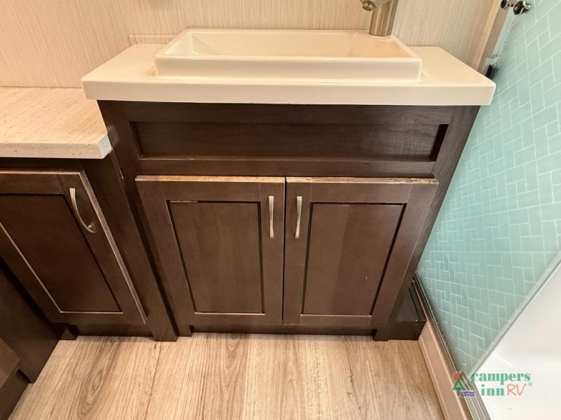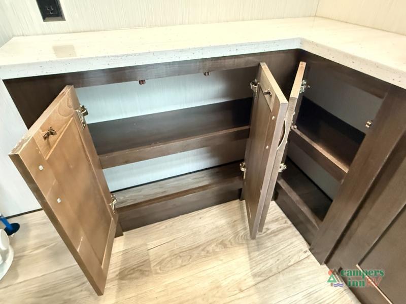 Residential style finishes: Includes solid surface countertops (in many builds), under-mounted stainless sinks, full-extension drawers, and high-end cabinetry.