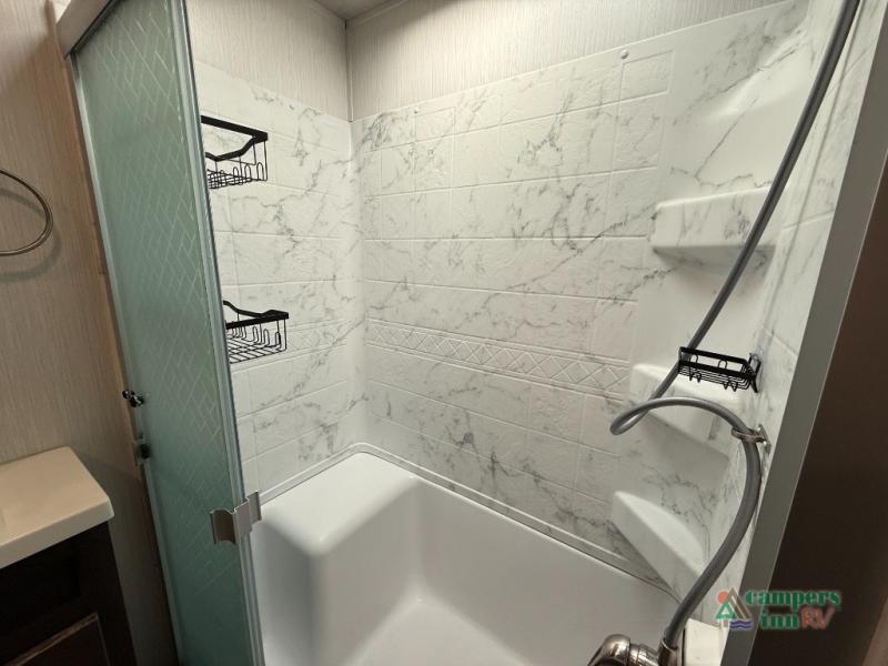 Large bath/shower: A full rear bath with a large rectangular shower and seating.