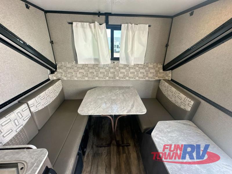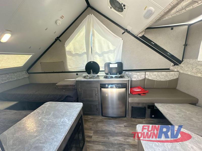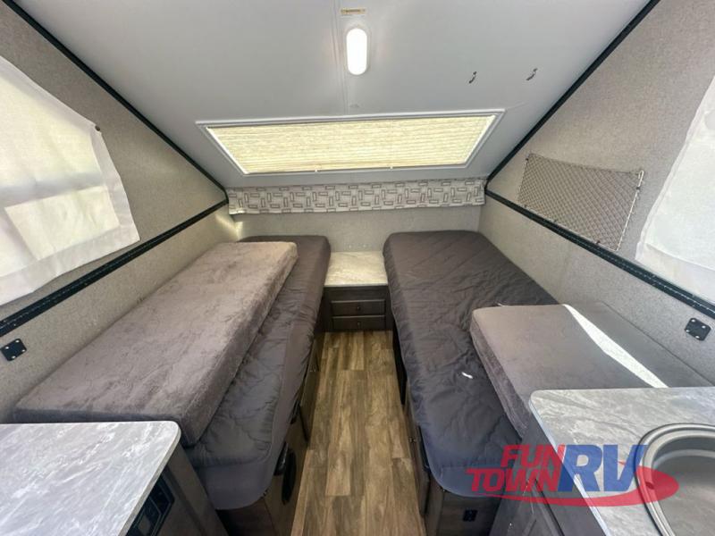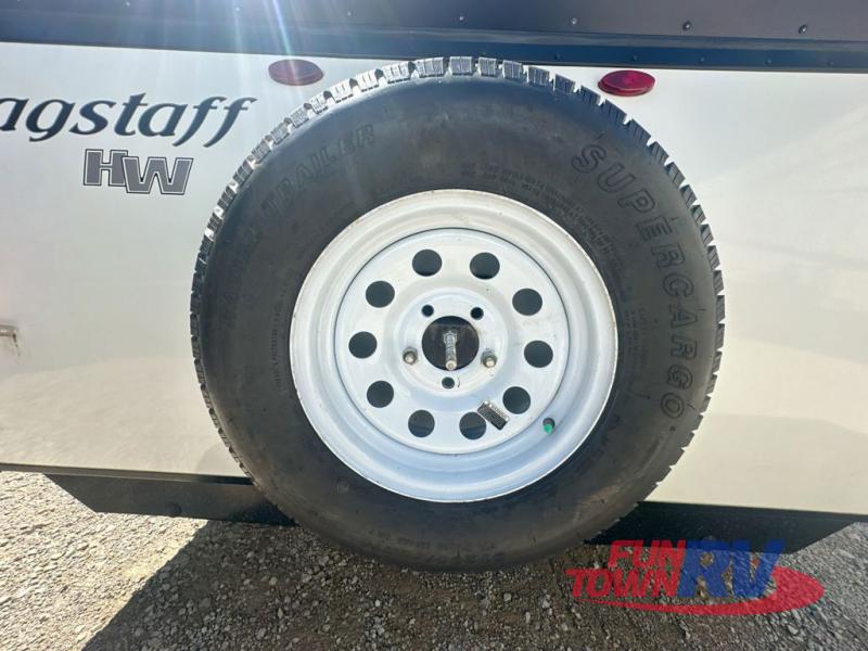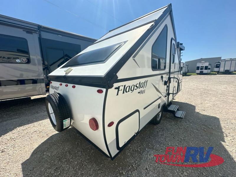 In each Flagstaff SE camping trailer by Forest River RV, you will be delighted with the Toylok mounted locking system, allowing you to lock up your bikes as you head out on a hike. Enjoy a heated mattress, a three speed ventilation fan, and metal full extension drawer guides in each unit. Stay connected to the outside world while you camp with a WiFi Ranger Sky 4 WiFi booster that comes standard in each unit. You'll love to sit outside in the evenings under the awning with LED lights, and with outside speakers and a patio light, you may just stay out under the stars all night. These camping trailers have been constructed with an E-coated tubular steel frame, a chrome diamond plate front and side skirt, and four E-Z crank down stabilizer jacks with sand pads to make your camping trips safe and convenient.