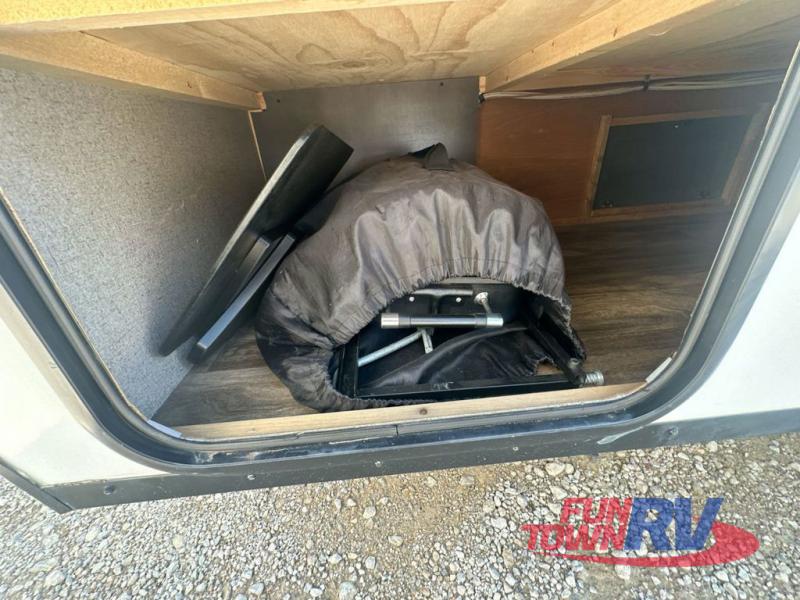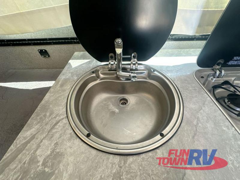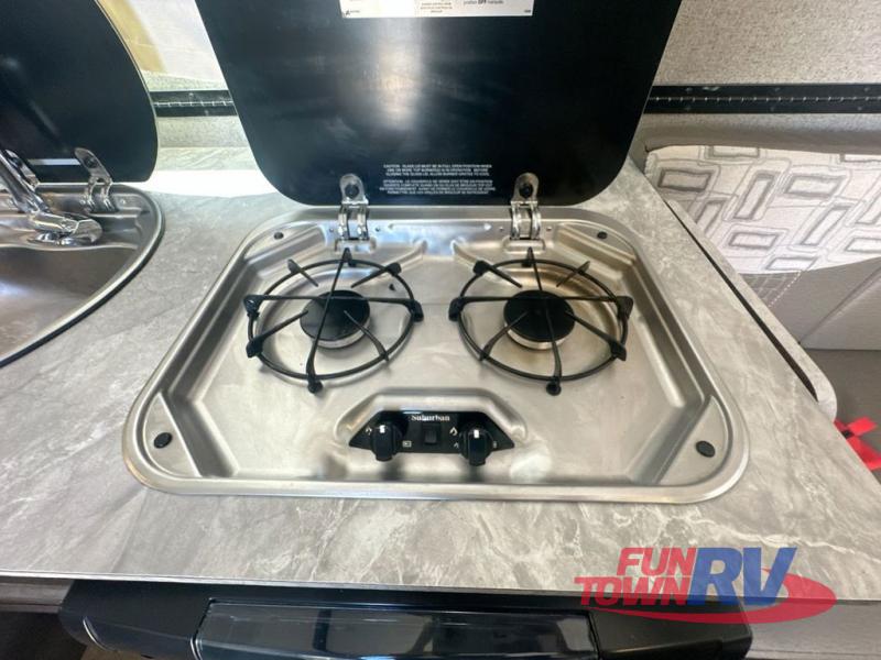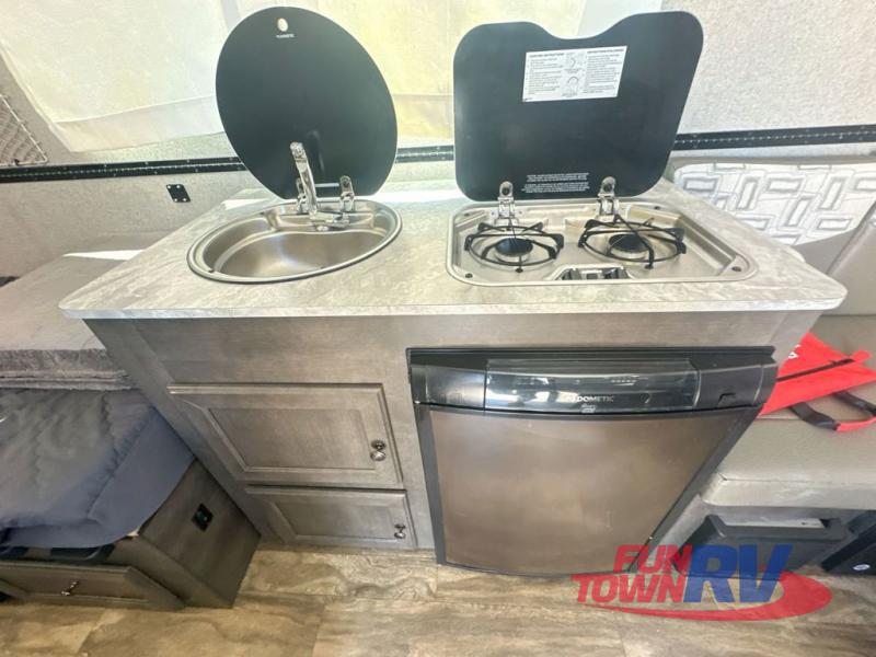 You're going to love this camping trailer that features a hard side and room for four. Bring along the hiking gear or fishing poles with an EZ reach storage trunk, an exterior storage, and a front storage included in this unit. With a sink and a stove with three burners, plus a refrigerator in this trailer, you can store and prepare a full meal just like you do at home. This model features two twin beds with a night stand in between, plus a dinette to enjoy breakfast before your big day. You'll also appreciate the gas grill outside!