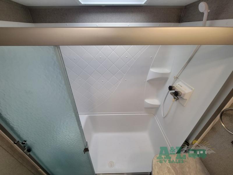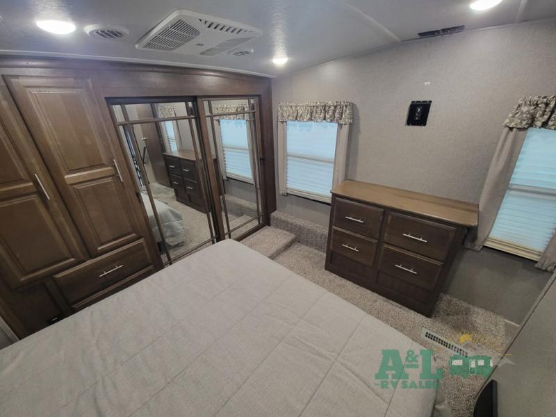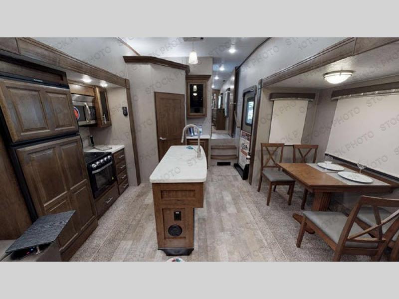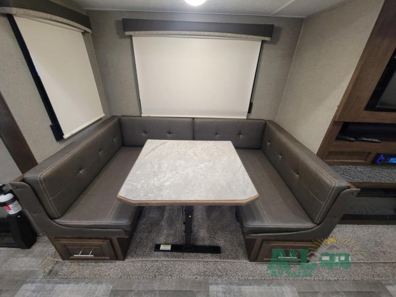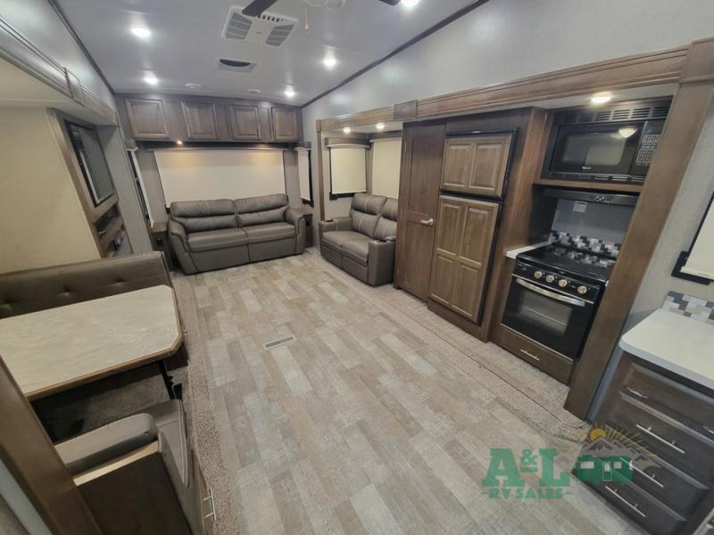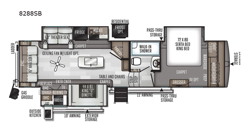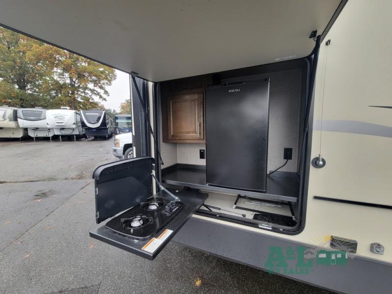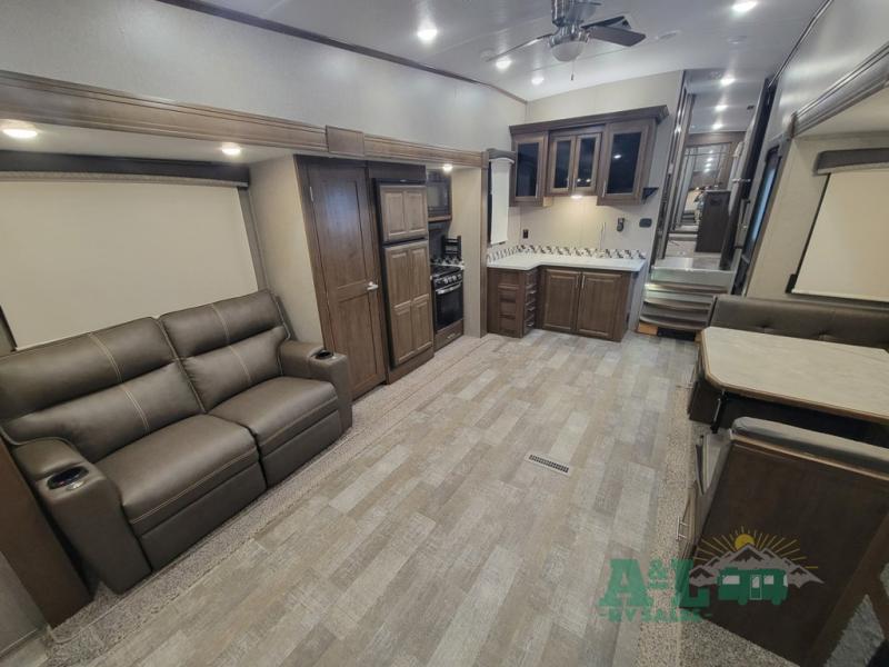 When it's time to upgrade your RV, choose this fifth wheel for maximum comfort, space, and features. The dual opposing slides in the kitchen area open up the whole space so your crew can relax comfortably, and you'll find a third slide out in the front private bedroom for even more space. This model includes a kitchen island so the chef of the family will have more counter space and the large pantry can hold all of the dry goods and snacks. You'll also find an outside kitchen which is great to grill up the catch-of-the-day on! After a day outdoors you can clean up in the full bath that includes a walk-in shower with a seat, then head to the rear living area to relax. Here, you'll enjoy the theater seat that sits directly across from the fireplace and TV and the hide-a-bed sofa will be perfect seating and sleeping space for the kids!