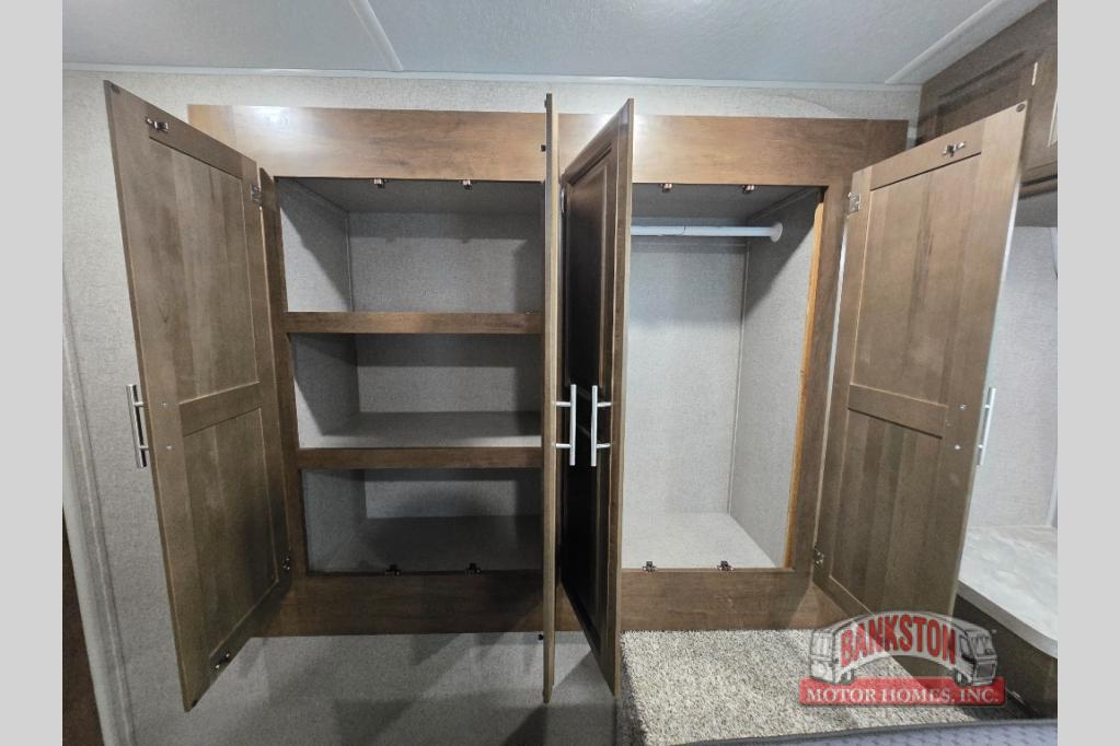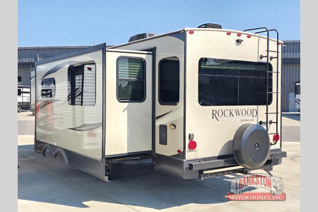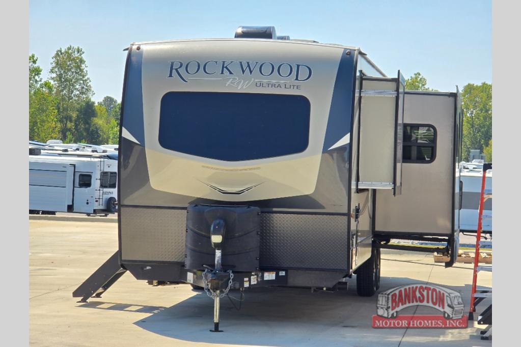 You won't believe how many awesome conveniences have been included in this Rockwood Ultra Lite travel trailer! The large slide opens up the main living area so that you can have a great time with friends gathered on the 67" hide-a-bed sofa, the 44" booth dinette, and the two swivel rockers with end tables. In the kitchen, the chef will have a great time preparing dinner because the countertop extension will add functional space to this area, and the large refrigerator will make it easy to find all of the goodies that you've brought along with you. Once the day has come to a close, you will look forward to jumping into the RV queen Serta bed in the front master suite, and the wardrobe slide will do a great job of keeping your pajamas readily accessible.
