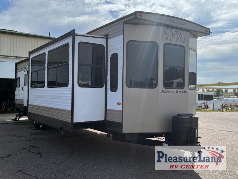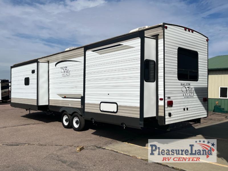 Each Salem Villa Series Estate destination trailer by Forest River is built on a cambered chassis and forged l-beam frame with insulation throughout, 74" tall slide outs, and 96" interior height for lots of head room. Inside you will love the Herringbone pattern luxury vinyl flooring, the smooth finish ceiling panels, the modern wall board, the rustic wood grain, larger counter and cabinet space, upgraded Shaw carpet, and many more "must have" features throughout. Choose the model that fits your home away from home dreams, and start living in serenity!