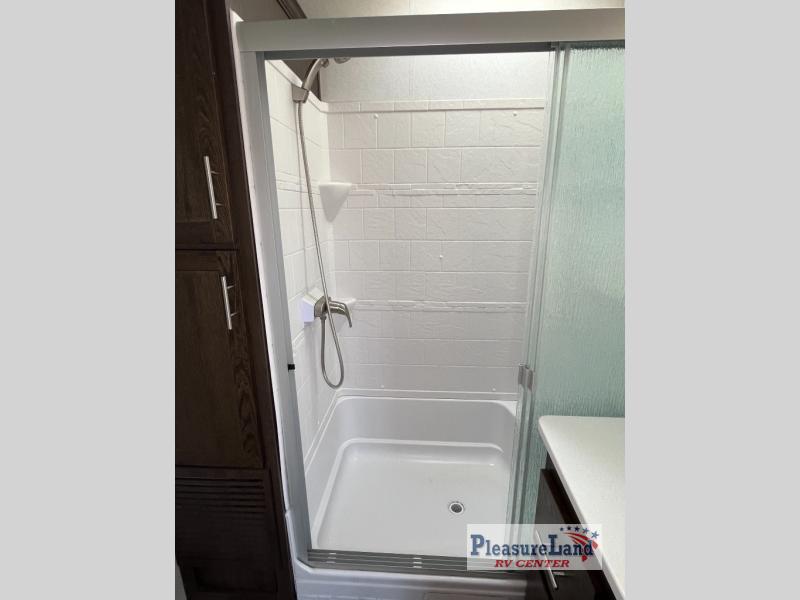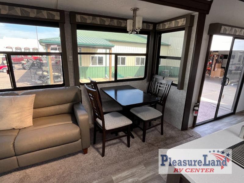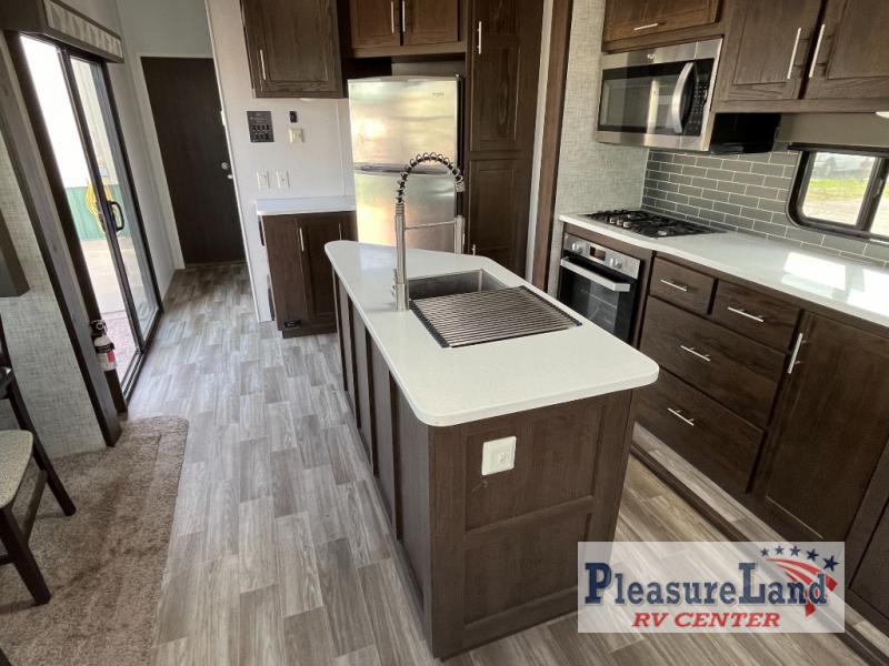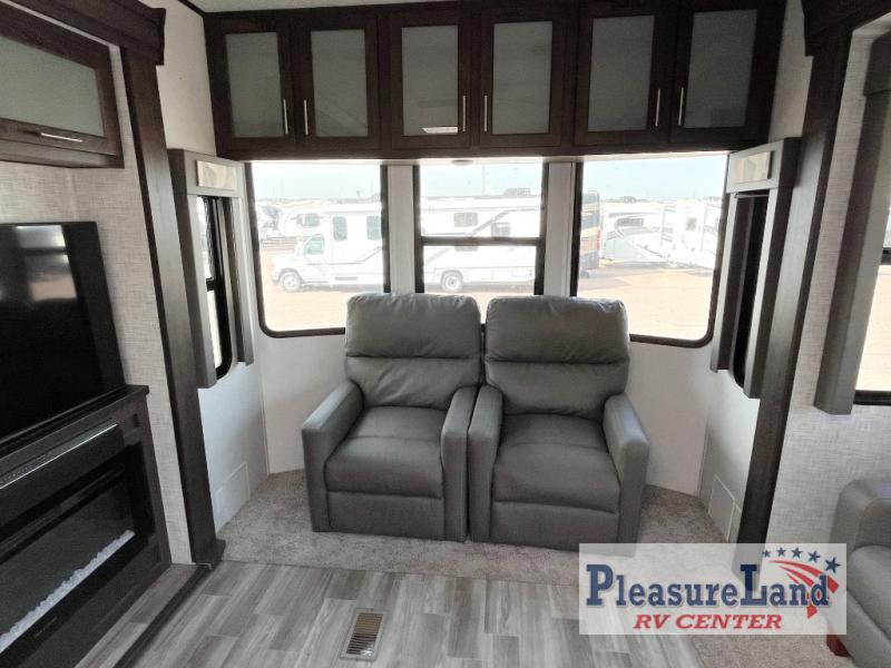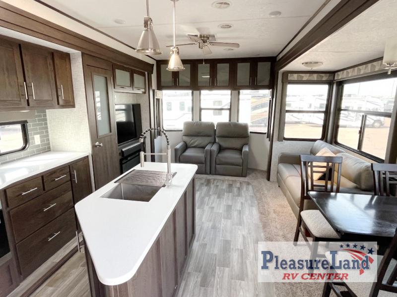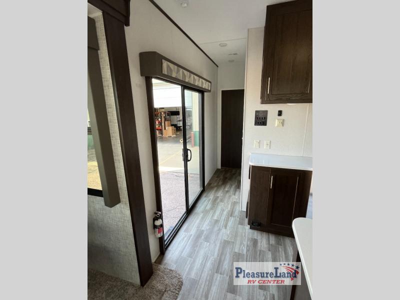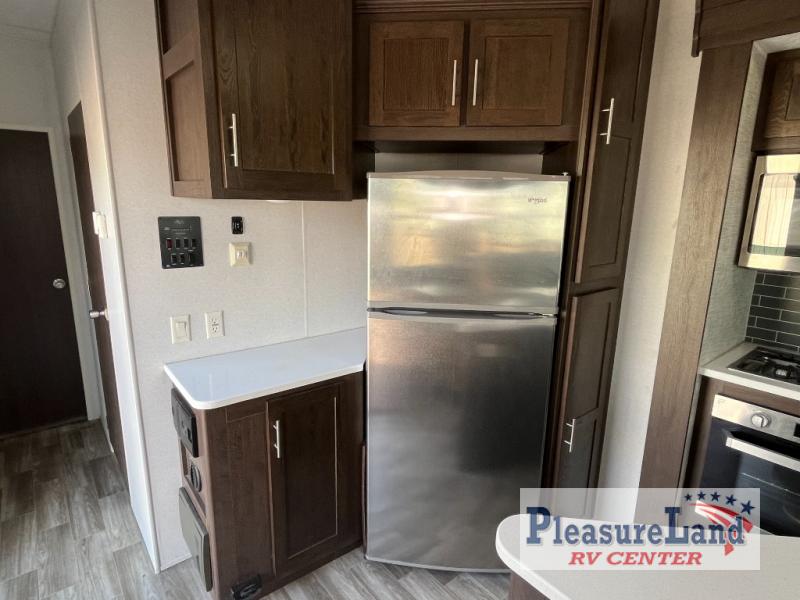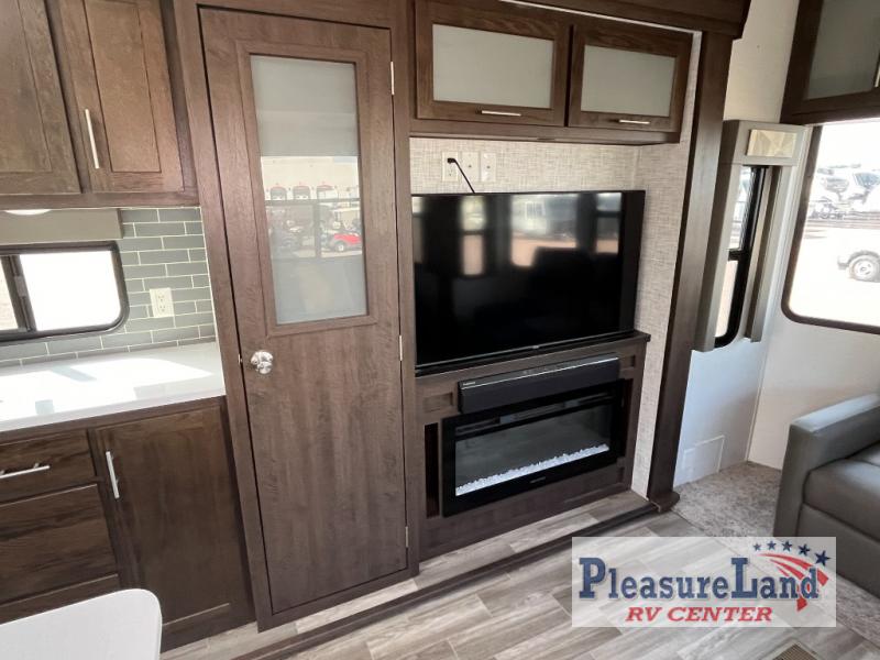 You will enjoy lots of floor space in this trailer that is 8'6" wide and includes two opposing slides in the main living and kitchen area. The unique shape of the kitchen island gives you style like the stainless steel appliances offer, and the walk-in pantry plus residential refrigerator provides more storage for goodies. The fireplace will keep you cozy during the cooler months and the two ceiling fans will keep you cool during the warmer months. When it's time to retreat for the evening, your master bedroom offers a slide out king-size bed and plenty of storage, plus the second entry/exit door. And the seated shower in the full bathroom will keep everyone clean for whatever activity is next such as heading outside the patio doors to relax under the awning or taking a walk around your ranch.