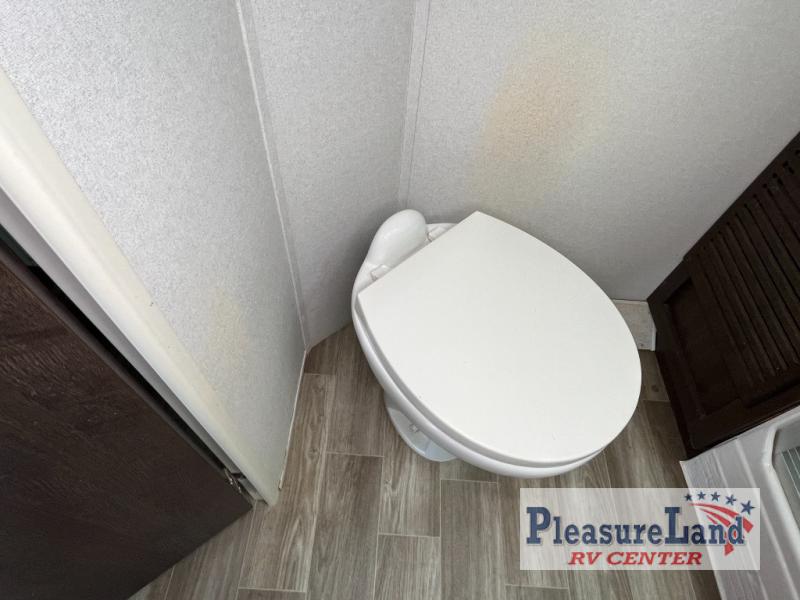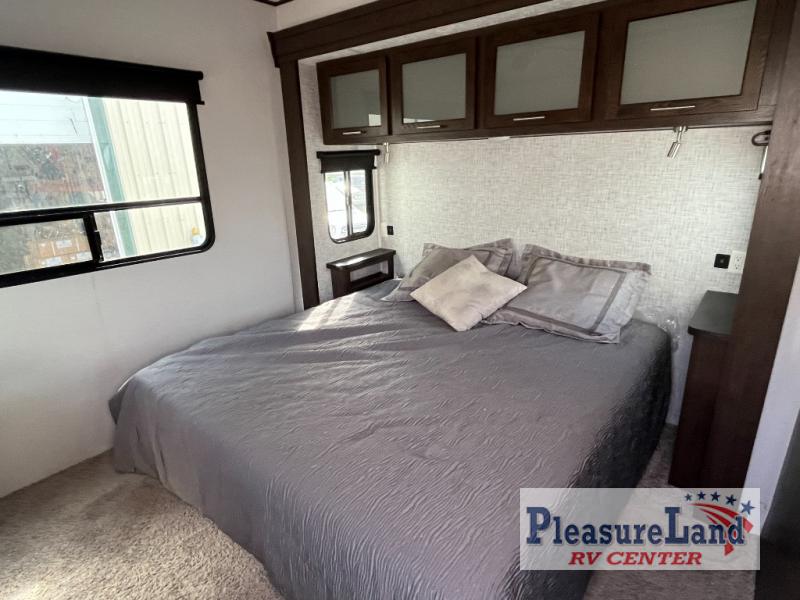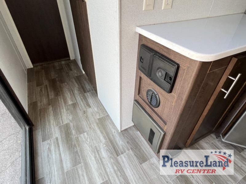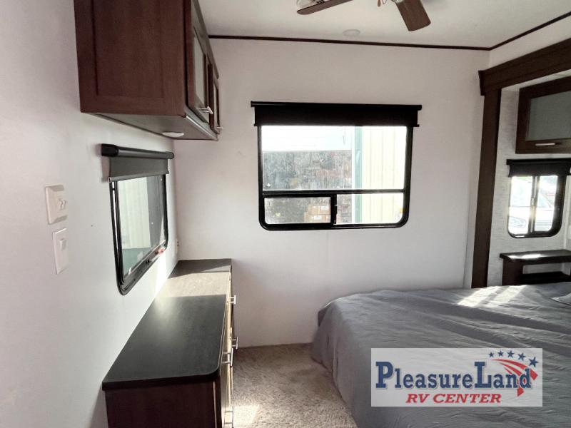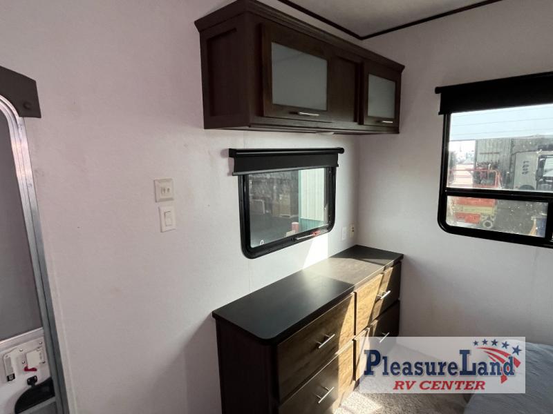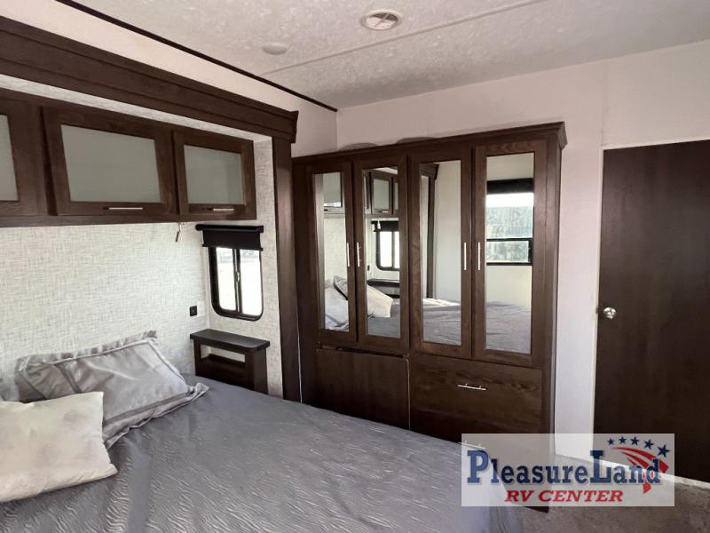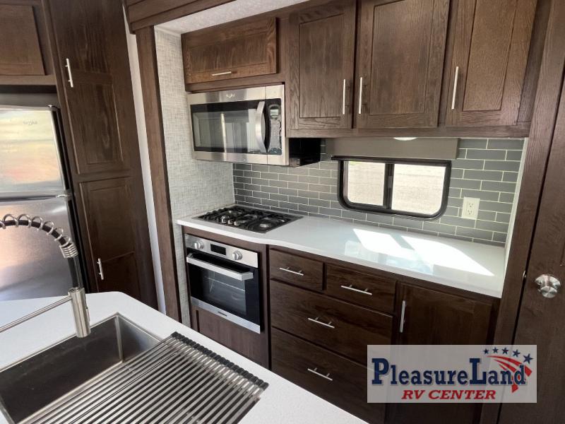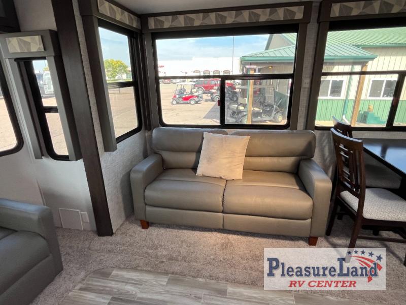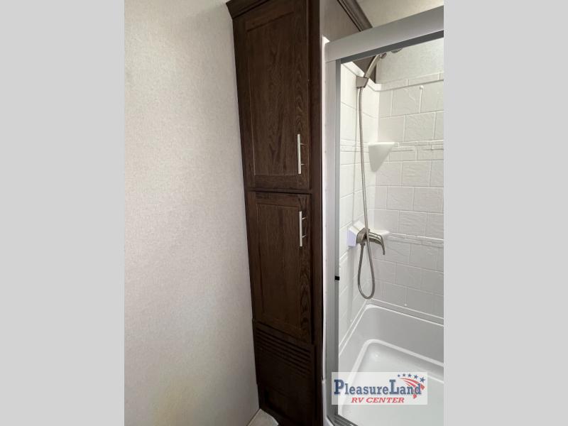 You will enjoy lots of floor space in this trailer that is 8'6" wide and includes two opposing slides in the main living and kitchen area. The unique shape of the kitchen island gives you style like the stainless steel appliances offer, and the walk-in pantry plus residential refrigerator provides more storage for goodies. The fireplace will keep you cozy during the cooler months and the two ceiling fans will keep you cool during the warmer months. When it's time to retreat for the evening, your master bedroom offers a slide out king-size bed and plenty of storage, plus the second entry/exit door. And the seated shower in the full bathroom will keep everyone clean for whatever activity is next such as heading outside the patio doors to relax under the awning or taking a walk around your ranch.