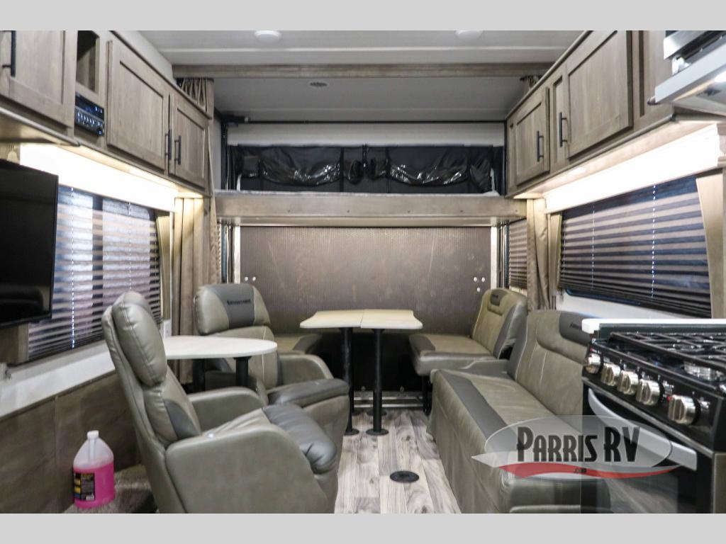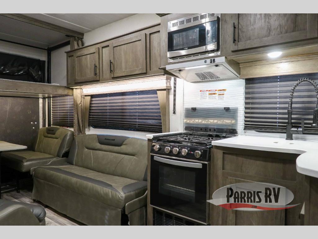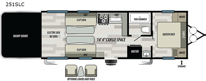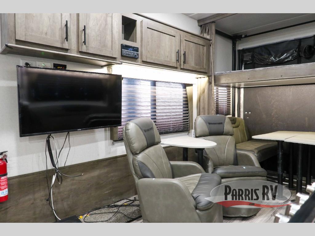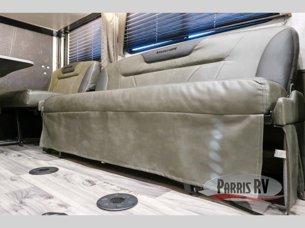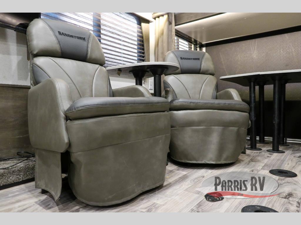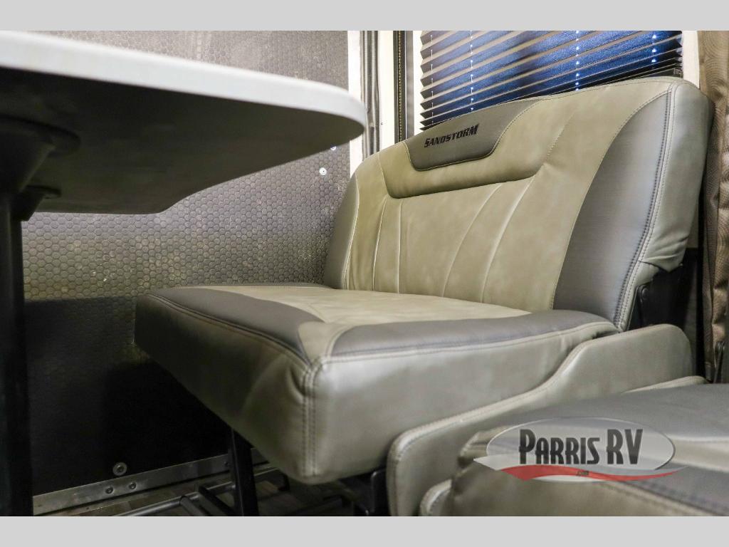 Step inside this Sandstorm toy hauler and experience a camping trip like none other! With 14' 4" of cargo space and 1,200 lb. tie downs mounted to steel, you can be sure your off-road toys will make it to your destination safely. There is plenty of room for everyone with the rear electric bed with a sofa below, two opposing sofas beside it, and a front private bedroom with a queen-size bed. Plus, you can switch out one of the sofas to add the optional chairs with table. The separated bath makes it easy for one person to clean the mud out of their ears while another washes up for dinner!