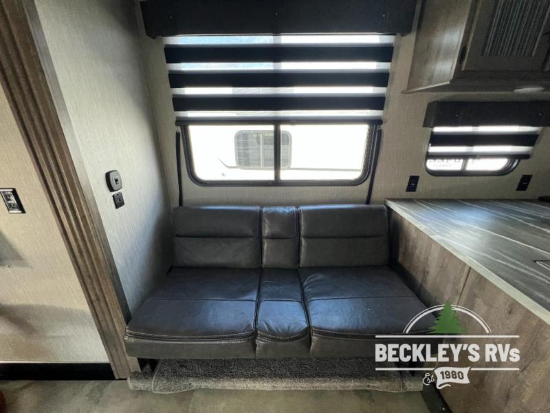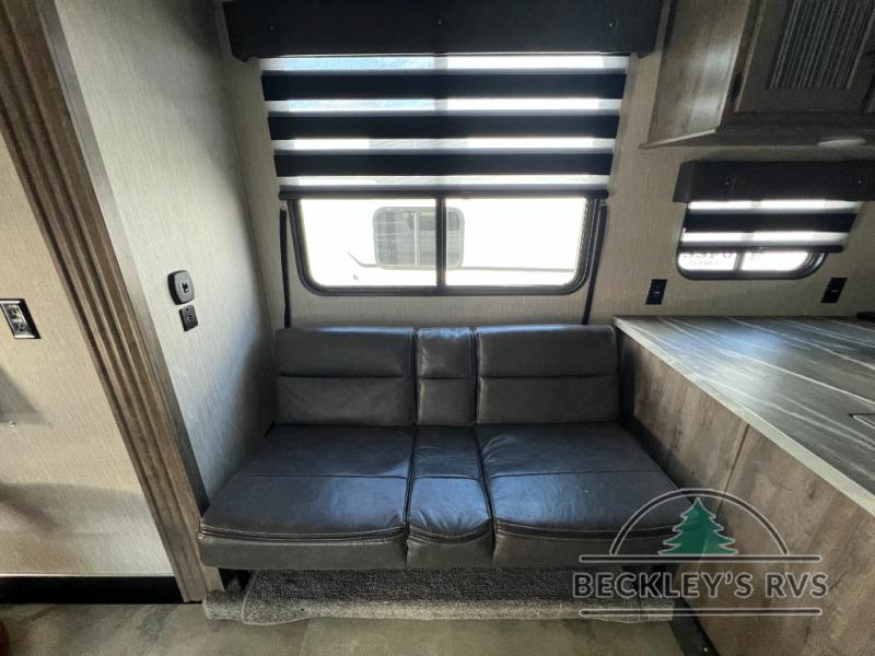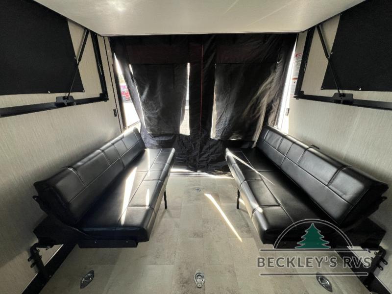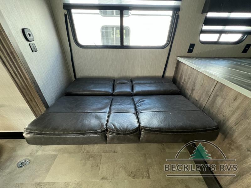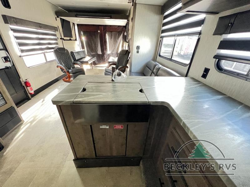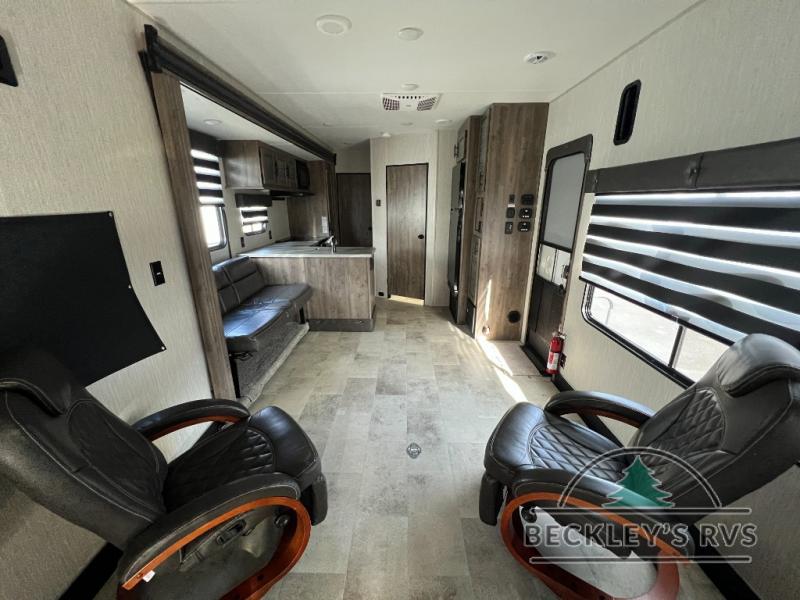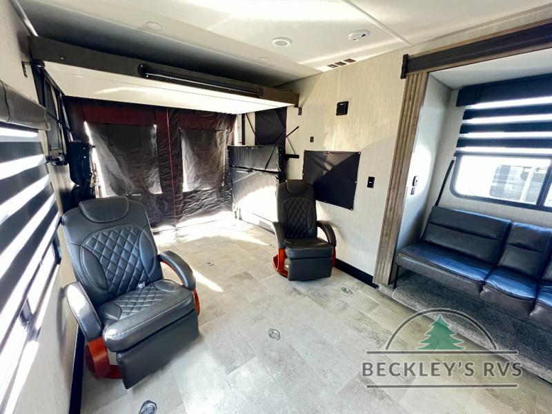 The front master suite in this Vengeance Rogue toy hauler is easily accessible from all angles! You can get to the king-size bed through the main bedroom entrance, from the dual-entry bathroom, or from the second exterior entry door. The quick-set queen bed system that is made up of roll-over sofas and a table will be helpful to have when your friends turn into overnight guests, and the two lounge chairs will give you a place to sit down and chat.