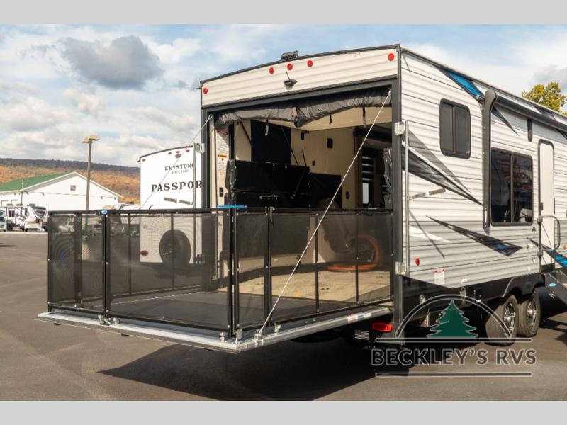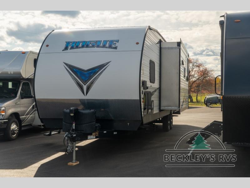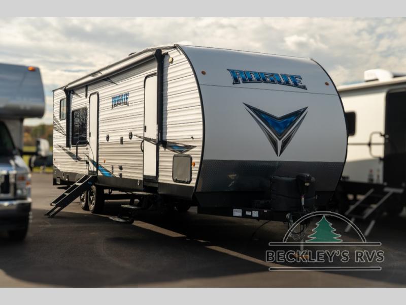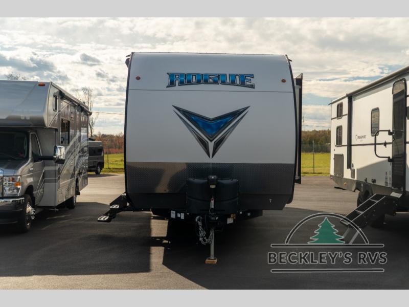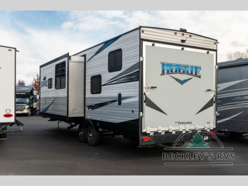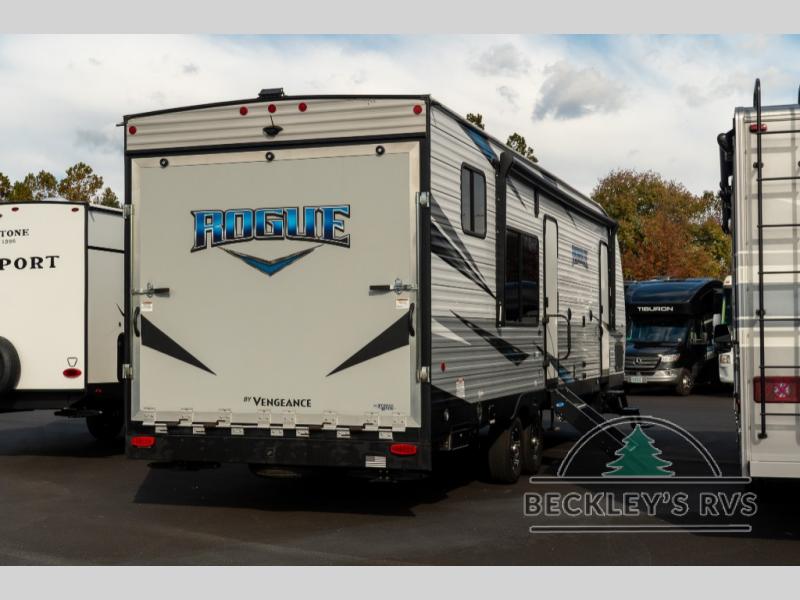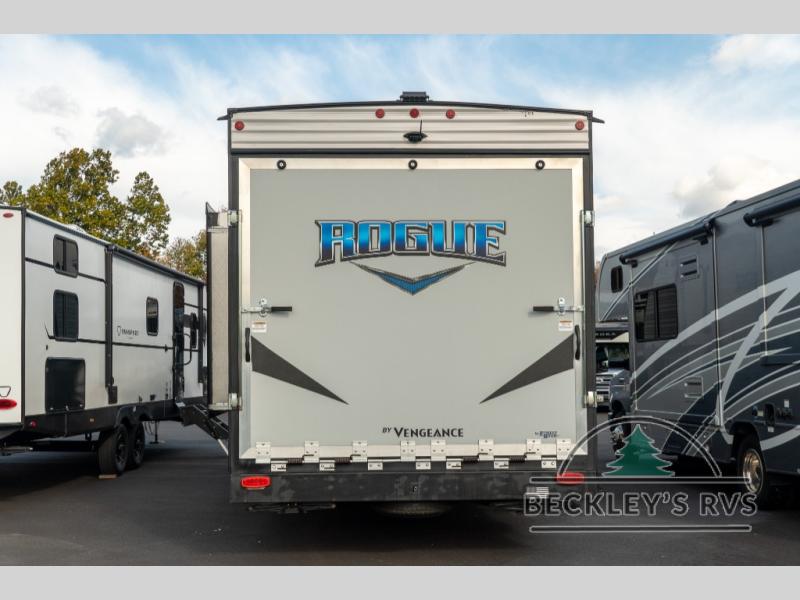 For any outdoor adventure, you will want a Vengeance Rogue toy hauler by Forest River! Each model features a ramp door patio system providing you an above-ground outdoor living space and a screen wall/tent wall to separate the inside from the outside without giving up any fresh air. With the enclosed underbelly, you can now camp in all types of weather, and after a day of playing outdoors, you will enjoy washing off the dirt at the outside shower. Inside, you will appreciate the multiple USB charging stations and the One Control system for lights, slides, monitor panel, and awning. Go Rogue today!