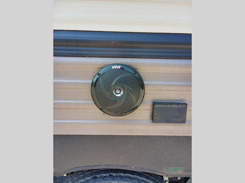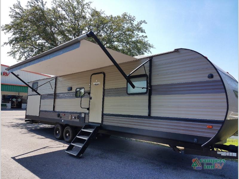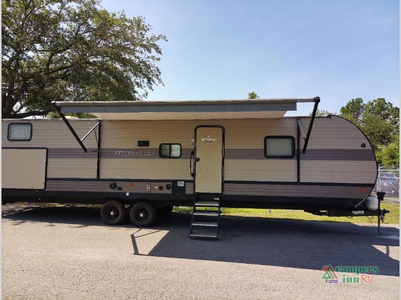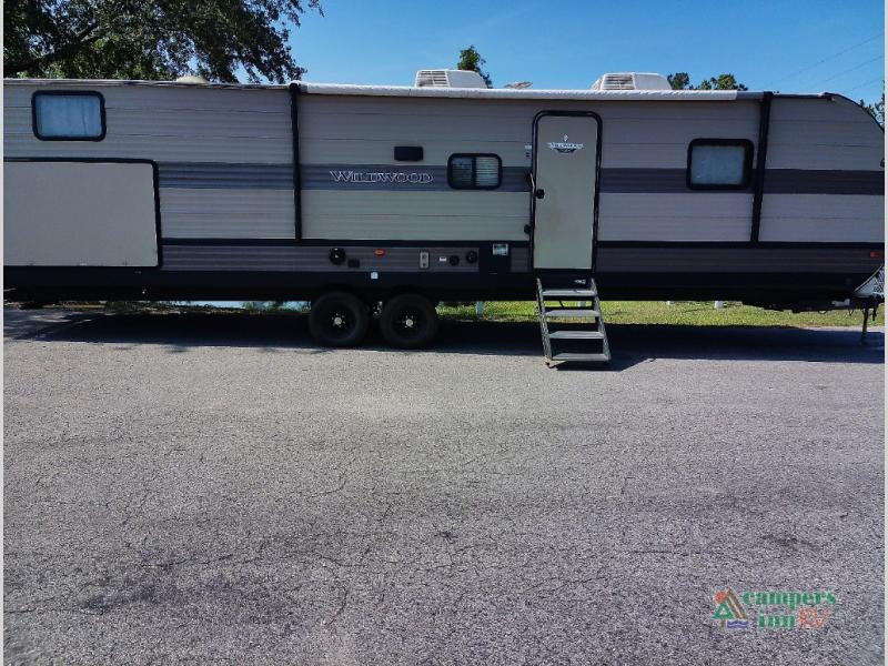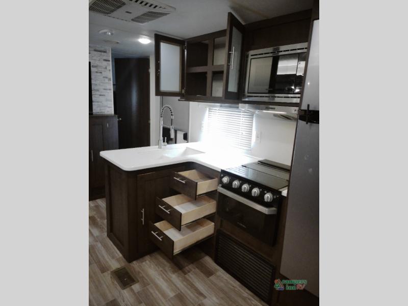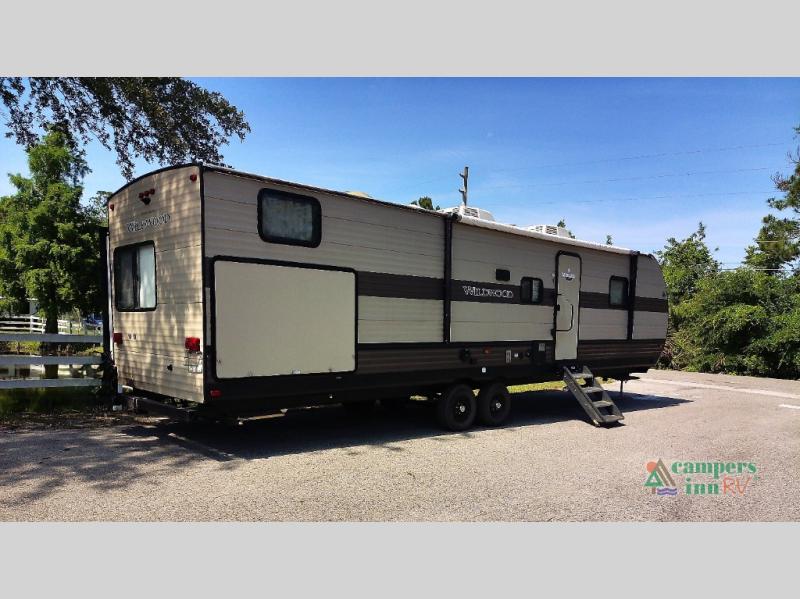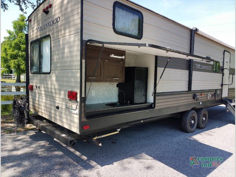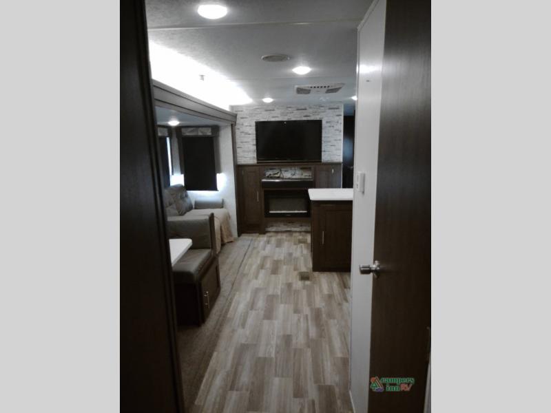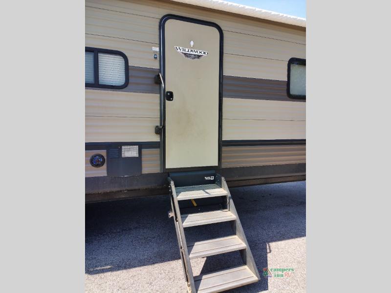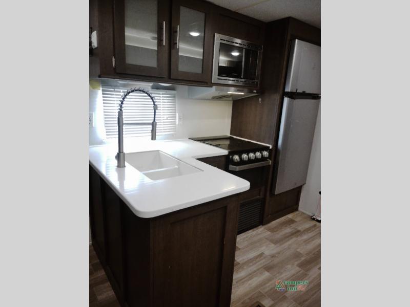 With each Midwest region Wildwood travel trailer by Forest River you will enjoy many interior comforts, like the Herringbone pattern luxury vinyl flooring, the Evergreen mattress, the tub surround, plus much more. There is a fully walkable one piece roof that will make cleaning off the top of your unit a snap, each model is also constructed with a powder coated I-beam frame and a tough coat paint exterior. The power awning with adjustable legs will provide an outdoor living space, and the exterior speakers with a blue LED light will keep the party going!