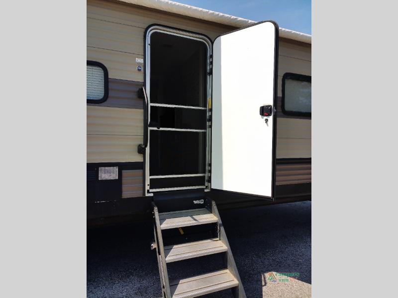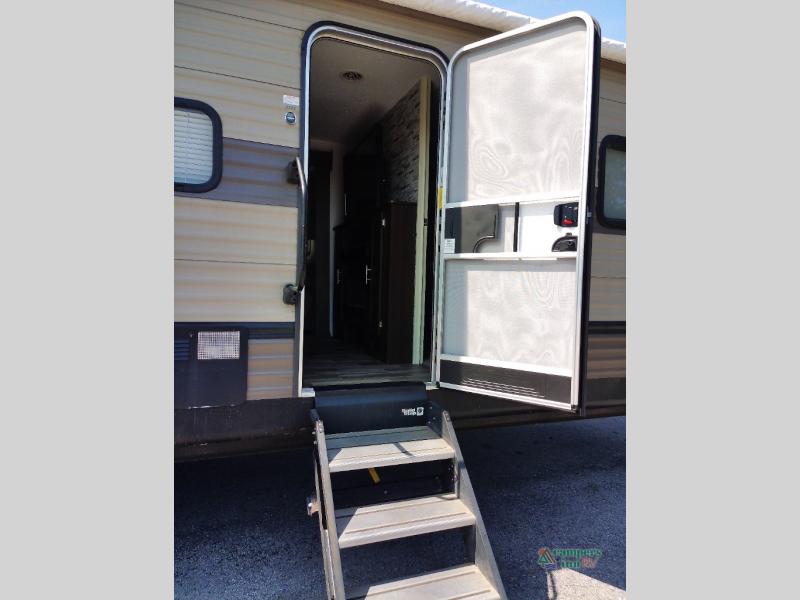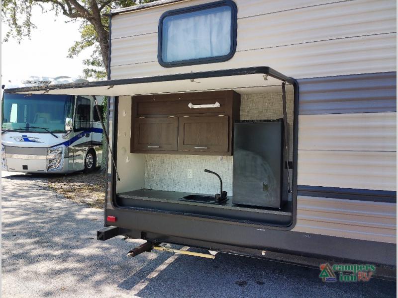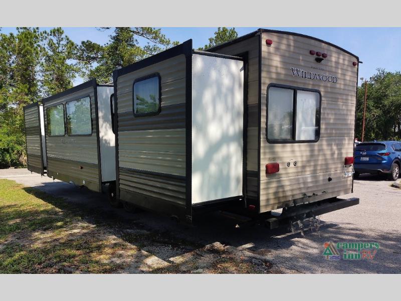 Been searching for the perfect travel trailer for your family? This Wildwood might just be the RV you have been looking for. Just imagine hiking, biking and playing horse shoes at your favorite campground to return to plenty of space for everything thanks to the triple slides, one in each room. The kiddos will surely head to the rear private bunkhouse to claim a bunk bed while you take a nap on the custom king bed in the front bedroom. You might even put a load of clothes in the washer and dryer if you chose to add that option. You can then make dinner on the outside kitchen or in the full kitchen inside. Everyone can play games or relax on the dinette and U-shaped Versa Lounge and sofa before heading outside to see the stars. Check it out!