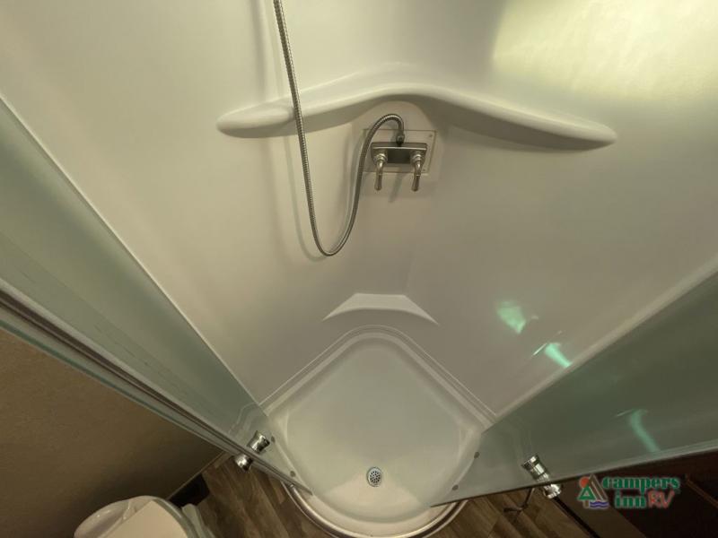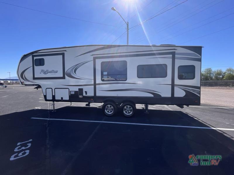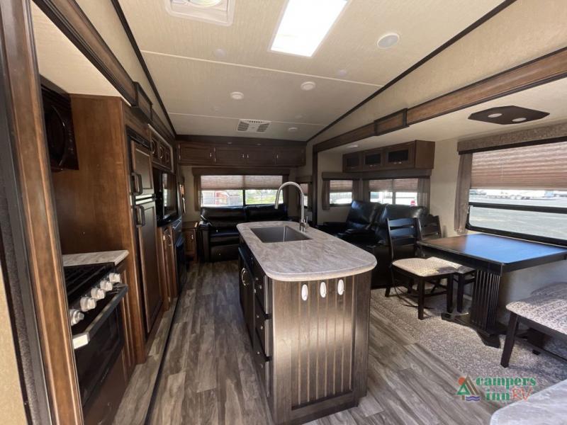 This Refection fifth wheel allows you to cook in a gourmet kitchen with a center island and large sink, plus watch your favorite movies on the 40" TV while keeping warm and cozy from the fireplace below. Your spouse may even be watching the TV from the theater seats or napping on the tri-fold sofa. When it's time for bed, you can get cleaned up in the radius shower located in the dual entry bath, and then sleep on a queen bed inside the front private bedroom. You will find plenty of storage throughout for your clothes, dry goods, games, and blankets, plus there is an exterior unobstructed pass-through compartment that allows you to store larger items. It's time to get moving and start living the dream!