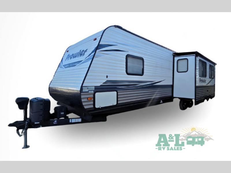 The Heartland Prowler travel trailers and toy haulers are constructed with aluminum exterior metal sides, a cambered structural steel I-beam frame, 5/8" Dyna Span floor decking, and a diamond plate stone guard to provide a strong, durable unit made to last. The blue exterior LED frame rail lights and speakers will turn heads at the campground, and with a finished pass-through storage, you can bring along all your camp gear. Each model includes all the kitchen amenities you may need while away from home, including a double-door refrigerator with a freezer, a microwave oven, ball-bearing drawer guides, and a stainless steel pull-out faucet to make clean-up a breeze. You'll appreciate the quick recovery gas/electric DSI water heater, the 13,500 BTU ducted A/C, and the in-floor ducted heat to keep you comfortable in any season.