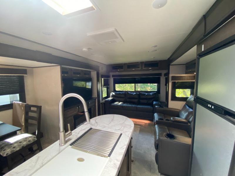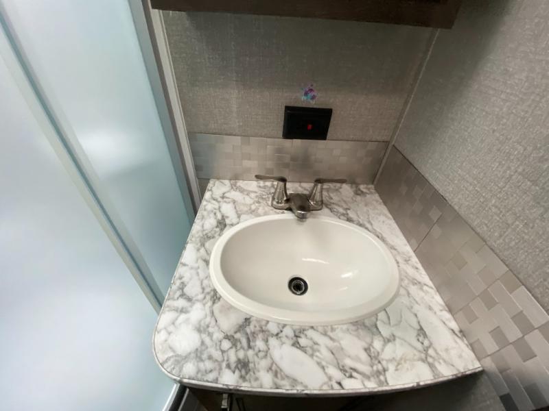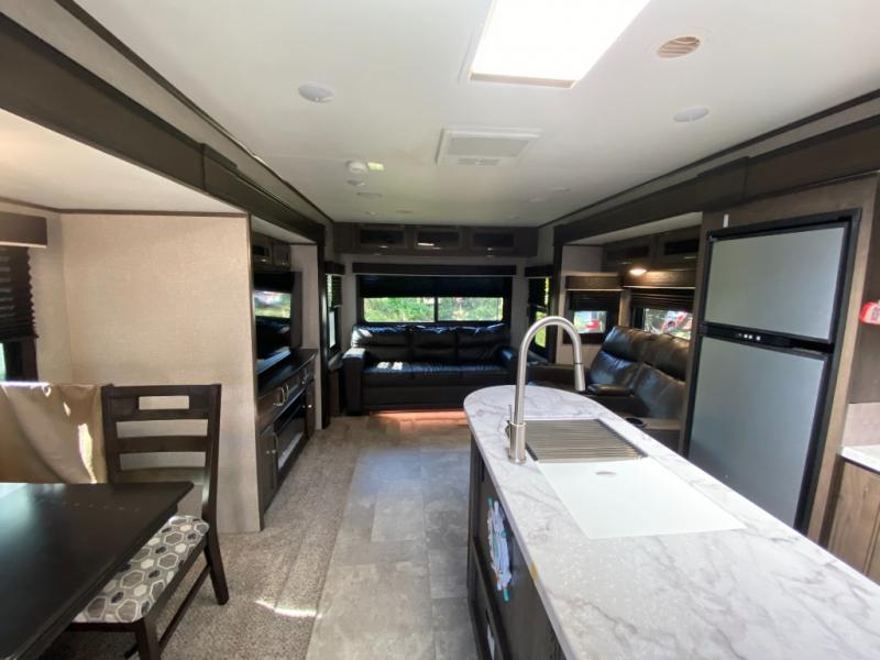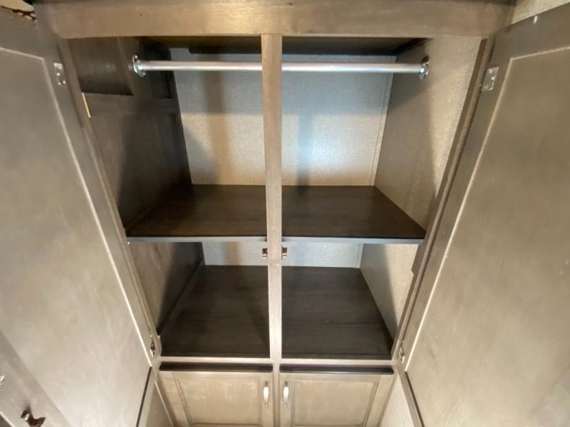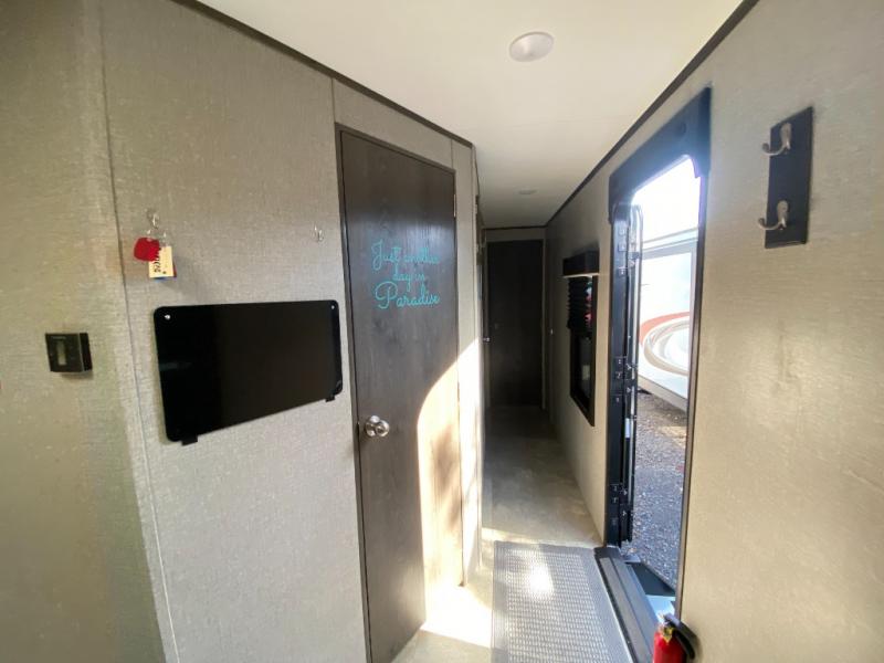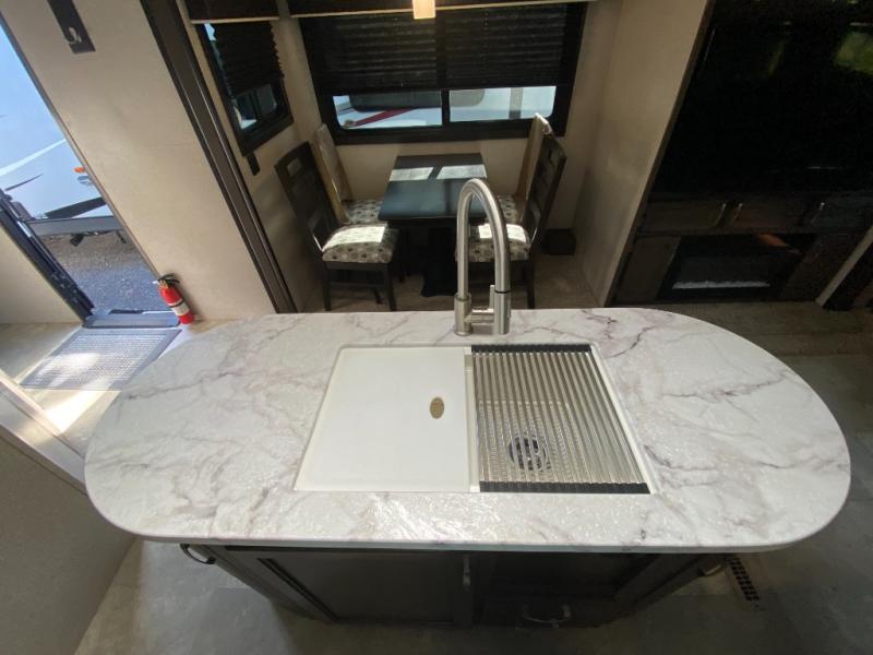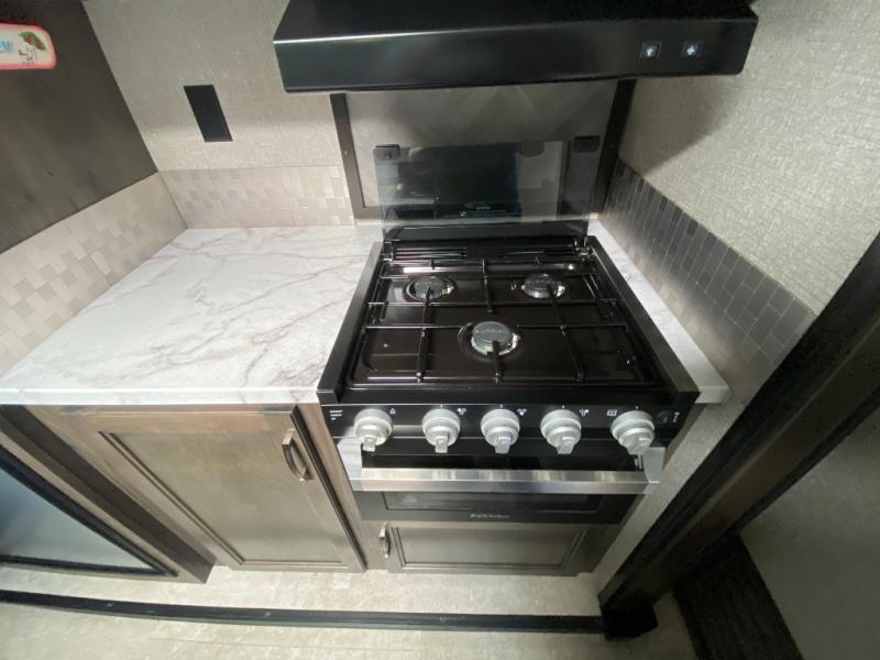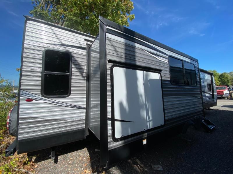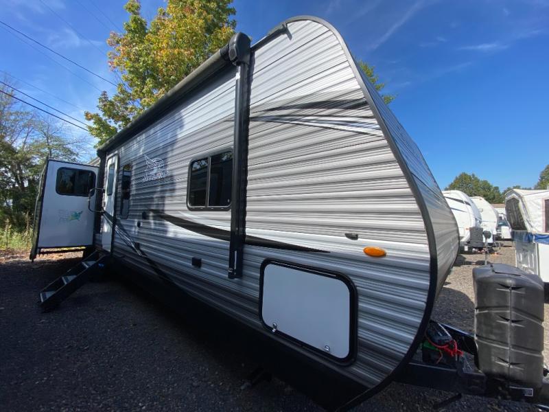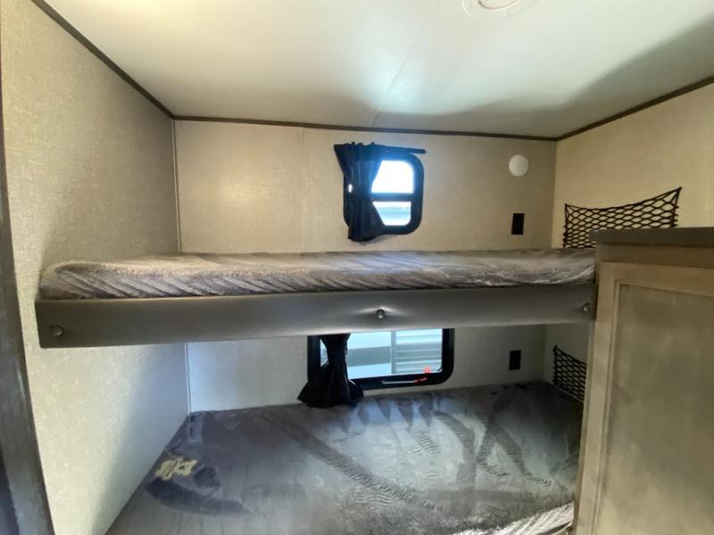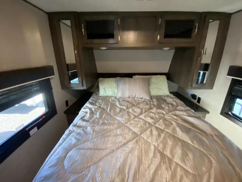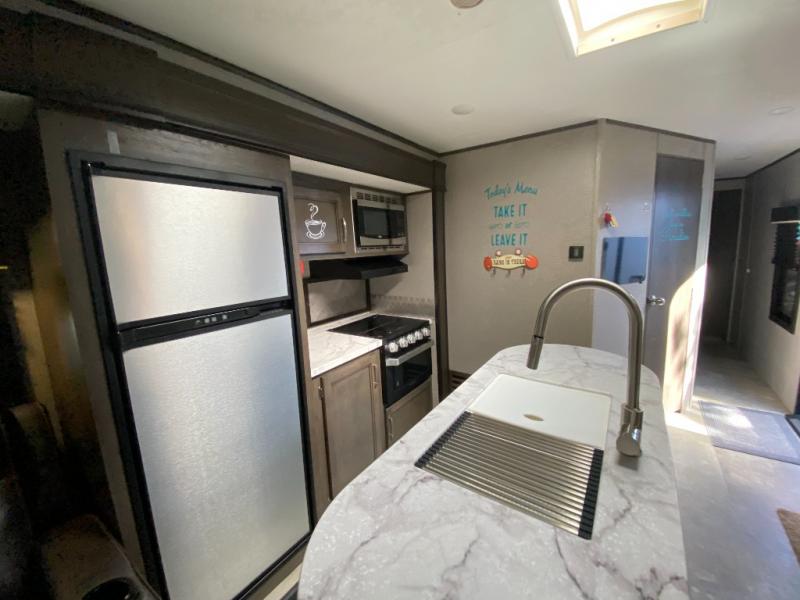 With its stainless steel appliances, island, and residential faucet with pull-out sprayer in the kitchen, you will love spending your time cooking up a delicious dinner in this Jay Flight travel trailer! You also have the choice to prepare dinner outside because of the outdoor kitchen that has been included, and if you want to eat inside so that you are protected from unwanted bugs, you can sit down at the free-standing table to enjoy your meal. Plus, at the end of a long and tiresome day, nothing will feel better than retiring to your own private master suite.