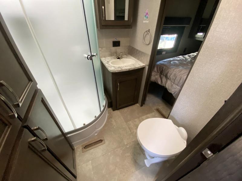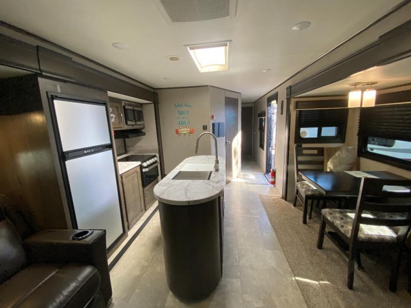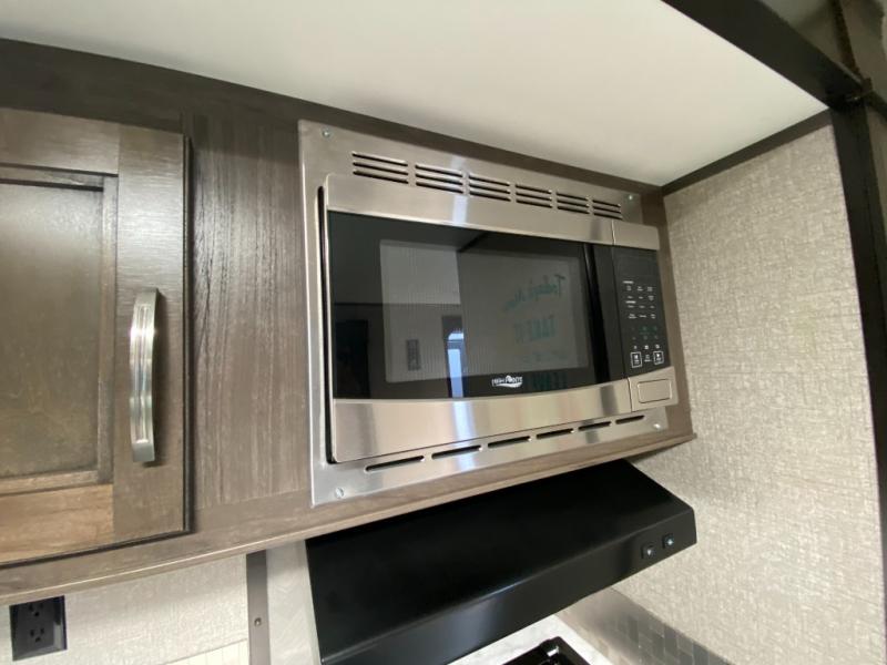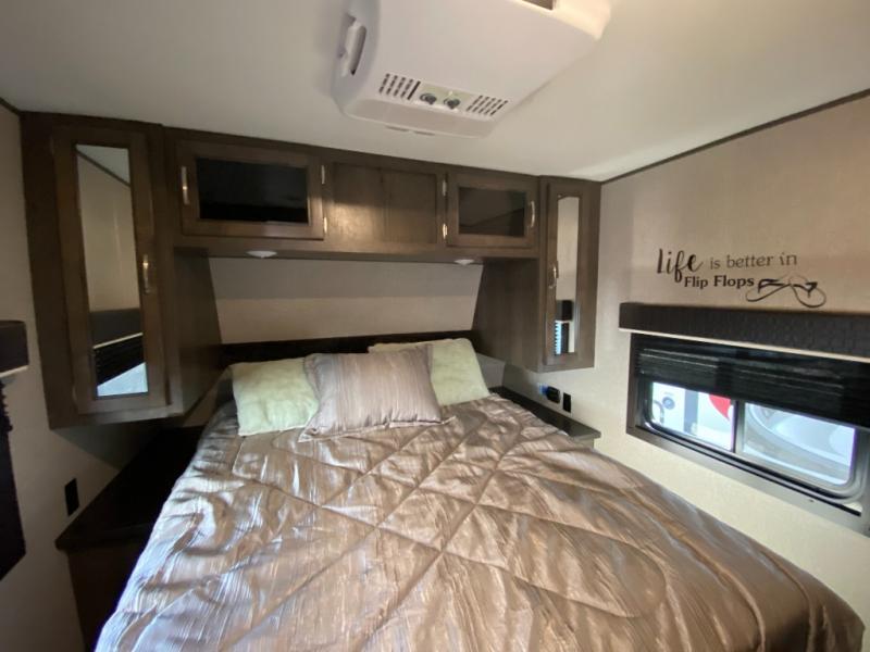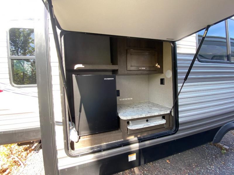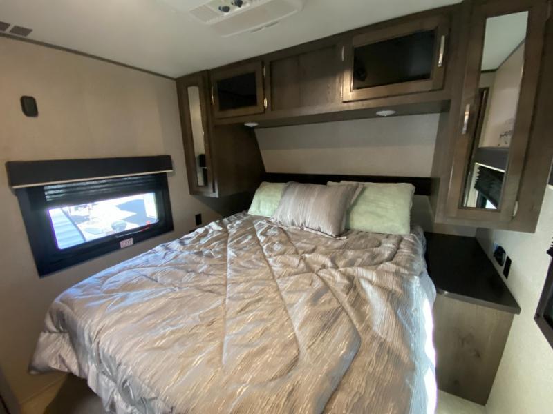 With its stainless steel appliances, island, and residential faucet with pull-out sprayer in the kitchen, you will love spending your time cooking up a delicious dinner in this Jay Flight travel trailer! You also have the choice to prepare dinner outside because of the outdoor kitchen that has been included, and if you want to eat inside so that you are protected from unwanted bugs, you can sit down at the free-standing table to enjoy your meal. Plus, at the end of a long and tiresome day, nothing will feel better than retiring to your own private master suite.