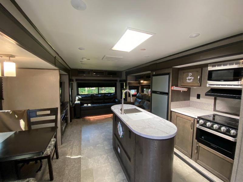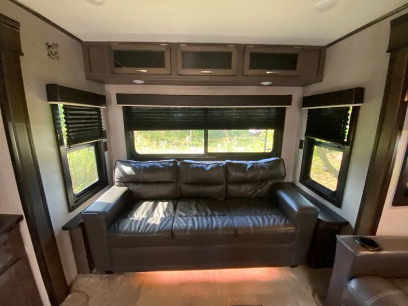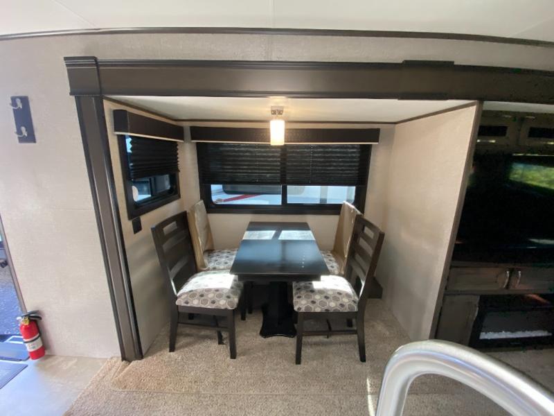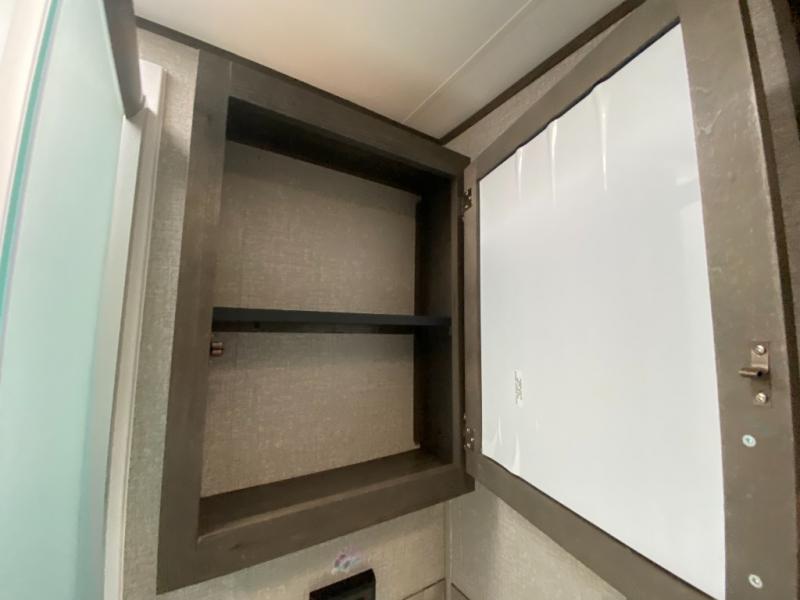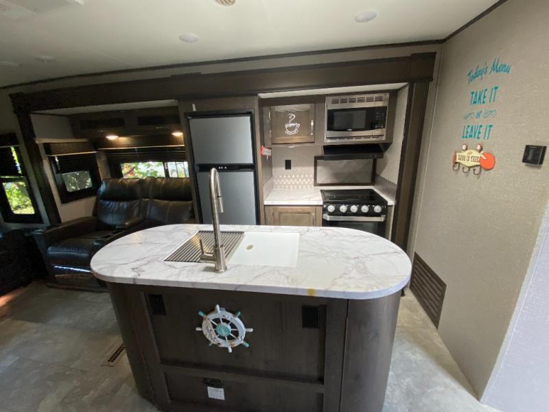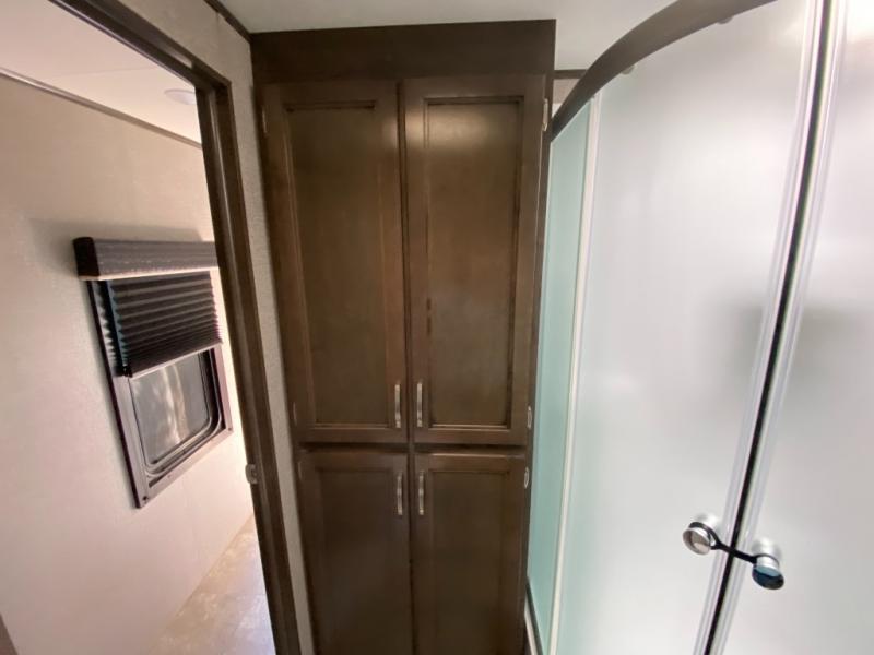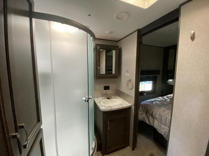 With its stainless steel appliances, island, and residential faucet with pull-out sprayer in the kitchen, you will love spending your time cooking up a delicious dinner in this Jay Flight travel trailer! You also have the choice to prepare dinner outside because of the outdoor kitchen that has been included, and if you want to eat inside so that you are protected from unwanted bugs, you can sit down at the free-standing table to enjoy your meal. Plus, at the end of a long and tiresome day, nothing will feel better than retiring to your own private master suite.