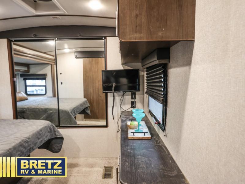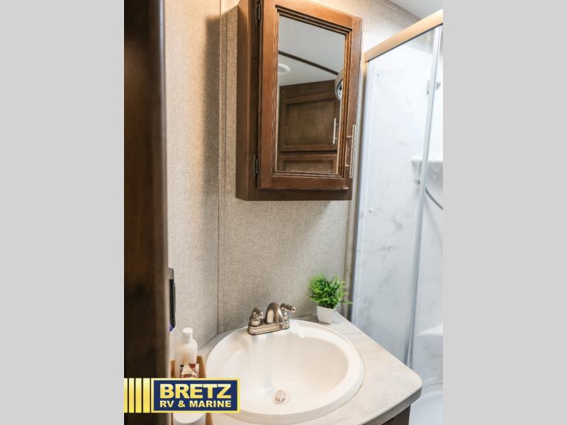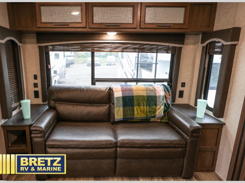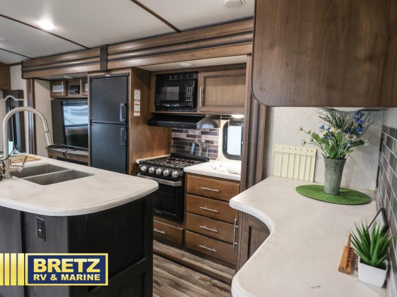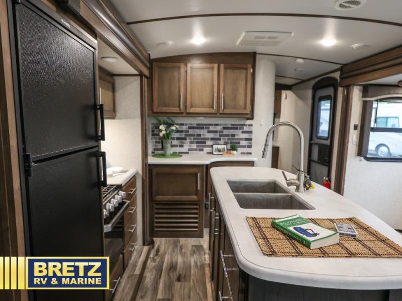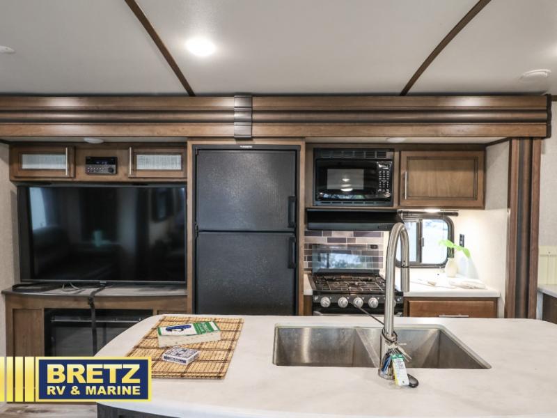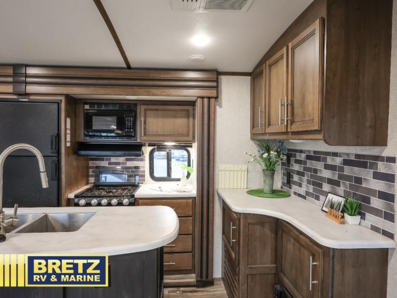 A kitchen island with a gourmet sink and chef's sprayer faucet creates an inviting space in which to prep dinner each evening with this Cougar Half-Ton travel trailer! Not only that, but this model also comes with a 21" Furrion range with Piezo ignition and microwave oven so that you can have all of the same dishes you love to make at home. The front private bedroom is spacious and accommodating with its king bed slide, full-length wardrobe, and dresser, and the rear living area is just as great because it has an entertainment center that everyone can watch from the comfort of the theater seating or sleeper sofa.