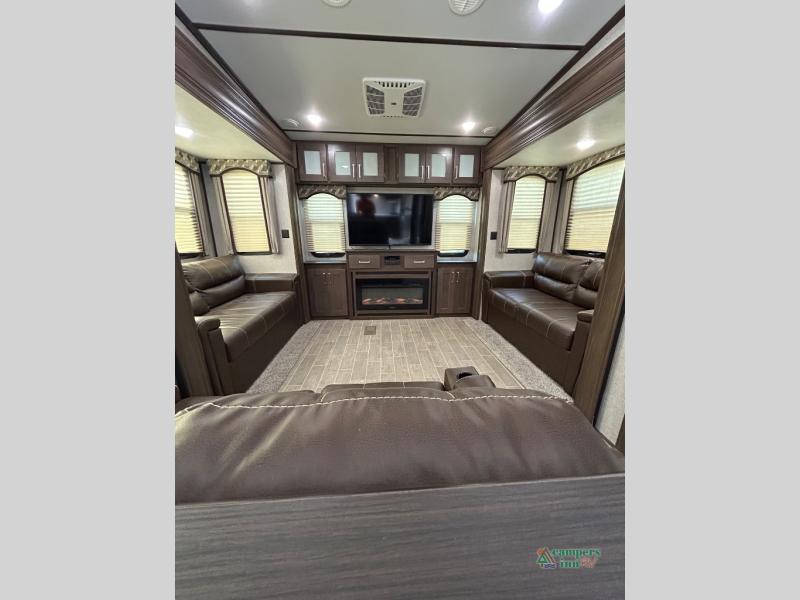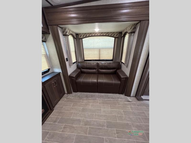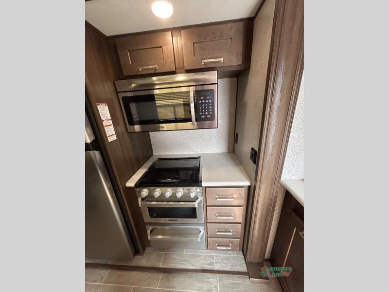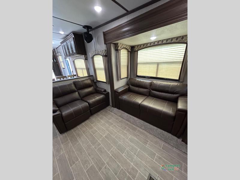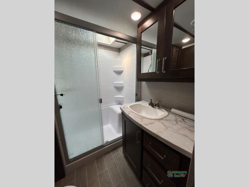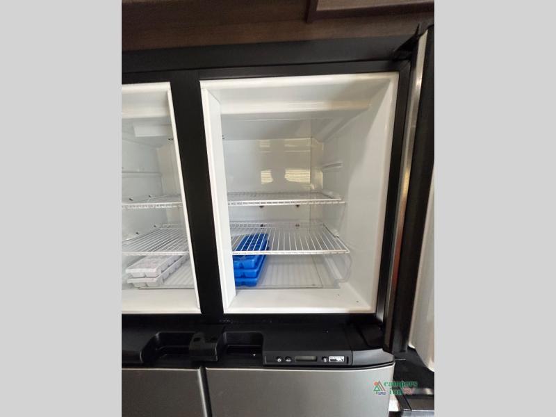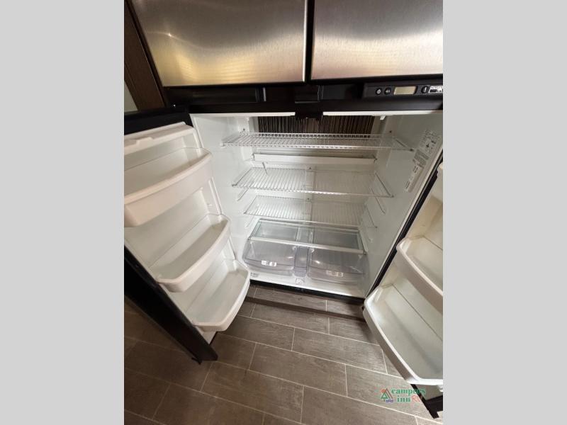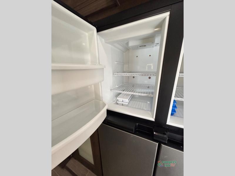 Step inside to a spacious interior featuring a full kitchen, comfortable living area, and abundant storage. The kitchen comes equipped with residential appliances, ample counter space, and cabinetry, making it easy to prepare meals while traveling. The living space is perfect for relaxing, featuring cozy seating, entertainment options, and large windows to enjoy scenic views from your campsite.
