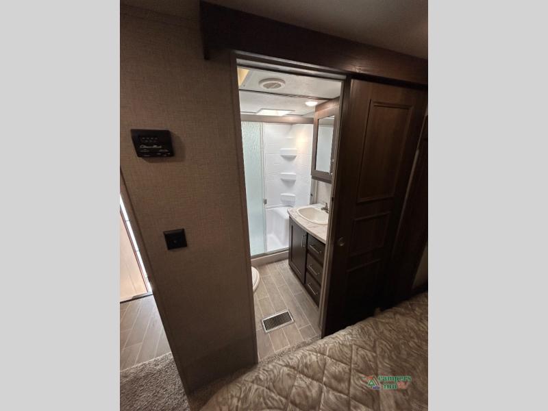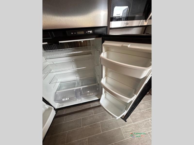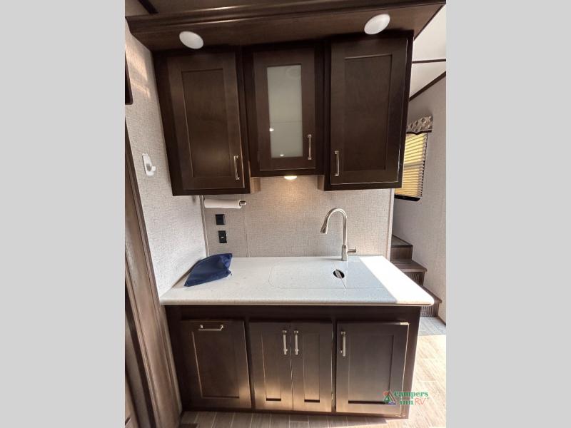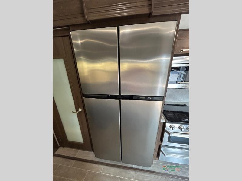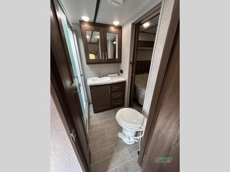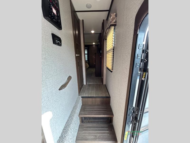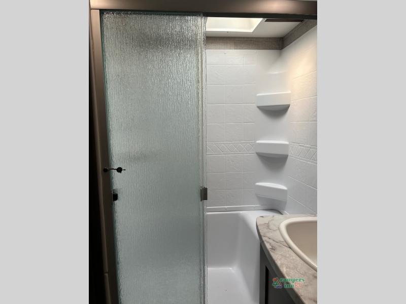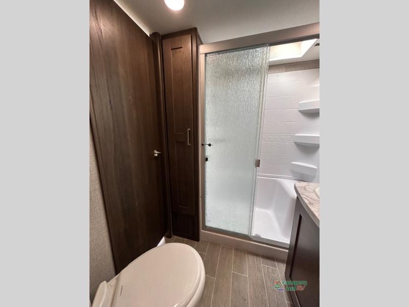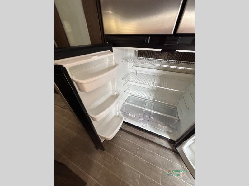 Step inside to a spacious interior featuring a full kitchen, comfortable living area, and abundant storage. The kitchen comes equipped with residential appliances, ample counter space, and cabinetry, making it easy to prepare meals while traveling. The living space is perfect for relaxing, featuring cozy seating, entertainment options, and large windows to enjoy scenic views from your campsite.