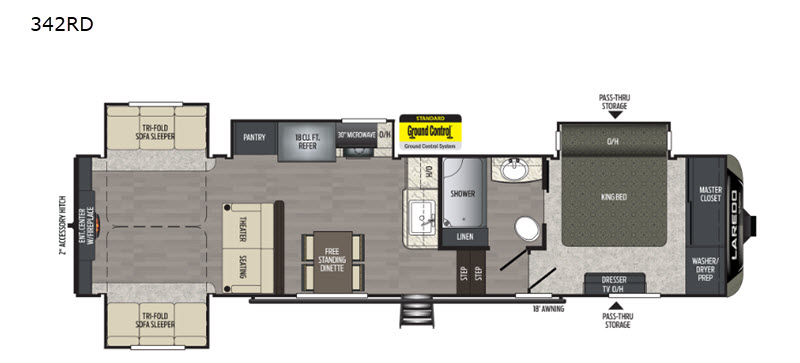 The Laredo 342RD also shines outdoors with power awnings, exterior storage compartments, and easy access to all your gear. Built with Keystone’s reputation for durability and craftsmanship, this model is ready to handle every adventure with confidence and style.
